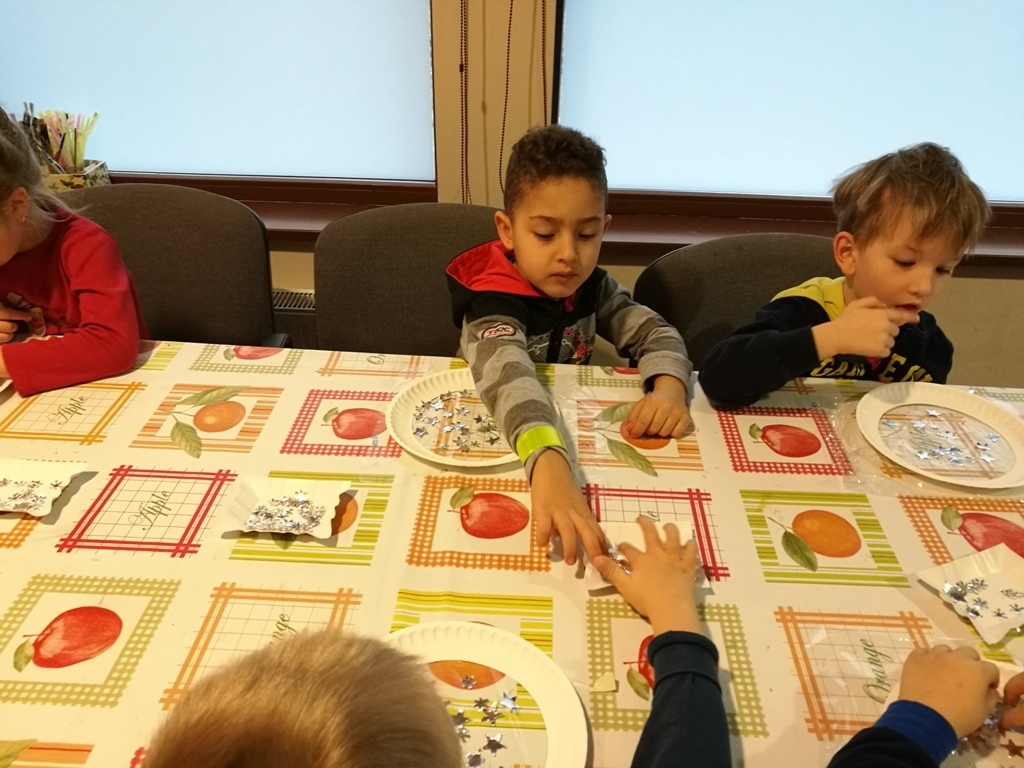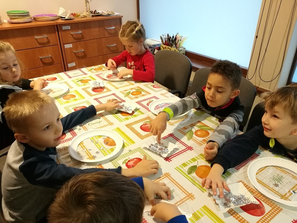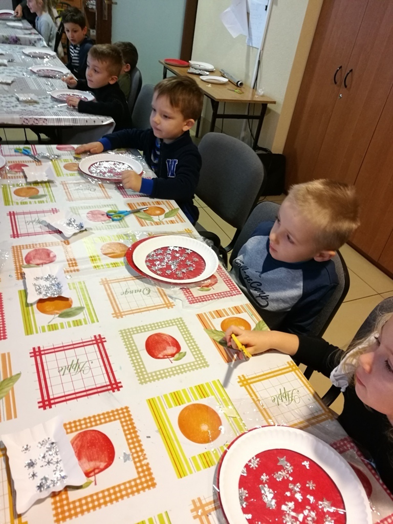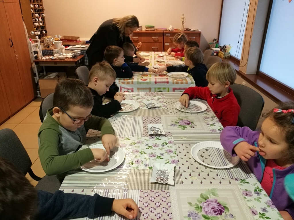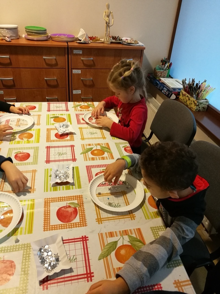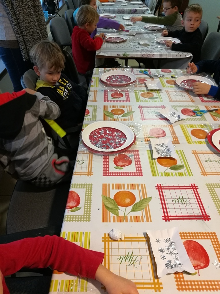 Tygryski wraz ze starszymi kolegami wybraliśmy się do Muzeum Zabawek w Karpaczu na świąteczne warsztaty plastyczne. Zaraz po przyjeździe na miejscu nasze dzieci zabrały się do pracy. Każdy otrzymał papierowy talerzyk ze specjalnie przygotowaną folię i małe gwiazdki wycięte z folii aluminiowej. Naszym zadaniem było ułożenie fantazyjnych wzorów z dostępnych materiałów. Po zakończonej pracy, każdy z nas miał zrobiony odświętny, wyjątkowy talerzyk, który w sam raz pasuje na wigilijny stół. Następnie wraz z panią przewodniczką udaliśmy się na zwiedzanie wystawy. Już dawno nie widzieliśmy w jednym miejscu, tak dużej ilości zabawek. Z wielkim zainteresowaniem oglądaliśmy zgromadzone eksponaty i wysłuchaliśmy ich historii. Podziwialiśmy zabawki z różnych zakątków świata. Były one wykonane z rozmaitych materiałów, od drewna i metału po wosk i ceramikę. Po tak przeżytym dniu - pełni wrażeń wracaliśmy do przedszkola wciąż rozmawiając o oglądanych zabawkach.