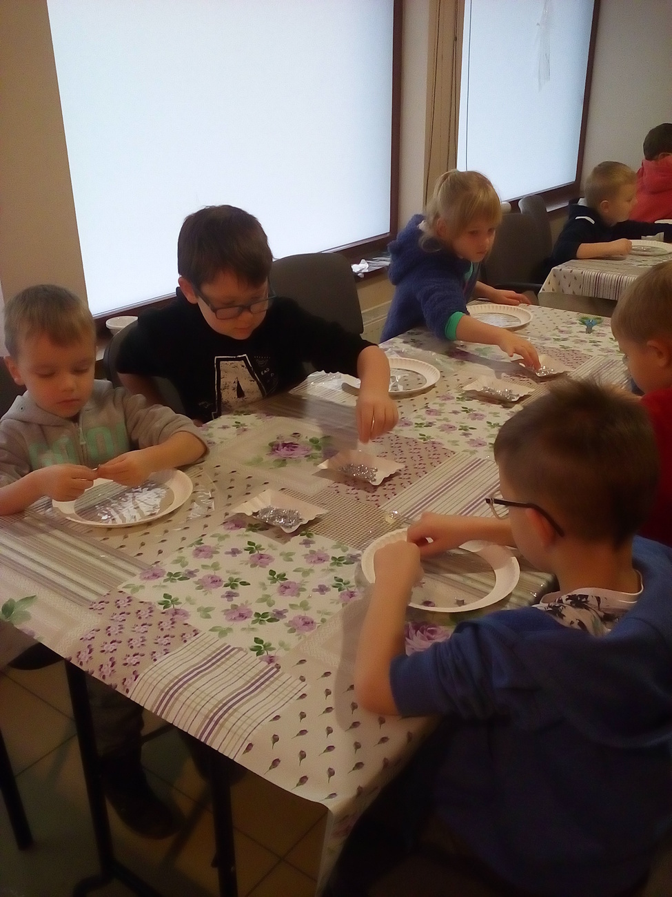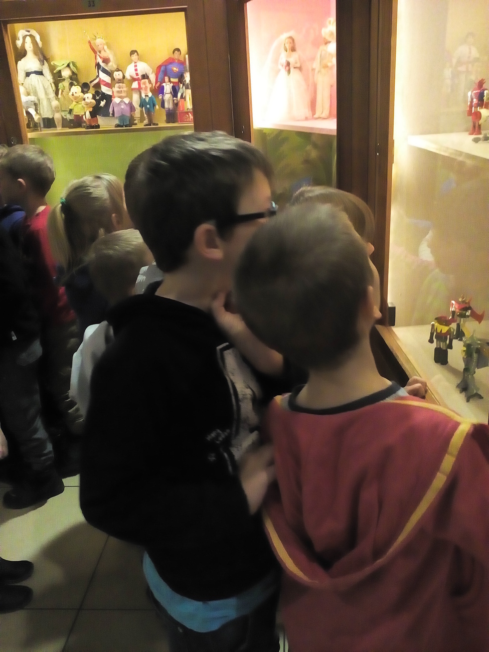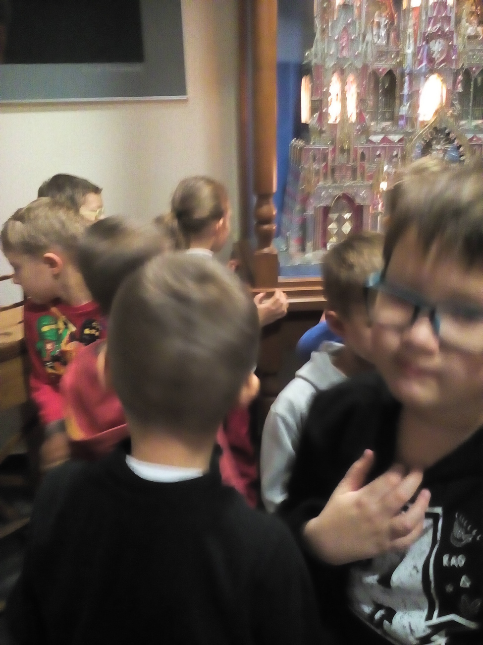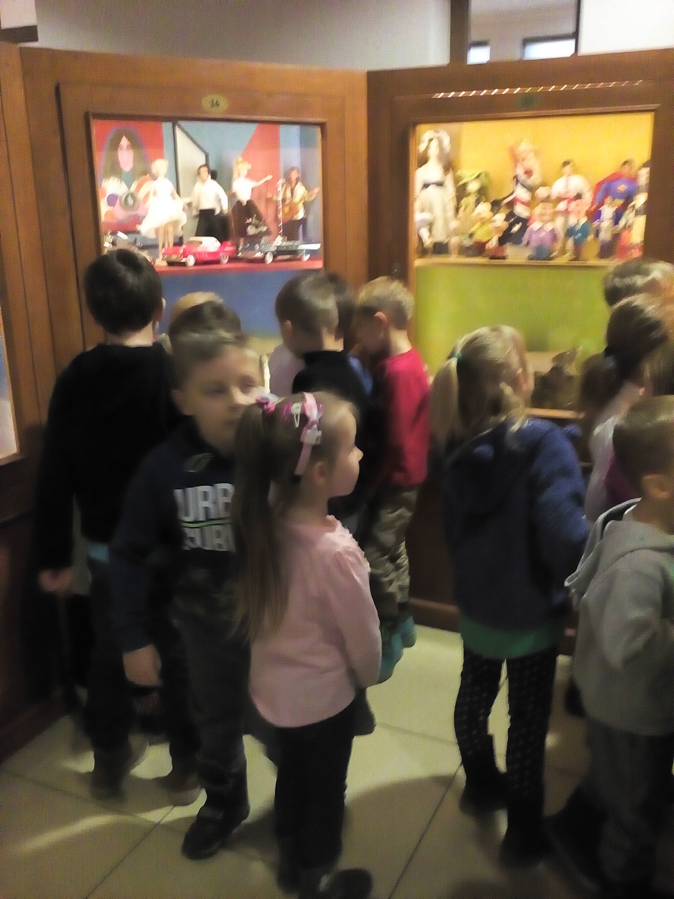 Tygryski wraz ze starszymi kolegami wybraliśmy się do Muzeum Zabawek w Karpaczu na świąteczne warsztaty plastyczne. Zaraz po przyjeździe na miejscu nasze dzieci zabrały się do pracy. Każdy otrzymał papierowy talerzyk ze specjalnie przygotowaną folię i małe gwiazdki wycięte z folii aluminiowej. Naszym zadaniem było ułożenie fantazyjnych wzorów z dostępnych materiałów. Po zakończonej pracy, każdy z nas miał zrobiony odświętny, wyjątkowy talerzyk, który w sam raz pasuje na wigilijny stół. Następnie wraz z panią przewodniczką udaliśmy się na zwiedzanie wystawy. Już dawno nie widzieliśmy w jednym miejscu, tak dużej ilości zabawek. Z wielkim zainteresowaniem oglądaliśmy zgromadzone eksponaty i wysłuchaliśmy ich historii. Podziwialiśmy zabawki z różnych zakątków świata. Były one wykonane z rozmaitych materiałów, od drewna i metału po wosk i ceramikę. Po tak przeżytym dniu - pełni wrażeń wracaliśmy do przedszkola wciąż rozmawiając o oglądanych zabawkach.