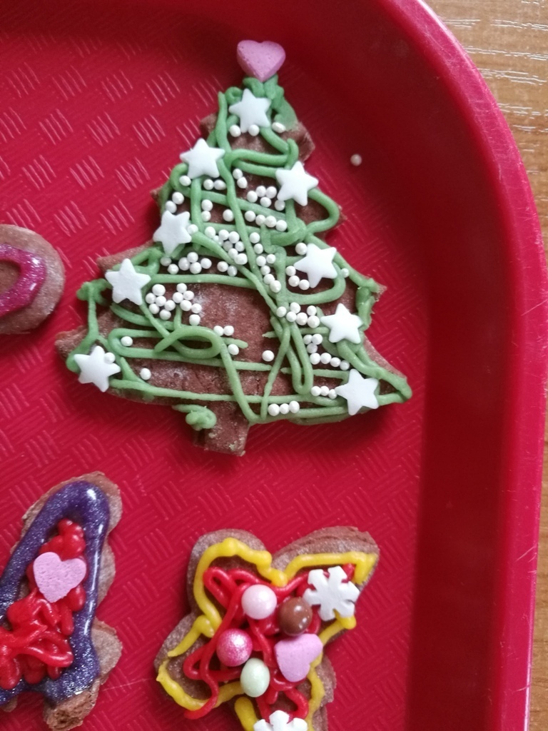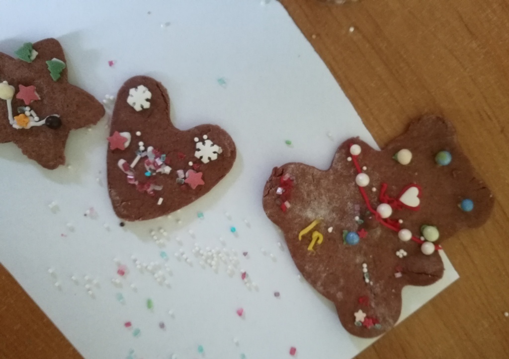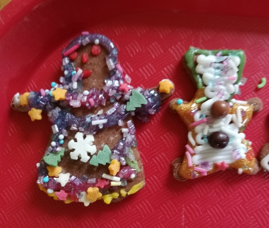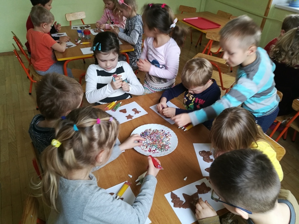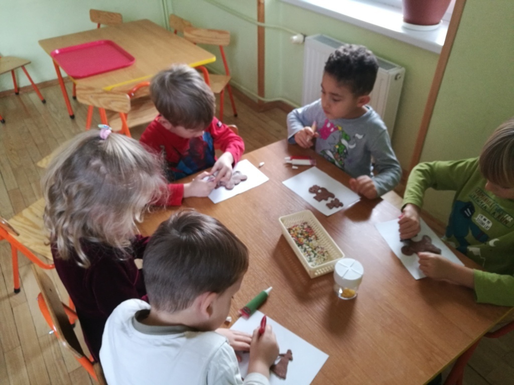 Wielkimi krokami zbliżają się święta Bożego Narodzenia, w naszym przedszkolu. Już za kilka dni uniosą się świąteczne zapachy. W dniu dzisiejszym Tygryski dekorowały pierniki, które przygotowaliśmy kilka dni wcześniej. Na początku pracy rozłożyliśmy na stołach wszystkie lukrowane dekoracje przyniesione przez rodziców. Stoły, aż się mieniły od gwiazdek, kolorowych kamyczków, perełek i lukrowanych pisaków. Dzieci z wielką radością zabrały się do pracy. Zaczęły powstawać fantazyjne choinki, kolorowe misie i gwiazdki, błyszczące śnieżynki. Wszystkie przedszkolaki były zachwycone swoimi pierniczkami, najtrudniejszą rzeczą okazało się powstrzymanie się od jedzenia tych pyszności, gdyż przygotowane one zostały, specjalnie na przedszkolną wigilię. Na szczęście mogliśmy się pocieszyć kilkoma lukrowanymi ozdobami, które w tajemniczy sposób zniknęły ze stołów.