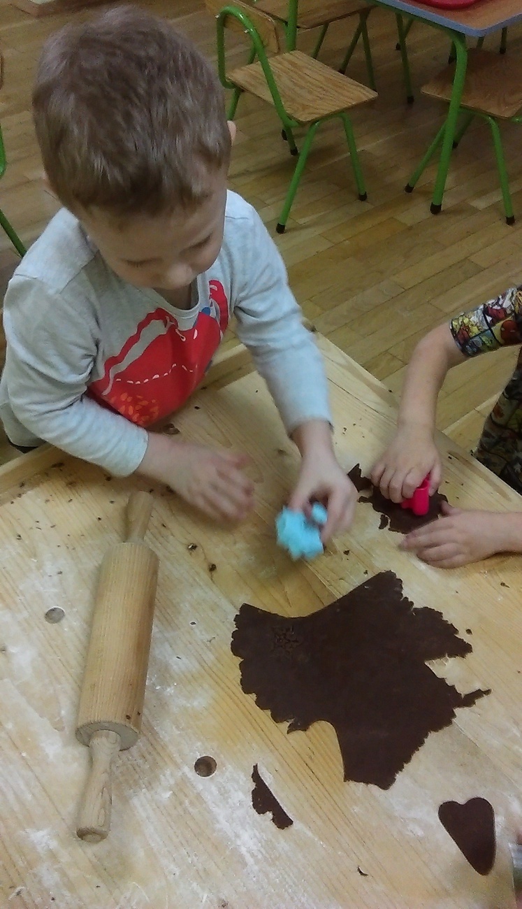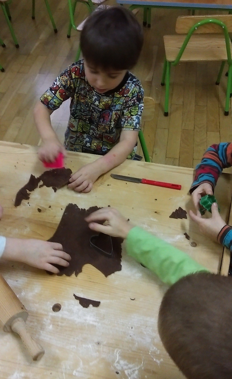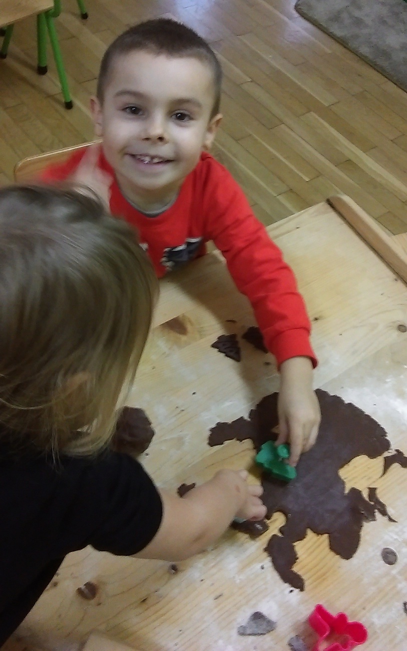 I dlatego też, w dniu 16.12.2016 r. czekała na nas w przedszkolu niespodzianka. W tym dniu piekliśmy nasze grupowe pierniczki, które przed wigilią przedszkolną będziemy mogli dekorowac samymi słodkościami. Pani wyjaśniła nam jak mamy wycinać w cieście różne kształty i w którym miejscu mamy je odkładać. A do wyboru mieliśmy: gwiazdki, choinki i aniołki. Sami wybieraliśmy i wycinaliśmy wzory.