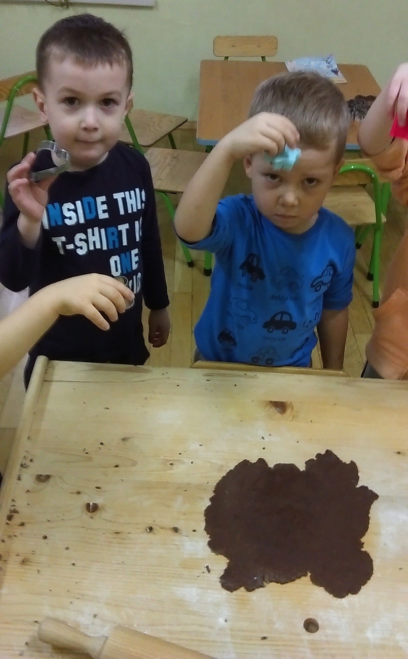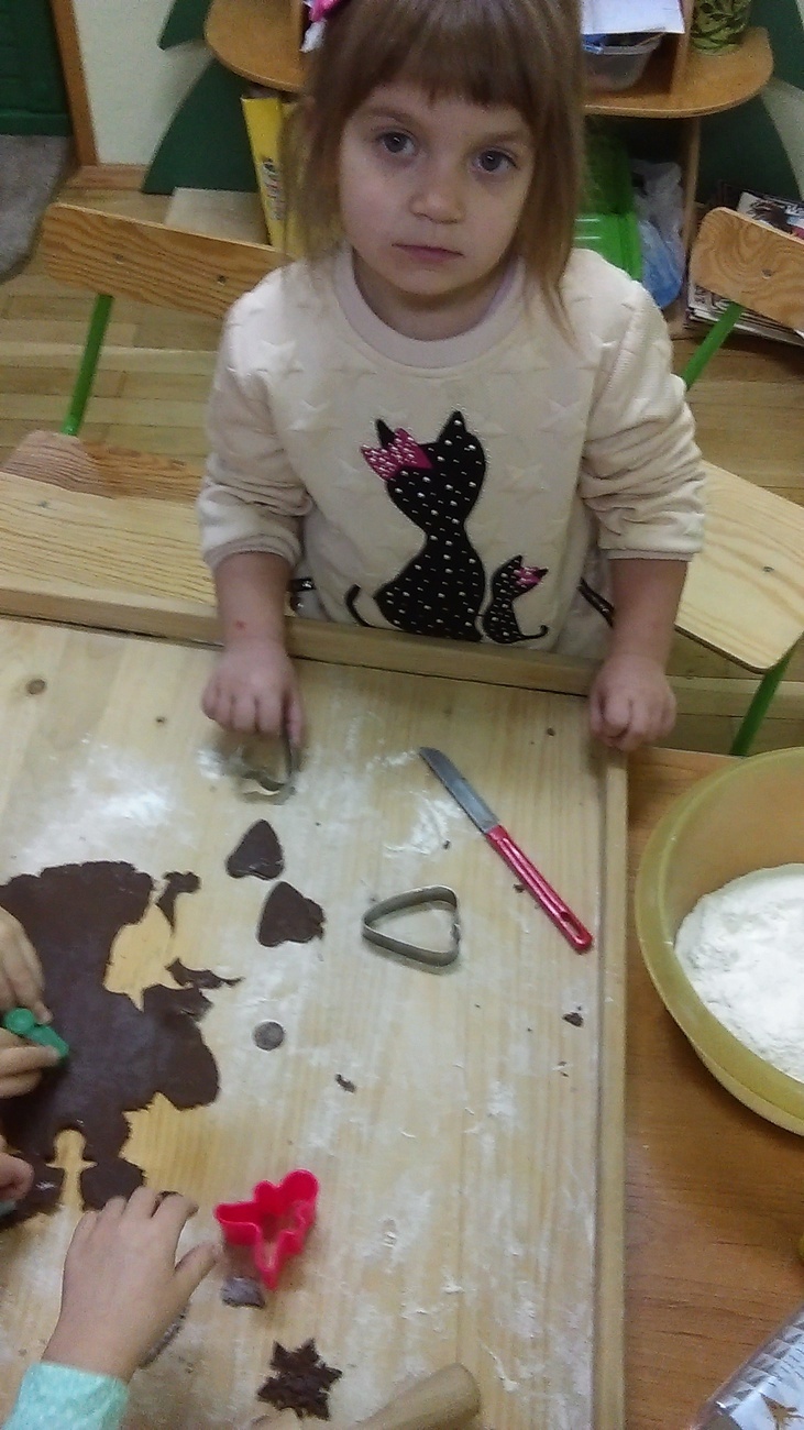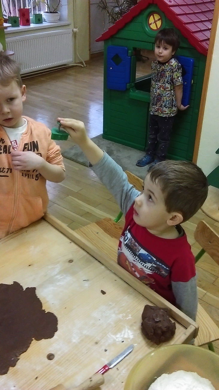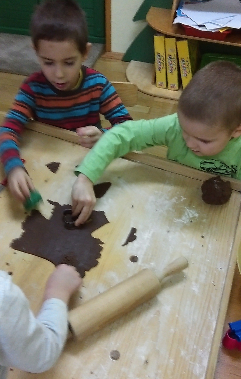 I dlatego też, w dniu 16.12.2016 r. czekała na nas w przedszkolu niespodzianka. W tym dniu piekliśmy nasze grupowe pierniczki, które przed wigilią przedszkolną będziemy mogli dekorowac samymi słodkościami. Pani wyjaśniła nam jak mamy wycinać w cieście różne kształty i w którym miejscu mamy je odkładać. A do wyboru mieliśmy: gwiazdki, choinki i aniołki. Sami wybieraliśmy i wycinaliśmy wzory.