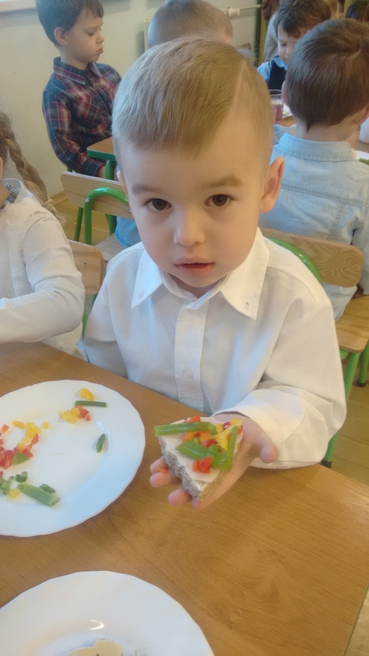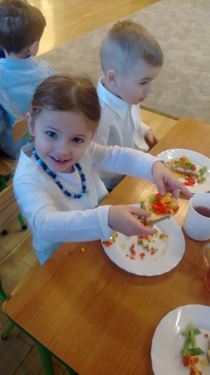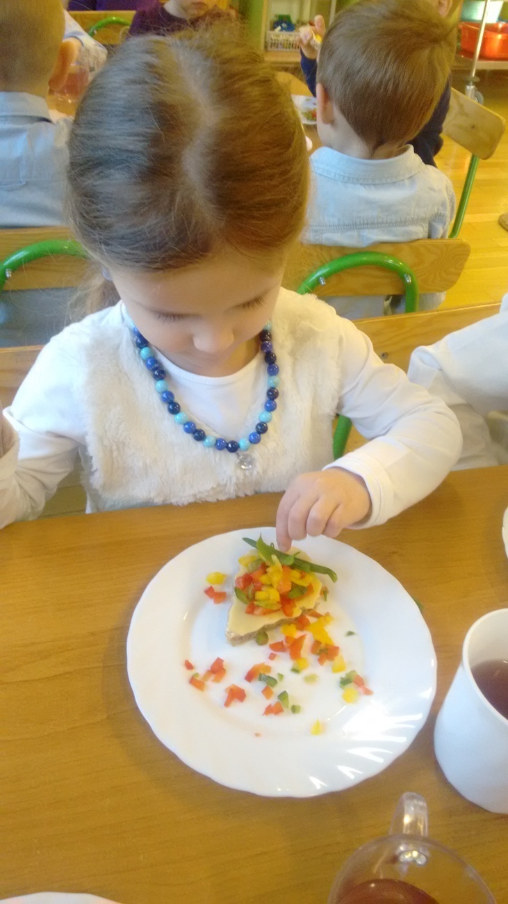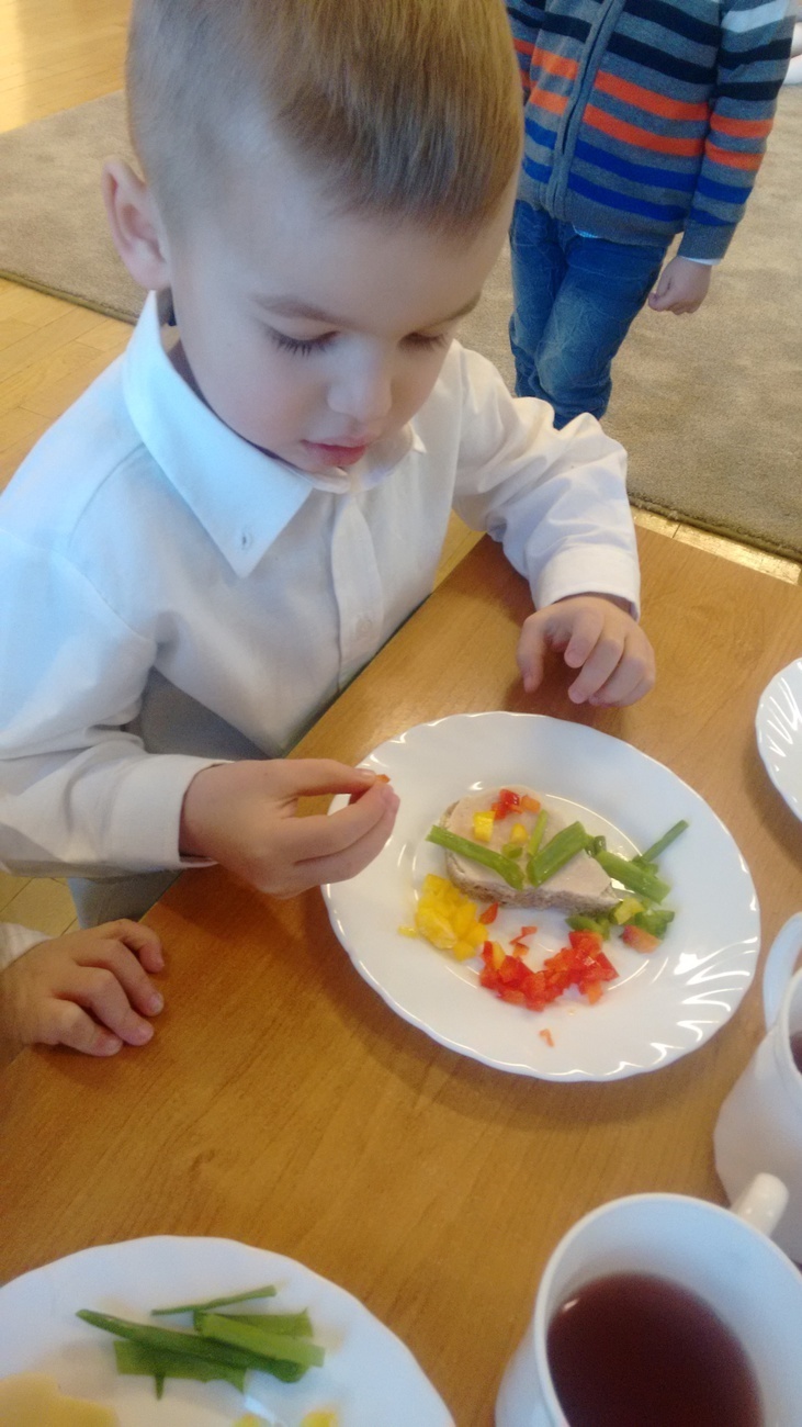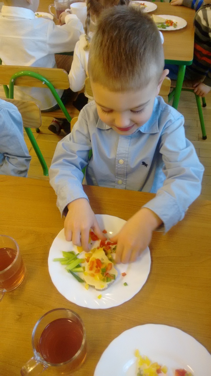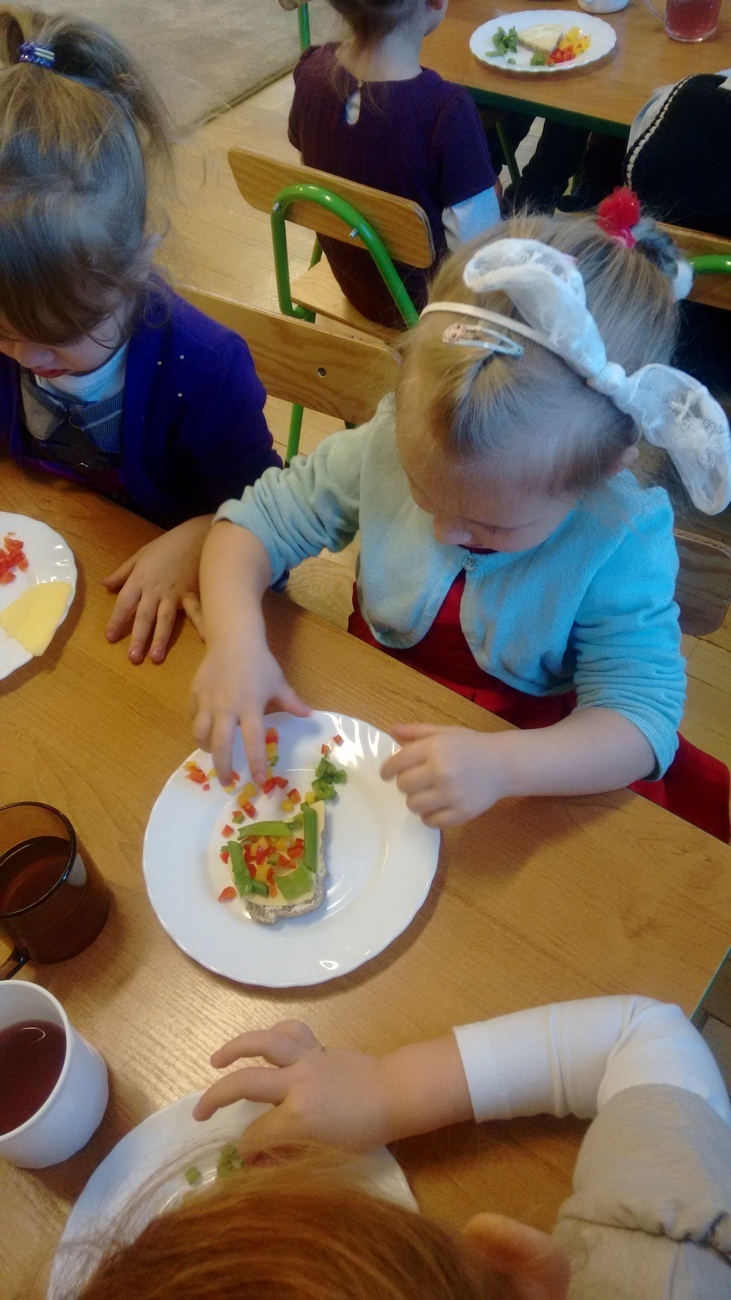 W dzień przedszkolnej wigilii dzieci dekorowały świąteczne kanapki w kształcie choinek. Smykom sprawiło to wielką radość. Choineczki „wyszły” kolorowe i wprowadziły dzieci w świąteczny nastrój.