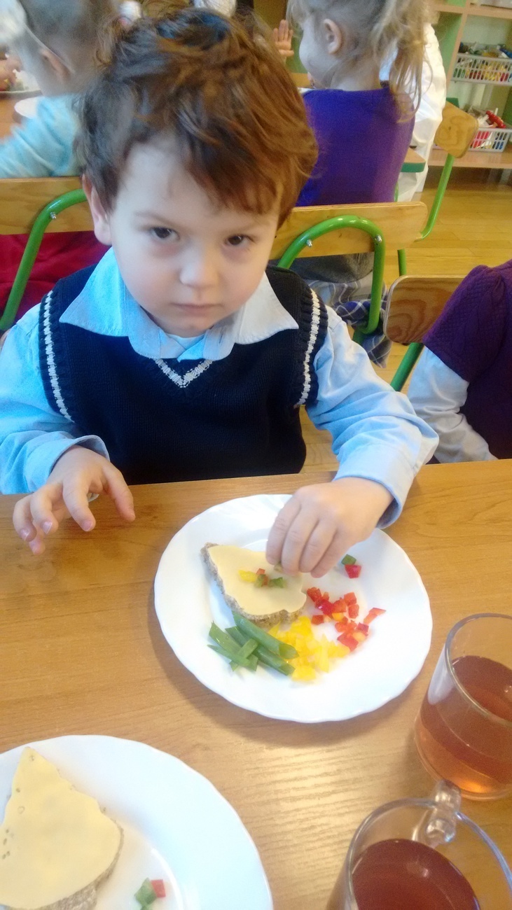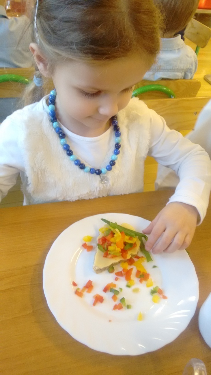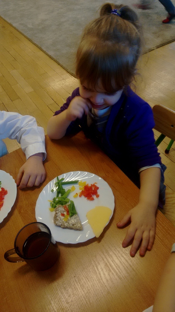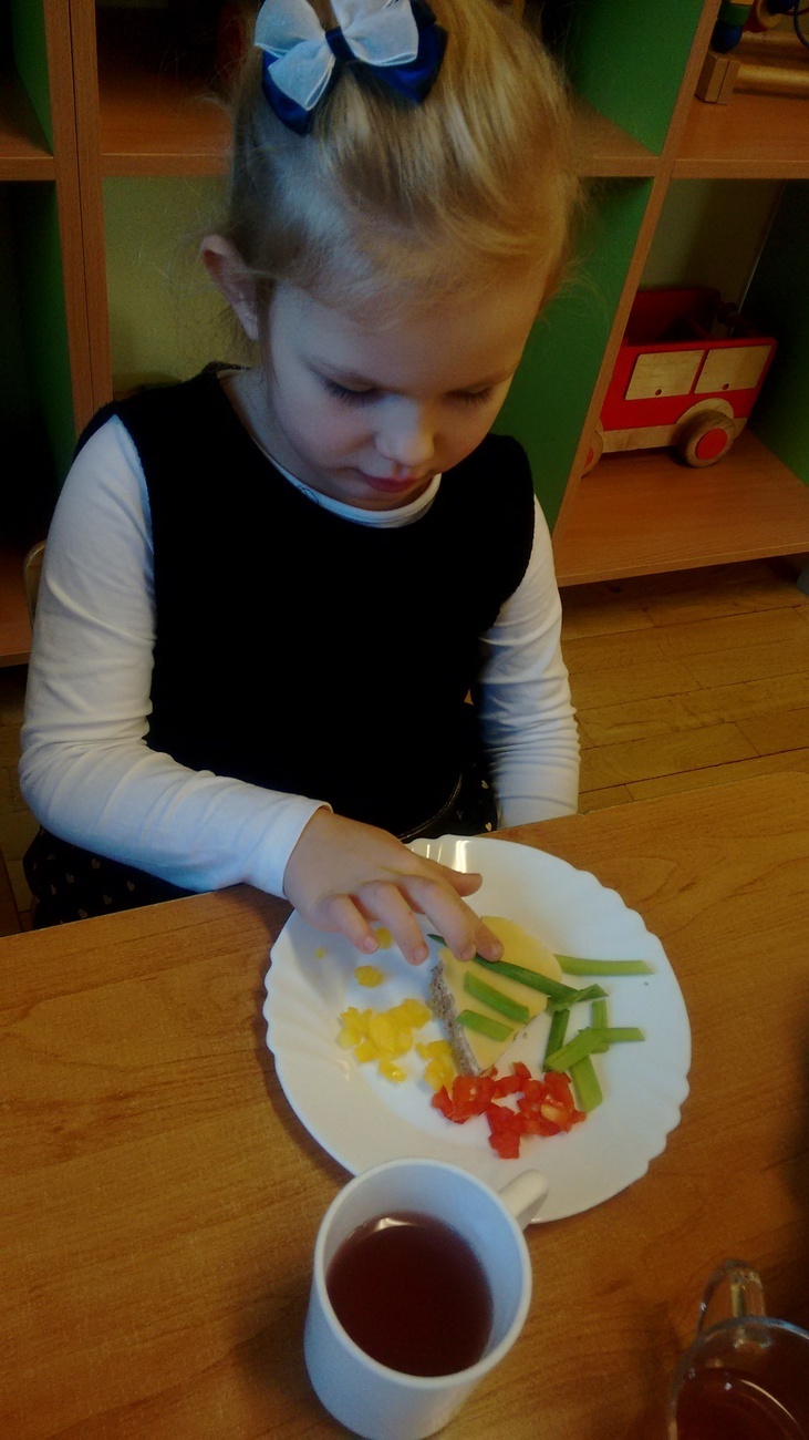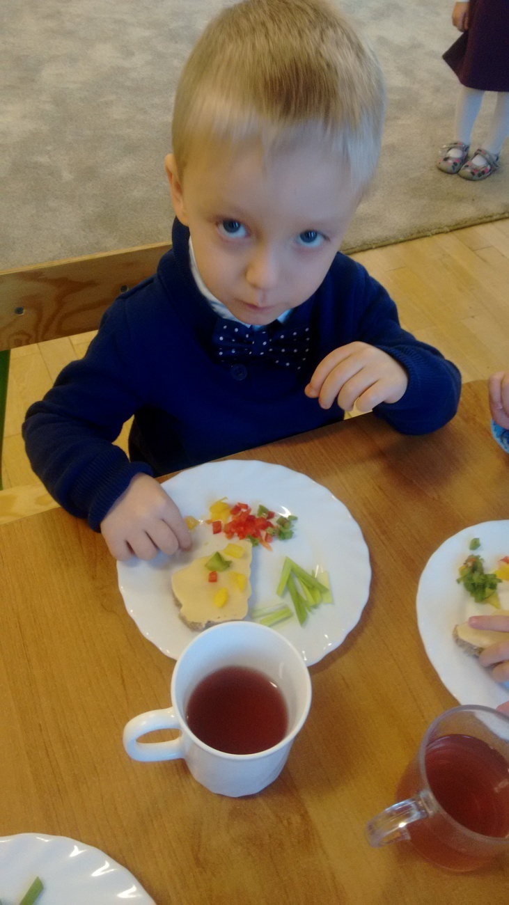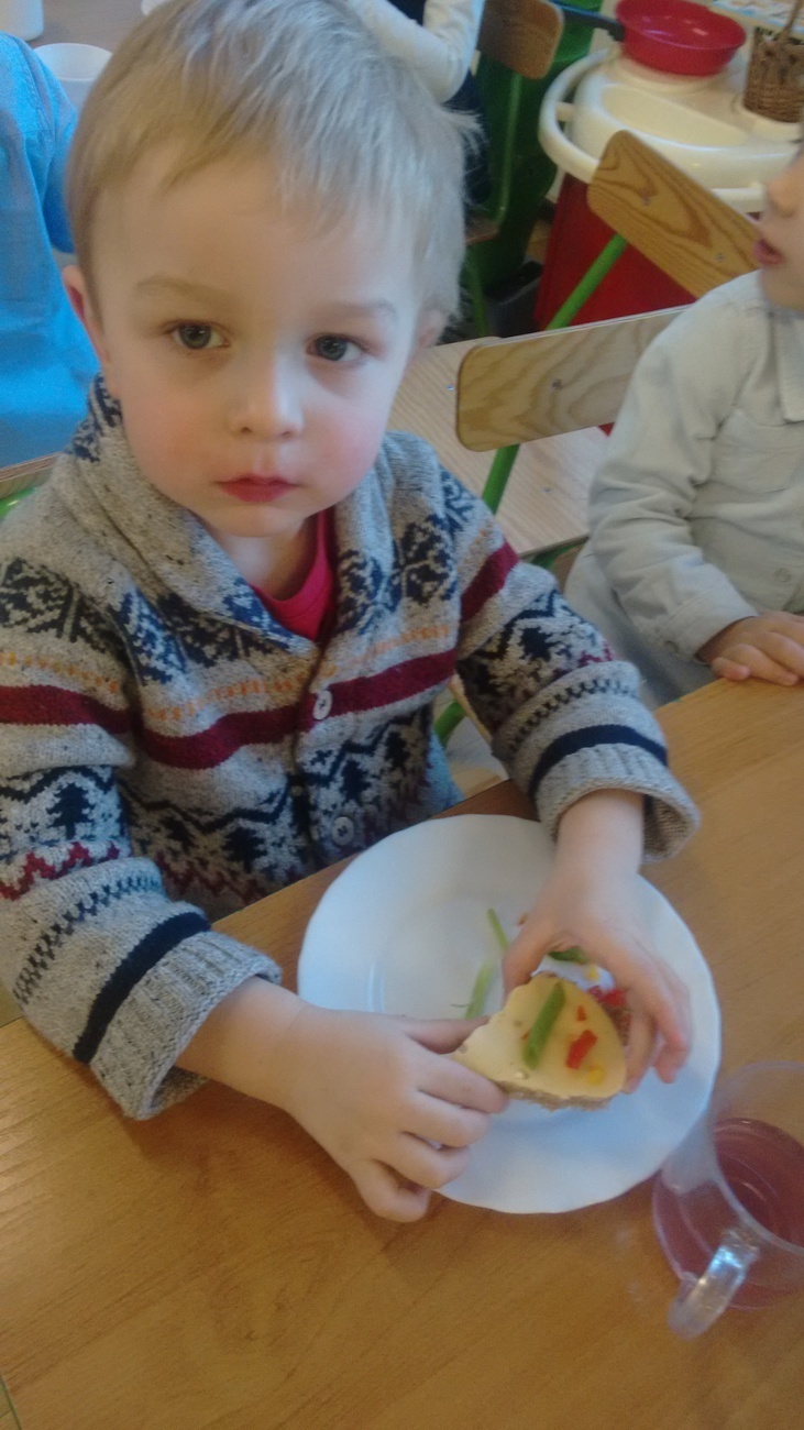 W dzień przedszkolnej wigilii dzieci dekorowały świąteczne kanapki w kształcie choinek. Smykom sprawiło to wielką radość. Choineczki „wyszły” kolorowe i wprowadziły dzieci w świąteczny nastrój.