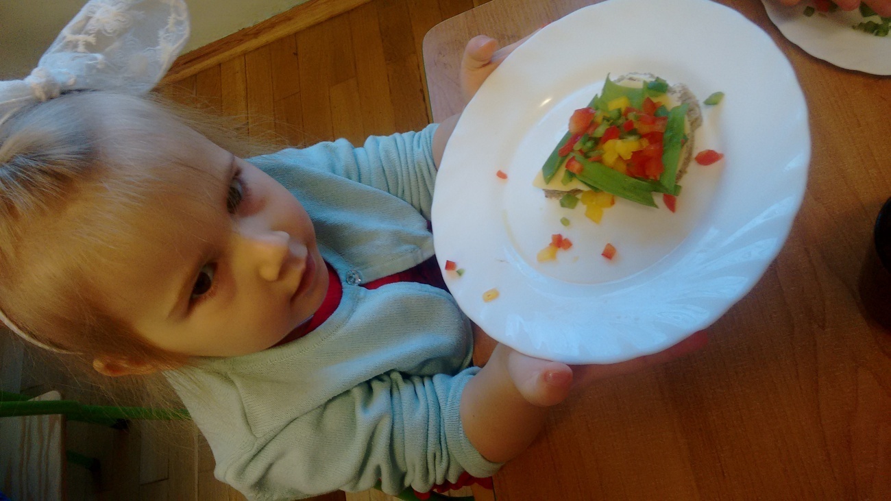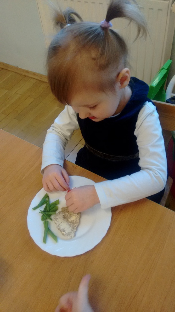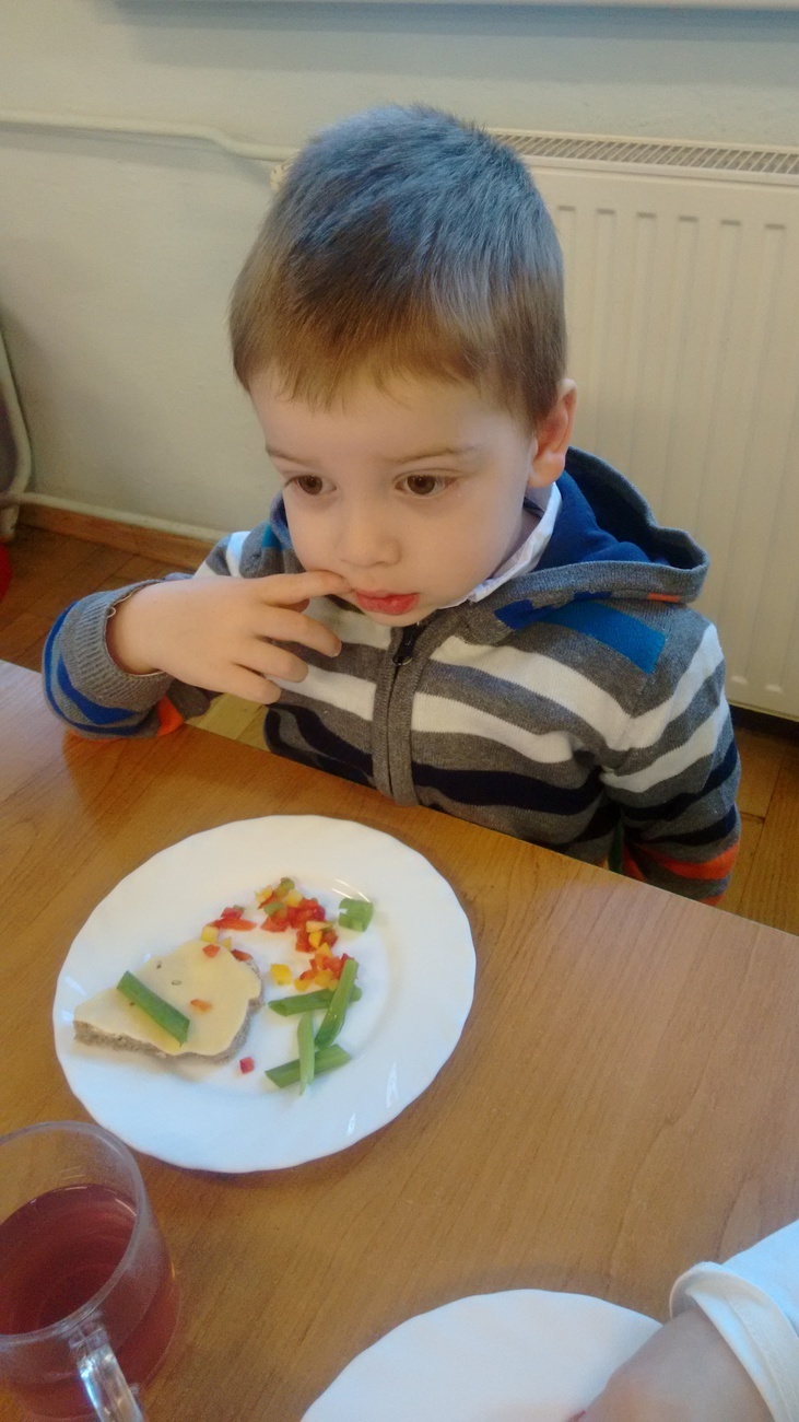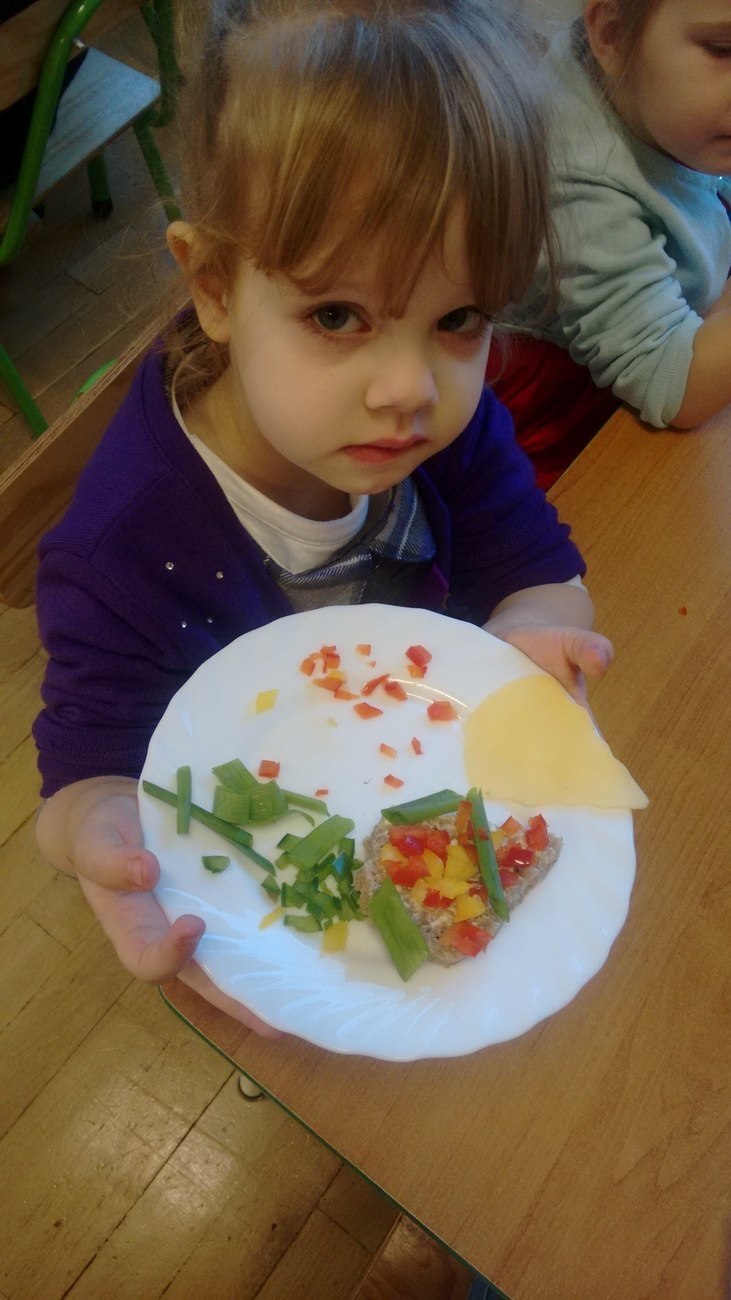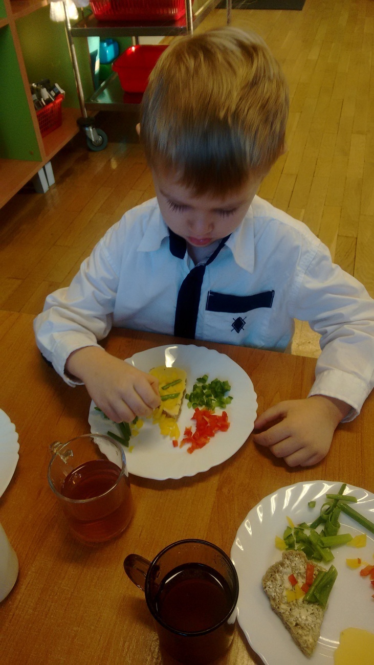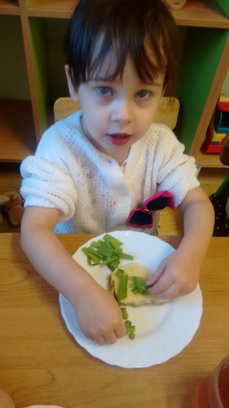 W dzień przedszkolnej wigilii dzieci dekorowały świąteczne kanapki w kształcie choinek. Smykom sprawiło to wielką radość. Choineczki „wyszły” kolorowe i wprowadziły dzieci w świąteczny nastrój.