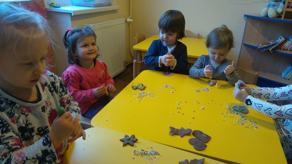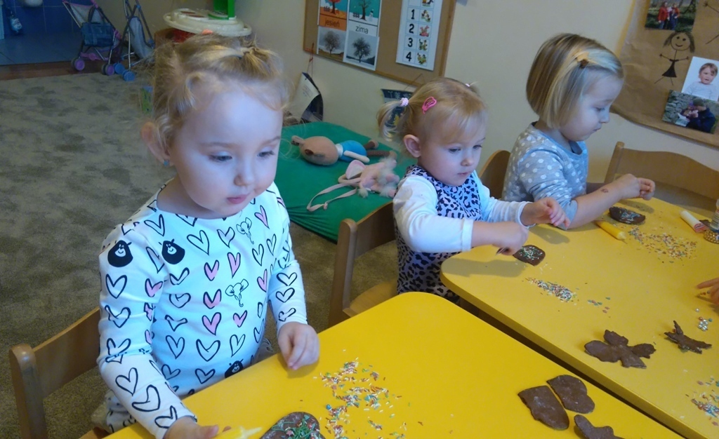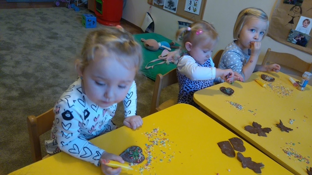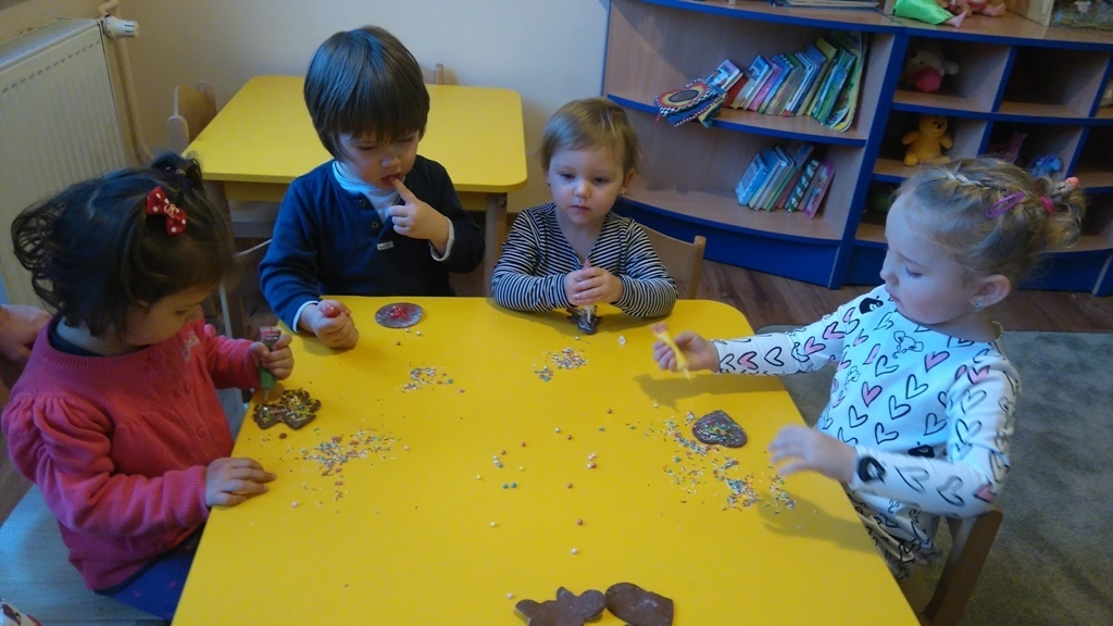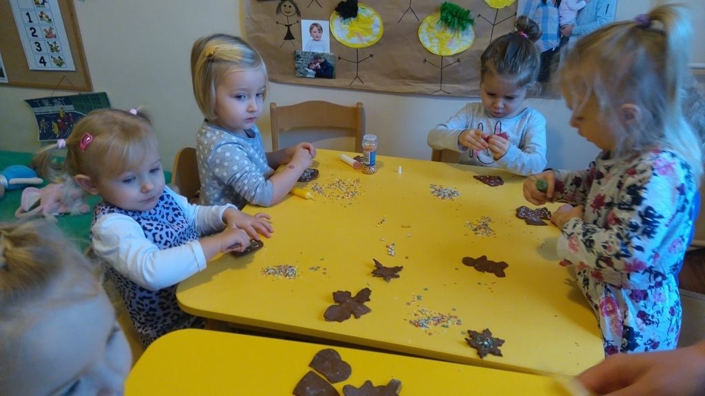 Tego dnia nie mogliśmy doczekać się najbardziej. Pierniki po upieczeniu już wyglądały pysznie, a słodkie ozdoby, którymi dekorowaliśmy ciastka dodały im uroku. Oczywiście wielokrotnie próbowaliśmy każdego smaku, bo wszystko było bardzo smakowite. Kiedy już wszystko udekorowaliśmy pani Natalia schowała nasze ciastka do pudełka i wyciągnie je na naszym uroczystym przedszkolnym dniu Wigilijnym.