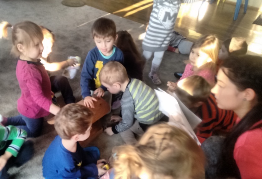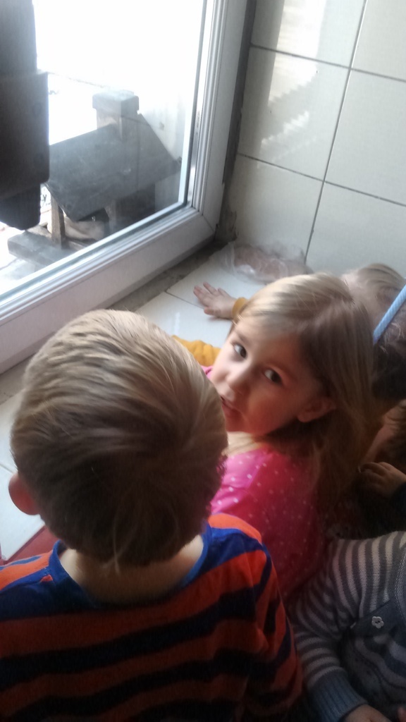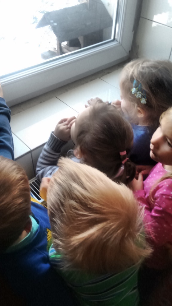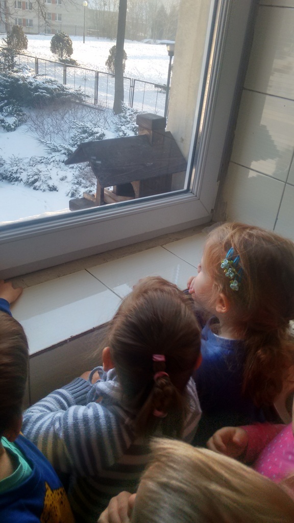 Podczas zajęć dzieci dowiedziały się jak wygląda, do czego służy i z jakich elementów składa się karmnik. Z przyjemnością zawiesiły słoninke dla ptaszków i obserwowały czy jakieś głodne ptaszki ich odwiedzą.