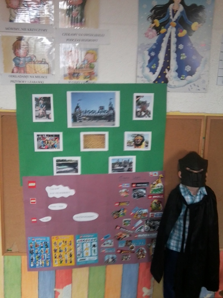 Następnie Nikodem przebrany za tajemniczą postać, opowiedział nam o swoim ulubionym zajęciu, czyli budowaniu z klocków lego. W trakcie tej prezentacji dowiedzieliśmy się wielu ciekawych rzeczy, nikt z nas nie wiedział, że klocki lego mają już 80 lat, poznaliśmy także nazwisko ich twórcy. Nikodem przedstawił wszystkie rodzaje klocków oraz opowiedział o swojej wycieczce do lego landu.