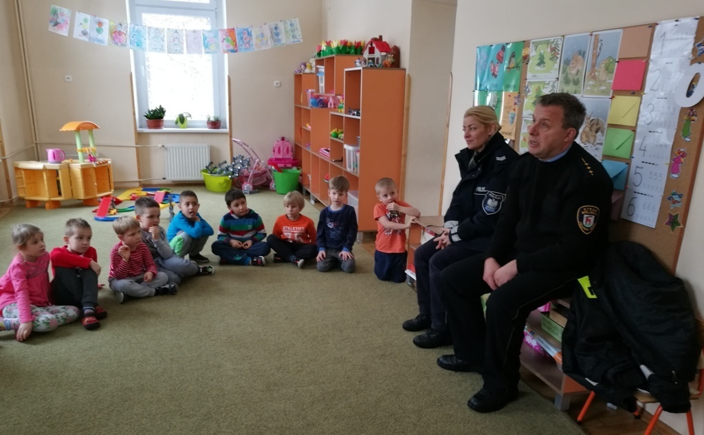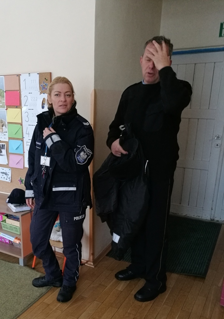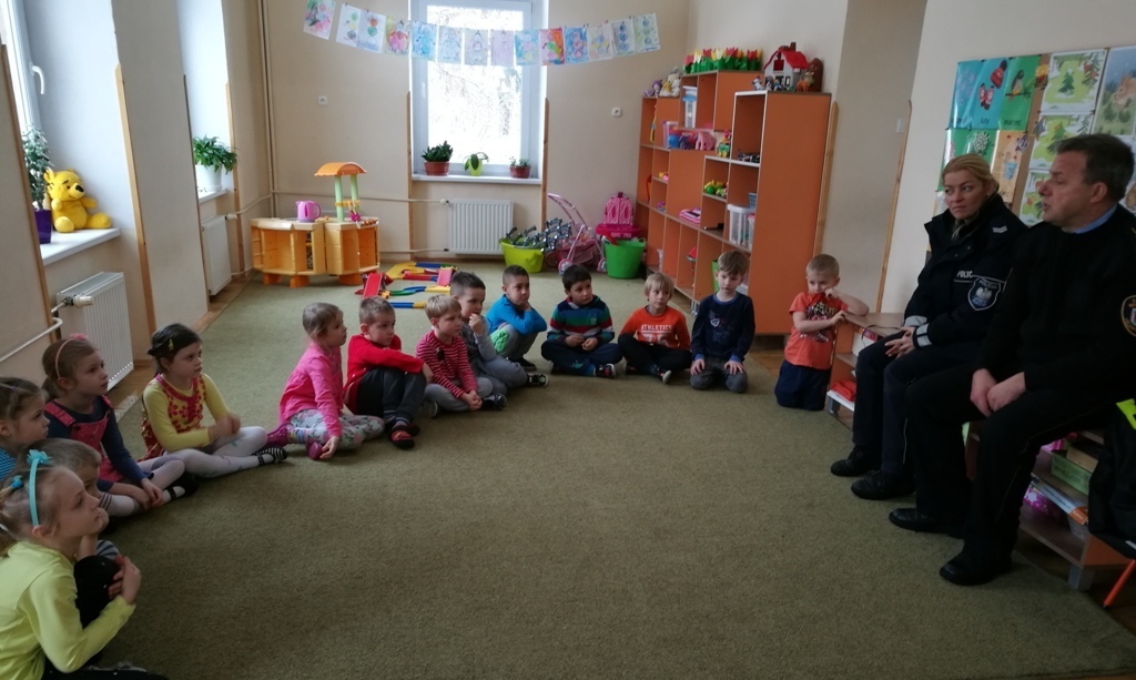17 stycznia do naszego przedszkola przyszli gości – pan Grzegorz ze Straży Miejskiej i pani Beatka z Policji. Na spotkaniu rozmawialiśmy o bezpiecznej zabawie zimą i o znakach drogowych, które spotykamy na swojej drodze. Dzieci wiedzą już jak należy się ubrać na zimowe szaleństwo na nartach czy łyżwach. Musimy również pamiętać przy sportowych wyczynach o ubieraniu kasku na głowę. Jak odpowiednio wybrać górkę do zjeżdżania na sankach i gdzie najlepiej zorganizować ślizgawki. Następnie przeszliśmy do tematu związanego ze znakami. Wspólnie omówiliśmy wszystkie te znaki, które informują o przejściach dla pieszych i jak wygląda znak stopu. Wiemy już, ze jako piesi mamy pierwszeństwo na drodze ale mimo tego musimy zachować szczególną ostrożność. Dzięki temu, że bierzemy udział w spotkaniach w ramach programu Bezpieczny Dolnoślązak wiemy coraz więcej na temat tego jak zachować się bezpiecznie w naszym mieście.