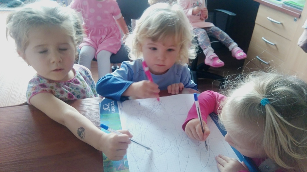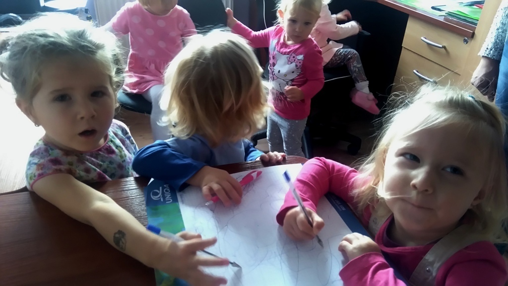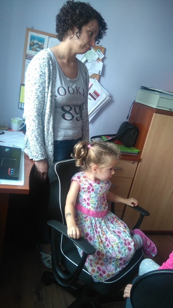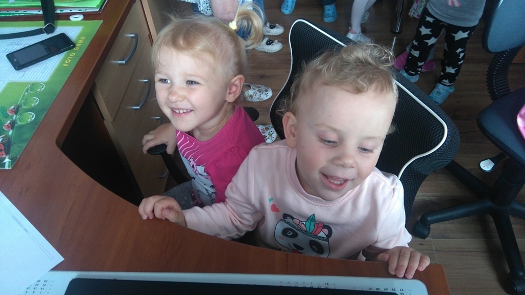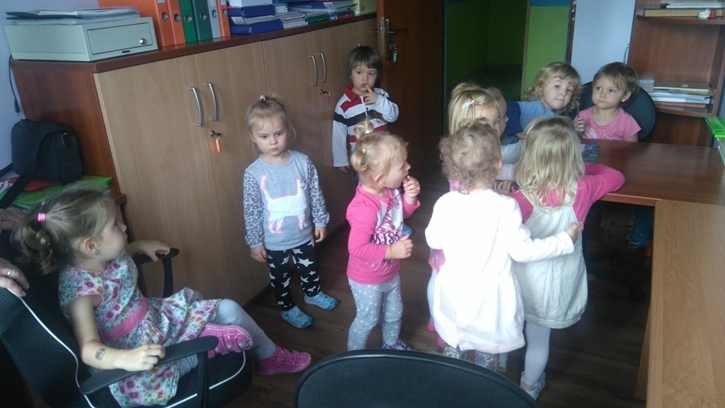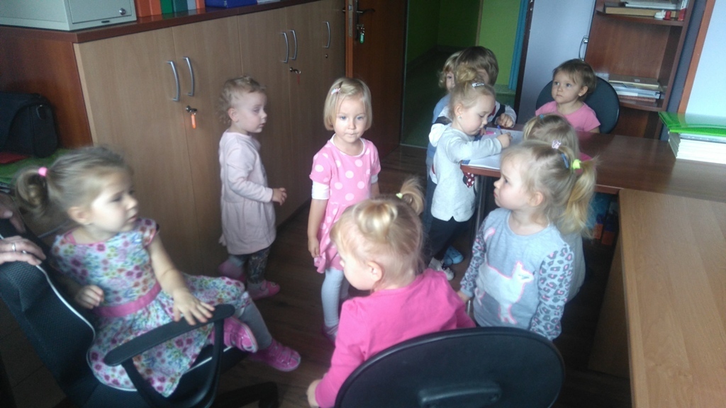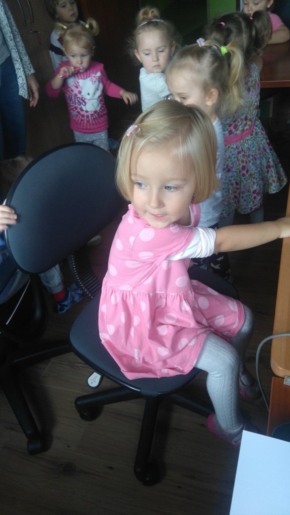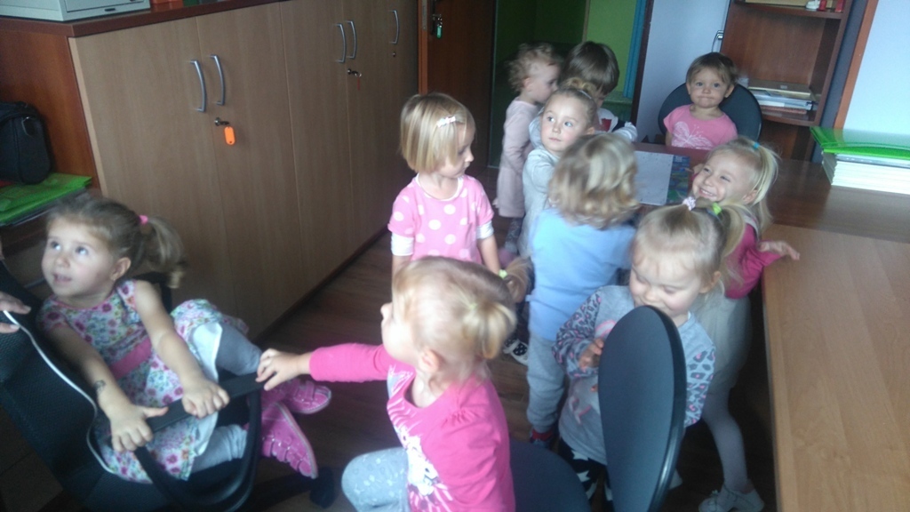 Wizyta w gabinecie pani dyrektor była fascynująca. Pani Asia pokazała nam sprzęty znajdujące się w pomieszczeniu, opowiedziała nam na czym polega praca dyrektora przedszkola. Pozwoliła nam rysować, kręcić się na krzesłach i nawet „dzwonić” do rodziców w ważnych sprawach.