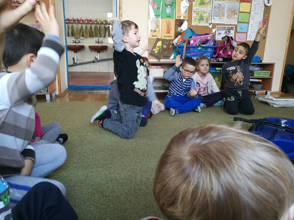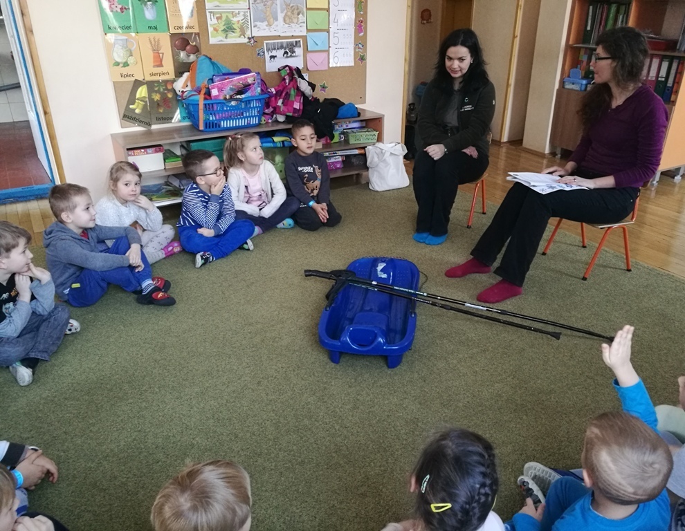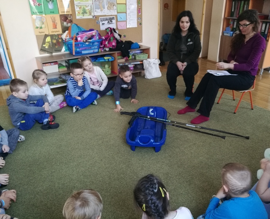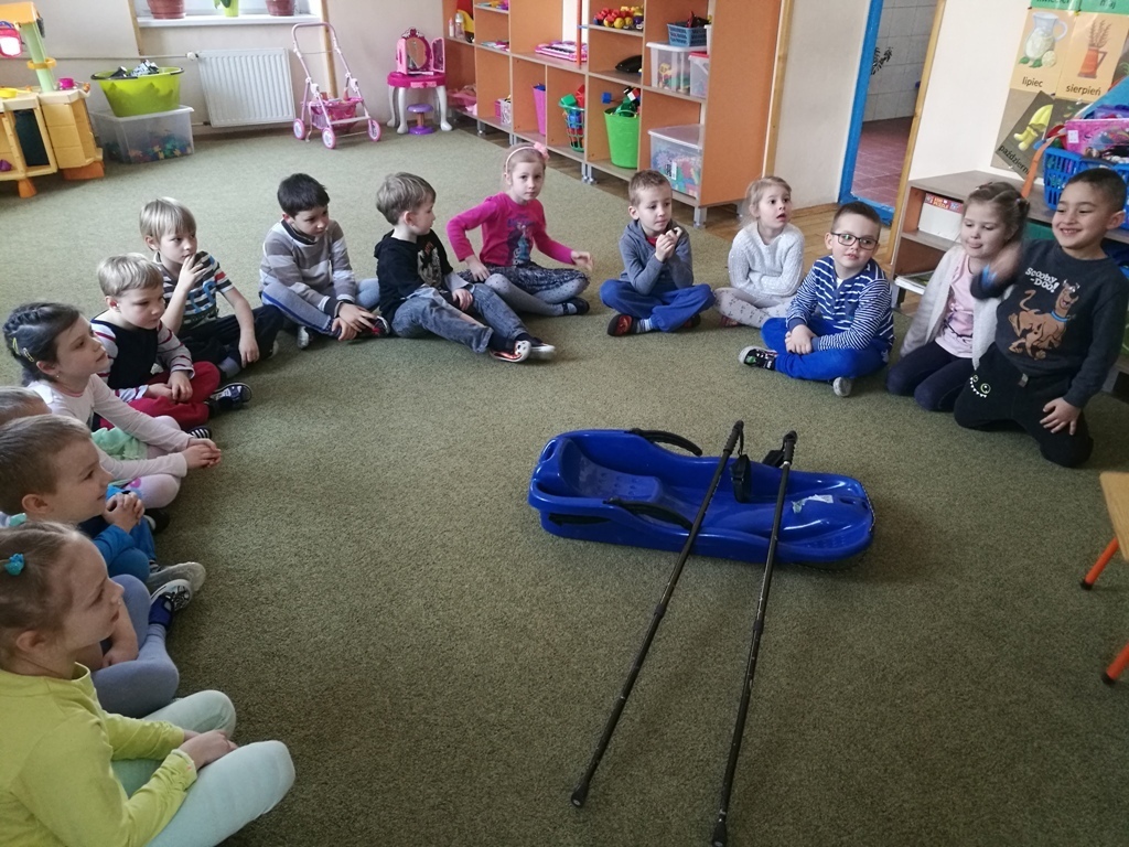 19 stycznia w grupie "Tygrysków" miały miejsce zajęcia z paniami z Karkonoskiego Parku Narodowego. Na dzisiejszym spotkaniu wymienialiśmy różne dyscypliny, które są popularne zimą. Narciarstwo, saneczkarstwo, czy też łyżwiarstwo są ulubionymi sportami dzieci, bo jak powiedziały, kojarzą się im ze świąteczną zabawą. Wspominaliśmy również oczywiście, ulubionych sportowców – Kamil Stoch i Justyna Kowalczyk to idole naszych "Tygrysków". Oglądaliśmy ciekawe ilustracje przedstawiające m.in. sanie rogate, czy też zaprzęgi sań – tzw. kulig. Nasz kolega Marcin, pokazywał jak należy przyjąć postawę podczas zjazdu na nartach natomiast wspólnie razem ćwiczyliśmy slalom. Na zakończenie zajęć wykleiliśmy śnieżne bałwanki i wpadliśmy na pomysł, że lepienie bałwana też powinno być dyscypliną sportową.