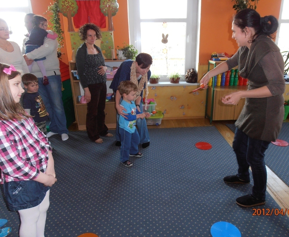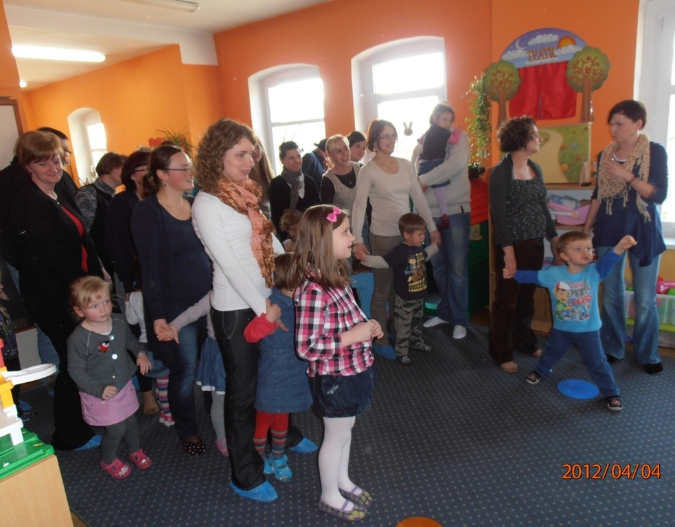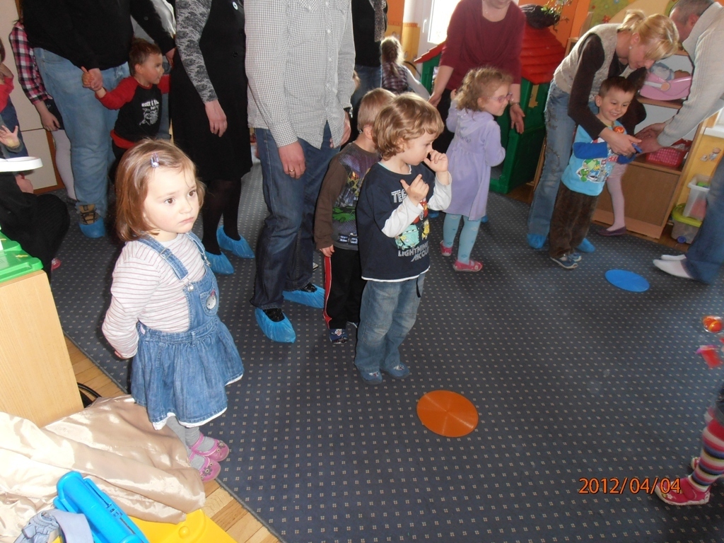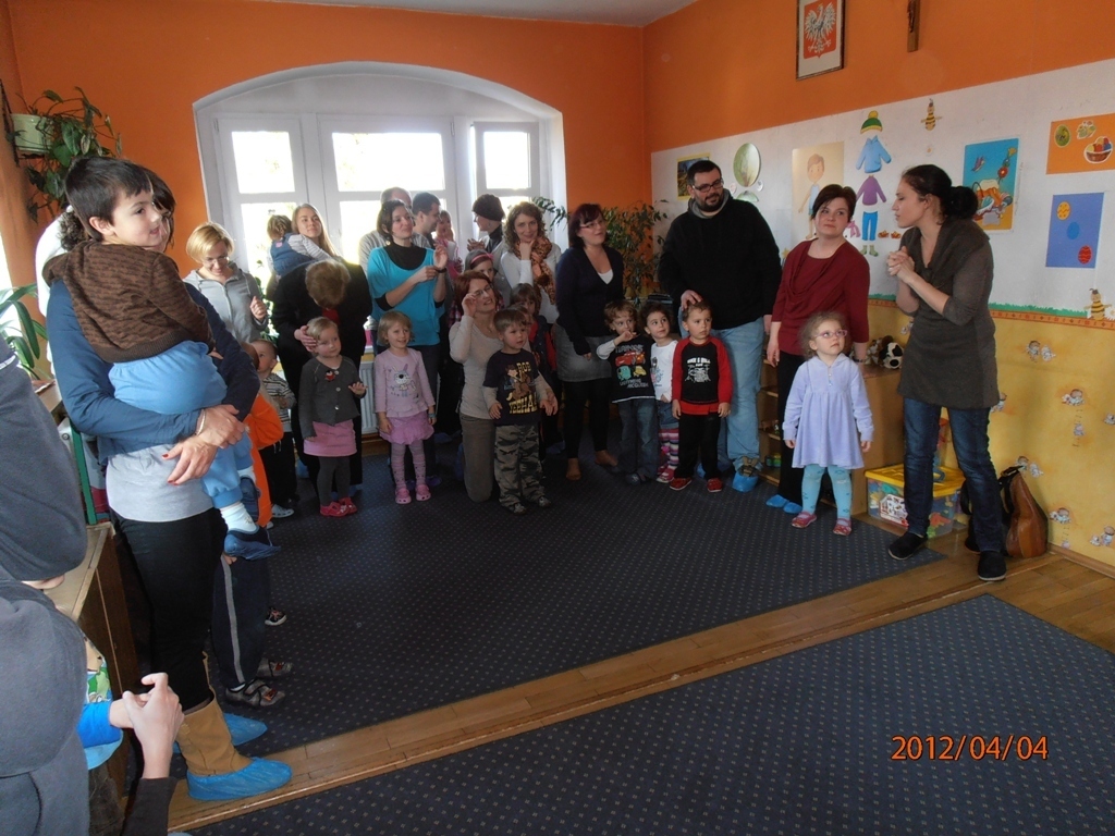 Następnie chętni rodzice i dziadkowie czytali opowiadanie pt. „Zajączek i pisanki”, wprowadzając nas w świąteczny nastrój. Z zapartym tchem słuchaliśmy tego utworu. Chwile przerwy wypełniały nam wspólne harce przy muzyce.