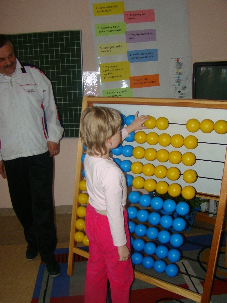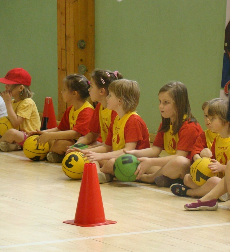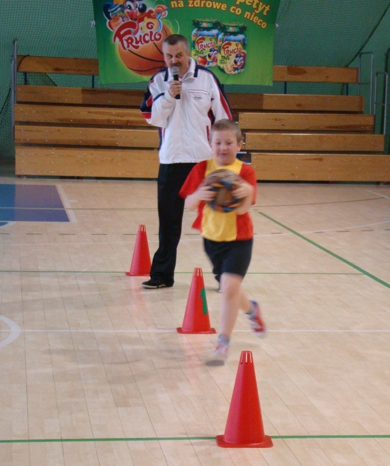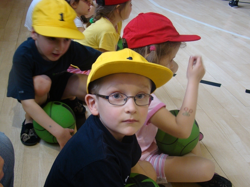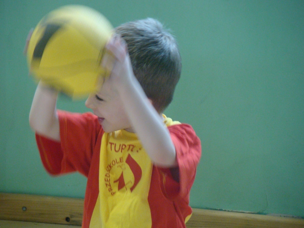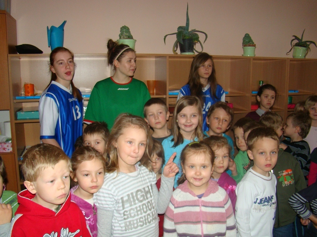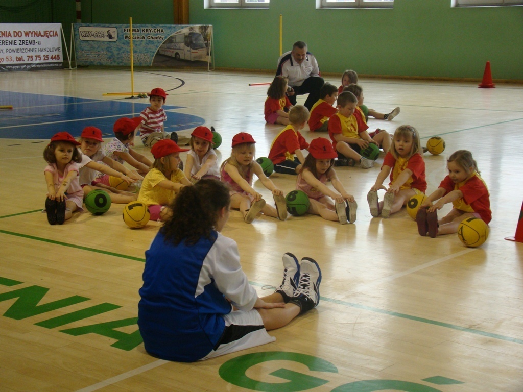 Uczestniczyliśmy w kilku konkurencjach sportowych, w których to mogliśmy wykazać się sprytem, refleksem i zwinnością. Prowadziliśmy piłkę za pomocą kija hokejowego, skakaliśmy na gumowych skoczkach, kozłowaliśmy piłki do kosza. Nie zabrakło również pokazu profesjonalnych umiejętności w wykonaniu młodych koszykarek. Z podziwem patrzyliśmy na ich sportowe wyczyny z piłką, które zachwyciły naszych przedszkolaków. Mogliśmy także z bliska obejrzeć puchary i medale zdobyte przez drużynę podczas meczów koszykówki.