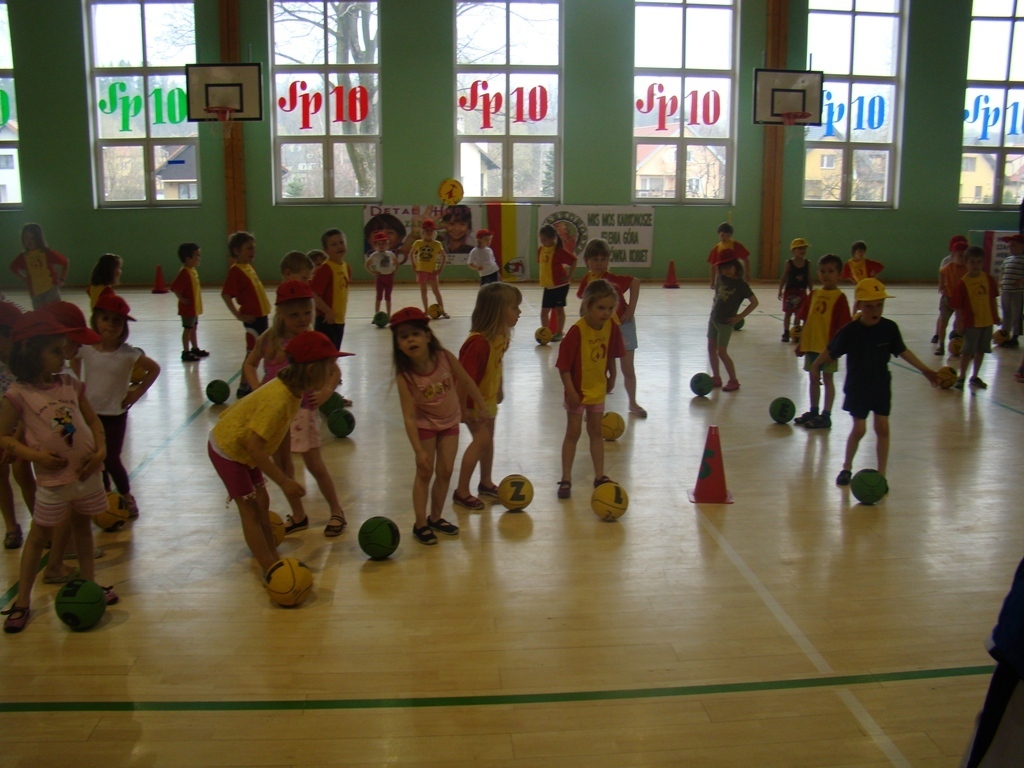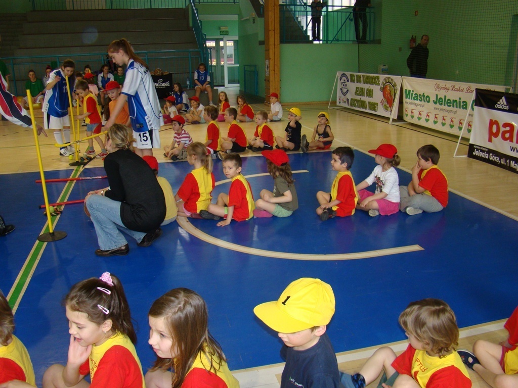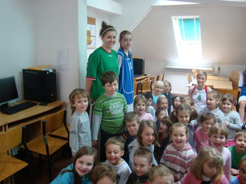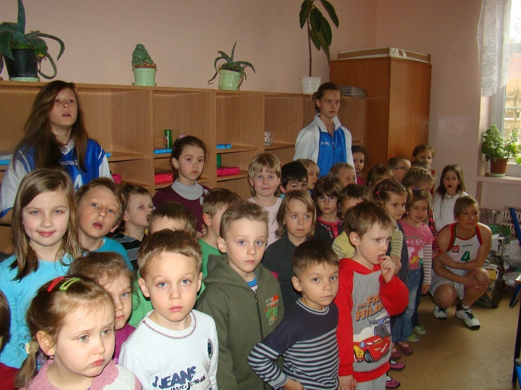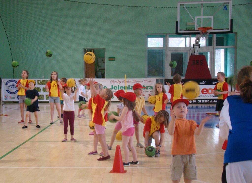 Na początku naszej wizyty - dzieci zwiedziły szkołę w tym min.: sale klas I, II i III, sale komputerowe i gimnastyczne. W jednej z sal mieliśmy okazje skonstruować budowle z dużych przestrzennych figur geometrycznych. Po skończonej zabawie udaliśmy się do szatni by przebrać się w stroje gimnastyczne. Gdy wszyscy byli już gotowi, marszowym krokiem weszliśmy na halę sportową, gdzie czekały na nas zawodniczki z klubu Karkonosze oraz organizatorzy i sponsorzy wielkanocnej imprezy. Po uroczystym przywitaniu i krótkiej rozgrzewce rozpoczęliśmy naszą przygodę z koszykówką.