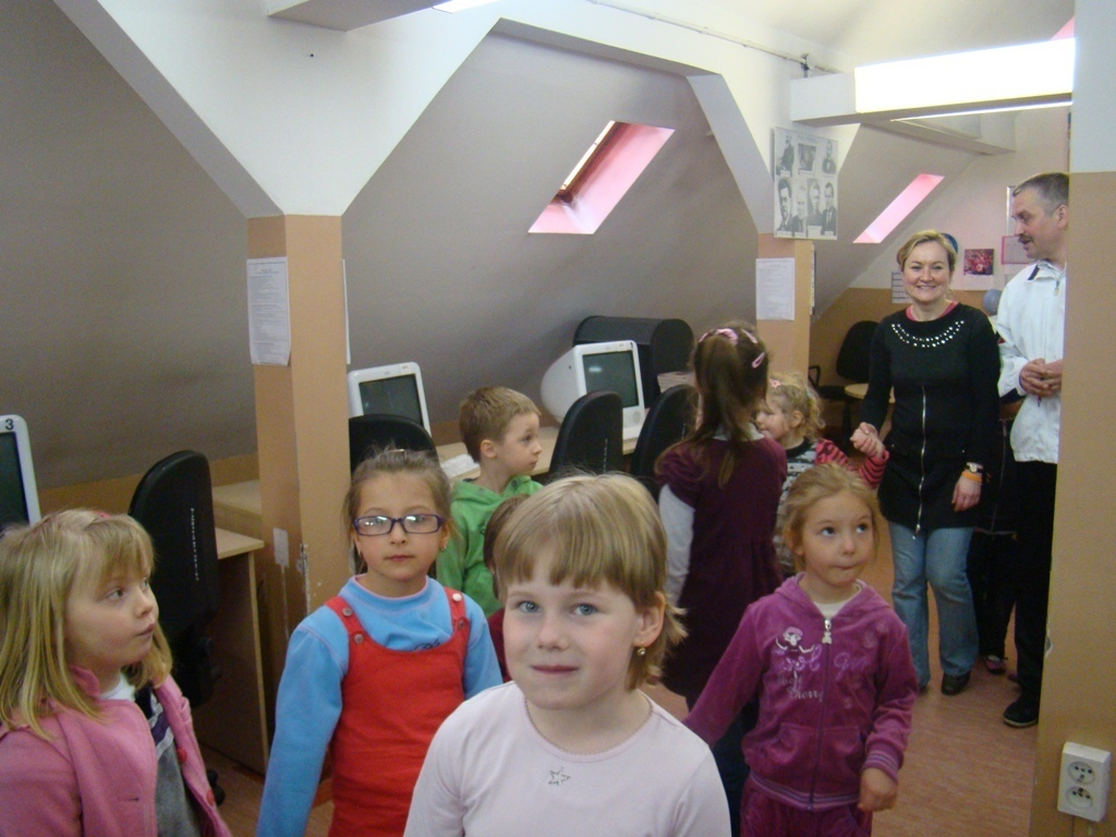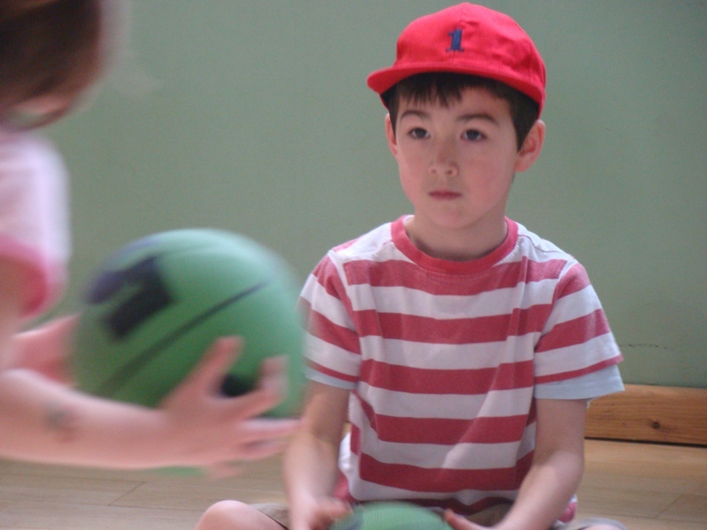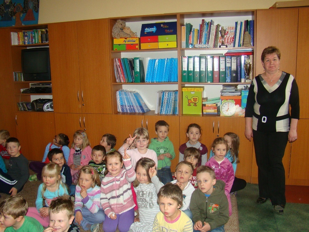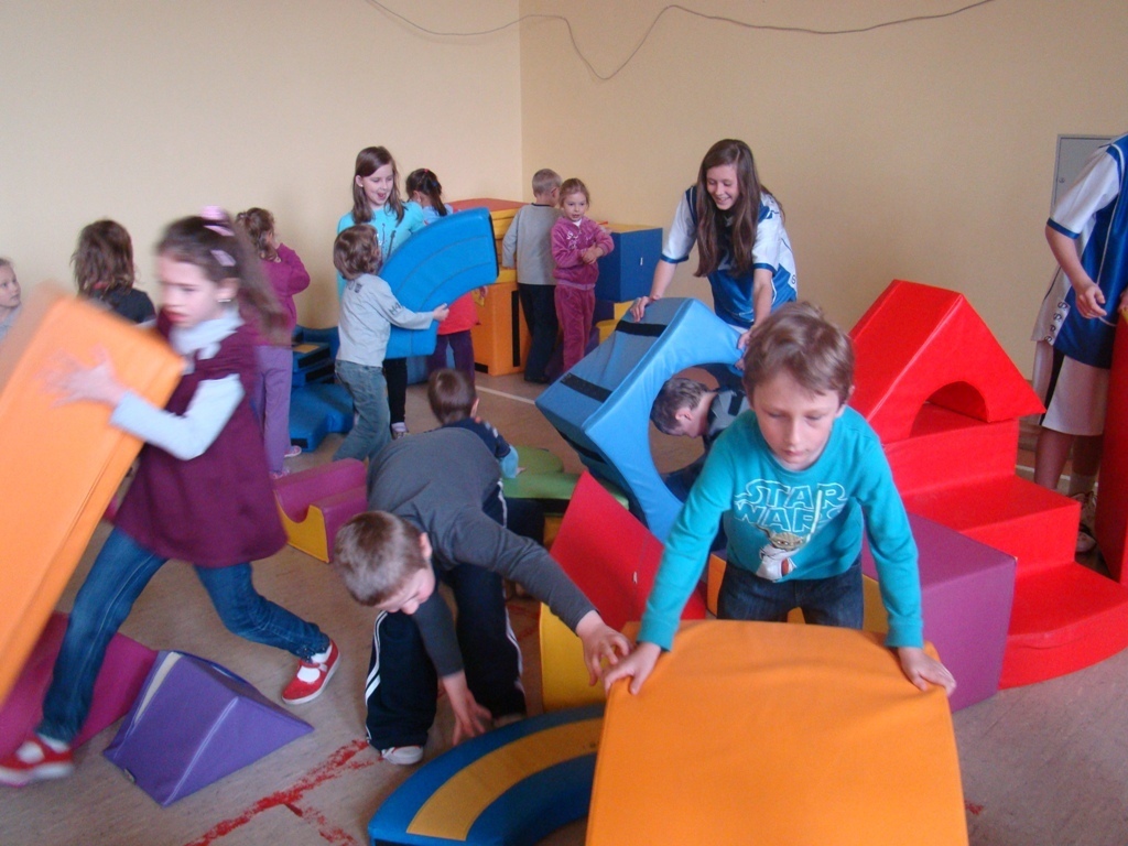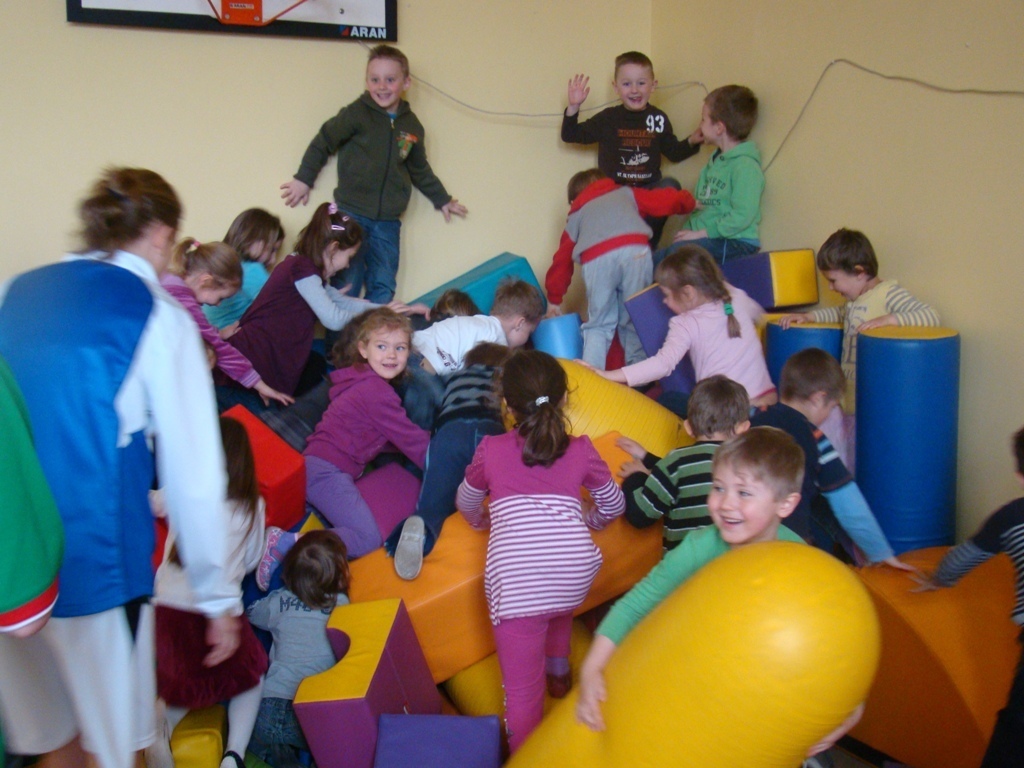 Na początku naszej wizyty - dzieci zwiedziły szkołę w tym min.: sale klas I, II i III, sale komputerowe i gimnastyczne. W jednej z sal mieliśmy okazje skonstruować budowle z dużych przestrzennych figur geometrycznych. Po skończonej zabawie udaliśmy się do szatni by przebrać się w stroje gimnastyczne. Gdy wszyscy byli już gotowi, marszowym krokiem weszliśmy na halę sportową, gdzie czekały na nas zawodniczki z klubu Karkonosze oraz organizatorzy i sponsorzy wielkanocnej imprezy. Po uroczystym przywitaniu i krótkiej rozgrzewce rozpoczęliśmy naszą przygodę z koszykówką.