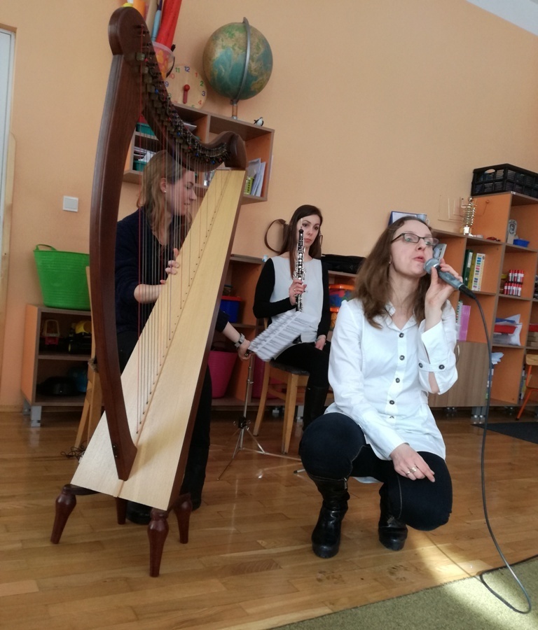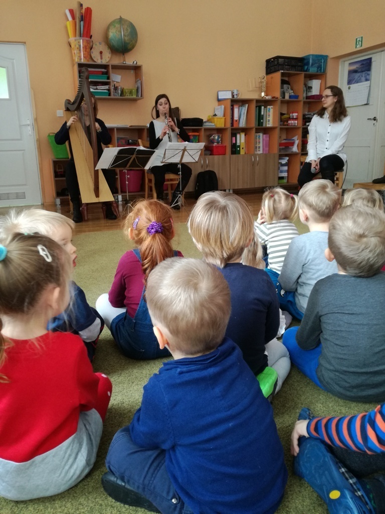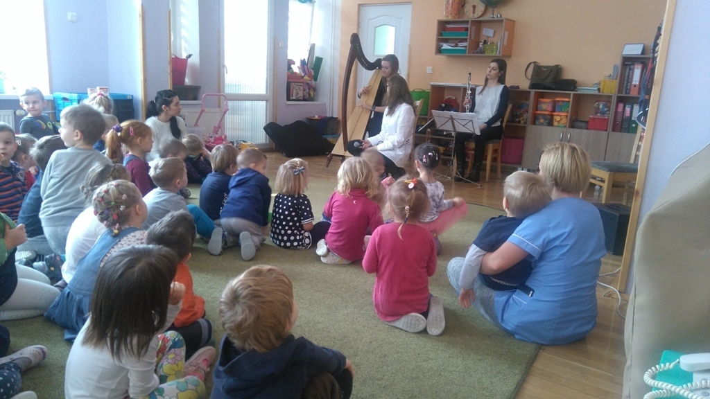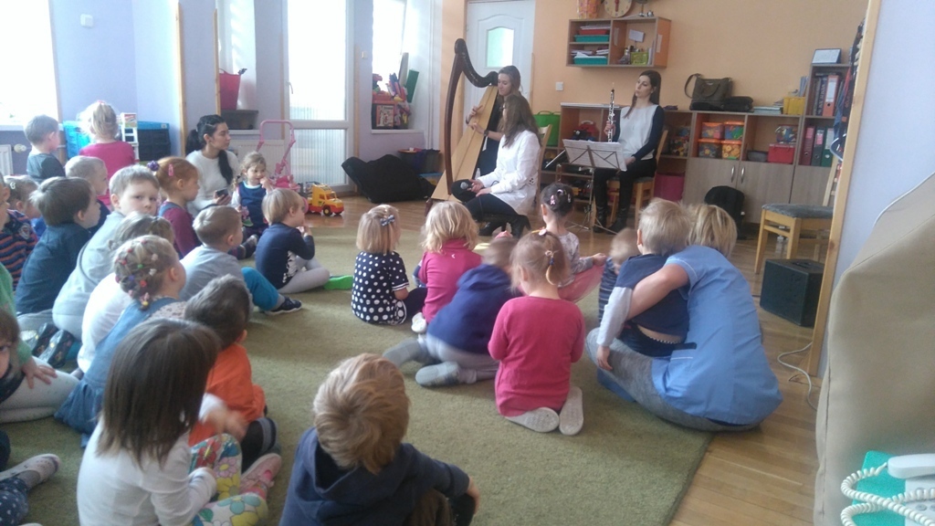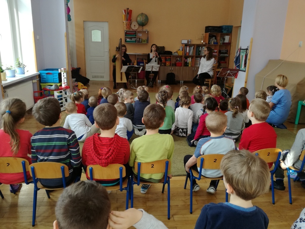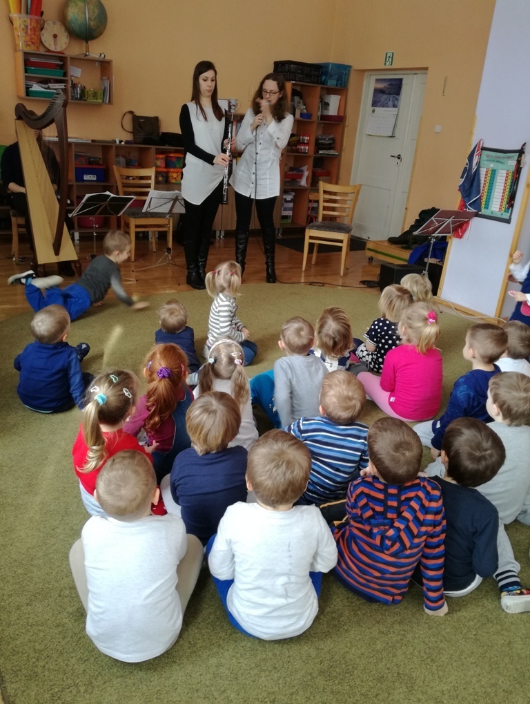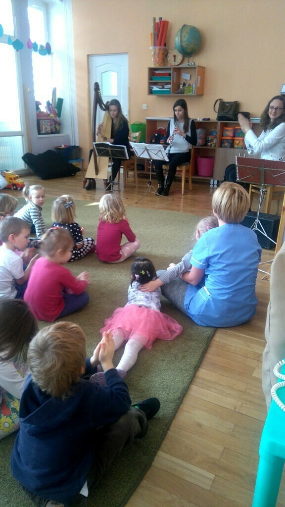 Muzycy z Filharmonii Dolnośląskiej przywitali nas w dniu dzisiejszym utworem pt. "Halleluja" na harfę i obój. Prowadząca spotkanie pani Asia, opowiedziała historię Patryka. Był to chłopiec, który z powodu braku prądu wybrał się na wycieczkę. Dotarł do lasu, w którym poznawał wszystkie żywioły: wodę, ogień, powietrze i Ziemię. A dzieci dzięki tej opowieści poznały budowę oboju oraz harfy. Dowiedziały się, ze harfa to najbardziej anielski z instrumentów zbudowany z 34 strun w różnych kolorach. Jej dźwięki podobne są do szemrzącego strumyka. Razem odtańczyliśmy taniec ognia, wysłuchaliśmy piosenki z bajki Pocahontas, irlandzkich pieśni oraz melodii pozwalających się wyciszyć, a nawet zasnąć. Tuptusiowe przedszkolaki ze skupieniem wysłuchały całego koncertu i z niecierpliwością oczekują już kolejnej audycje.
