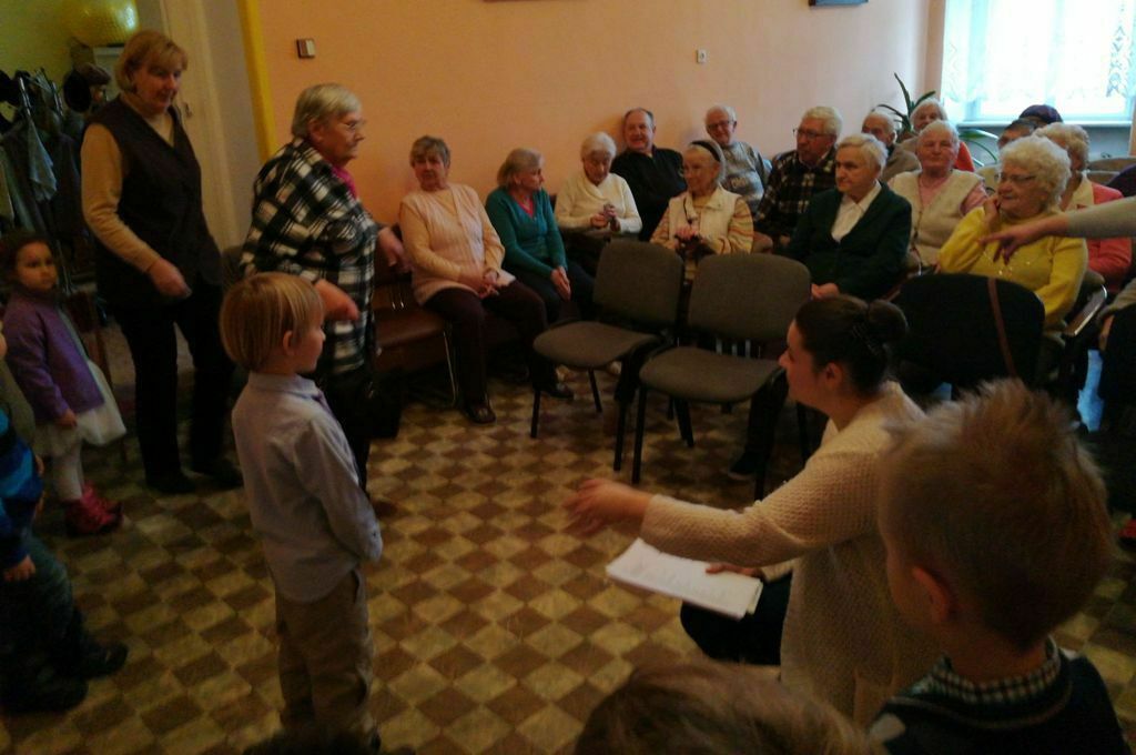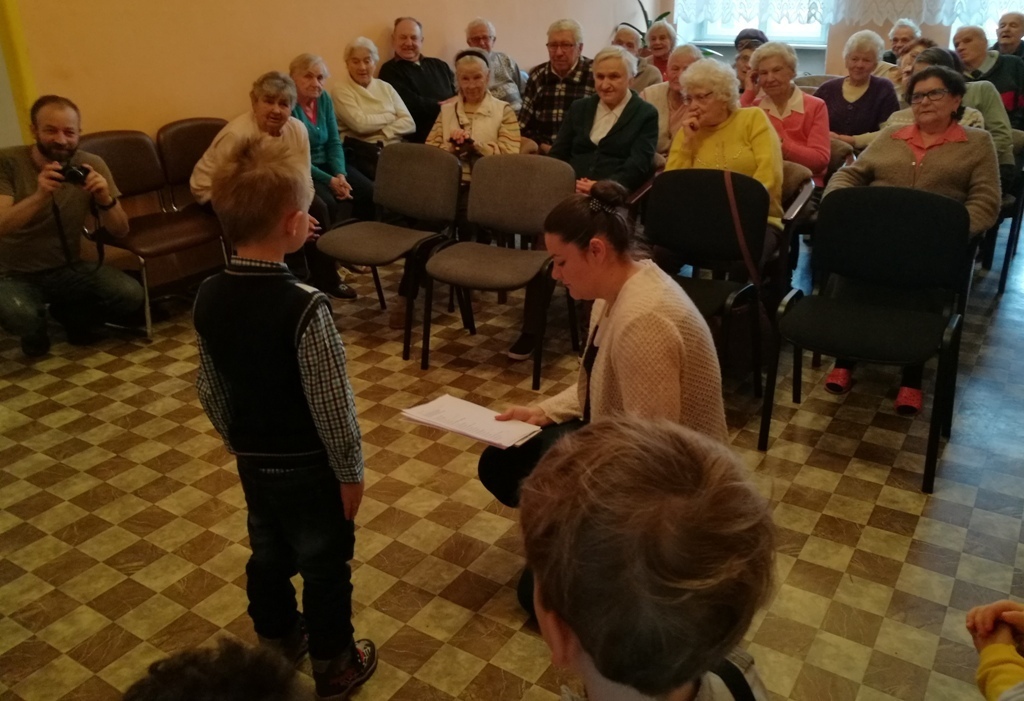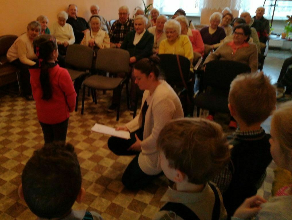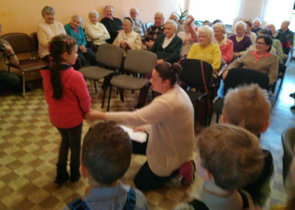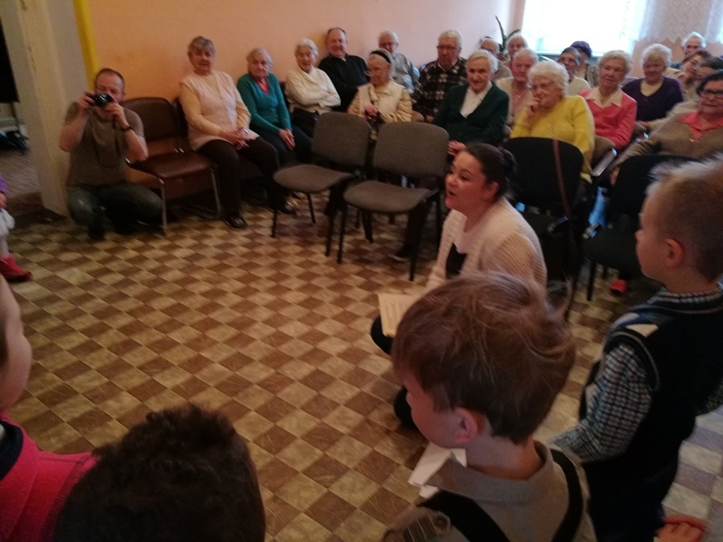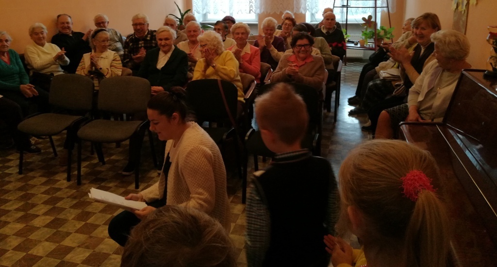 7 lutego dzieci z grupy IV wystąpiły w Domu Dziennego Pobytu z przygotowanym programem z okazji Dnia Babci i Dziadka. Kiedy wchodziliśmy przywitali nas Seniorzy głośnymi brawami. Te oklaski sprawiły, że trema, która do tej pory nas trzymała, zniknęła jak za dotknięciem czarodziejskiej różdżki. Wszystkie dzieci bardzo się starały by głośno i wyraźnie deklamować wiersze i śpiewać piosenki. Podczas występu otuchy dodawały nam uśmiechy widzów, którzy brawami nagradzali każdy punkt naszego programu. Na koniec przedstawienia, zaraz po ukłonach przedszkolaki rozdały przygotowane przez siebie upominki. Miłym zaskoczeniem były dla nas prezenty i podziękowanie. Zadowoleni i dumni z siebie wróciliśmy do przedszkola, zastanawiając się już, kiedy zawitamy tam z następnym występem.