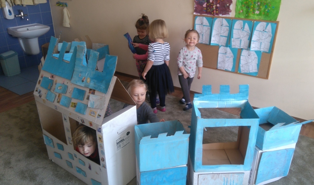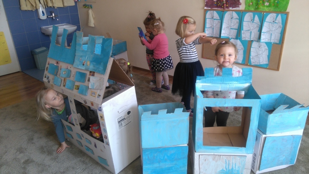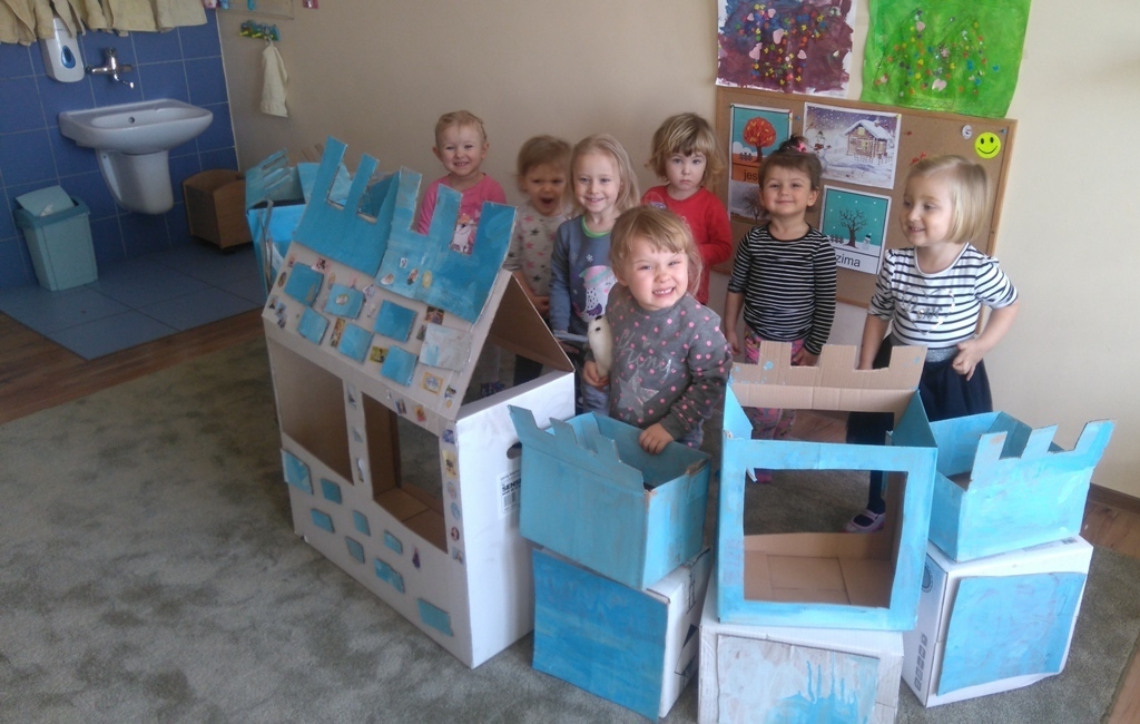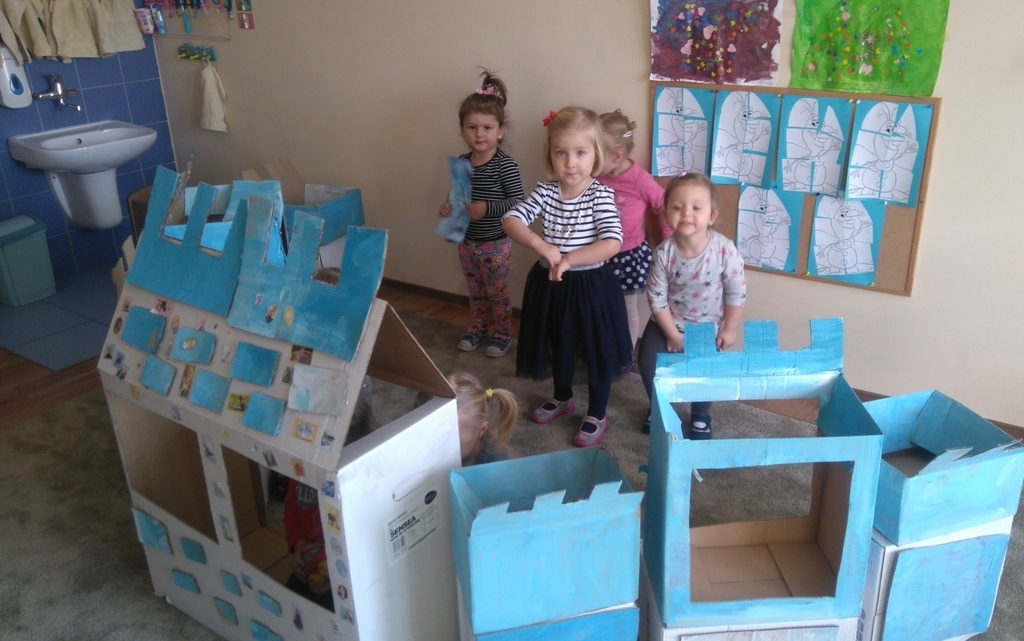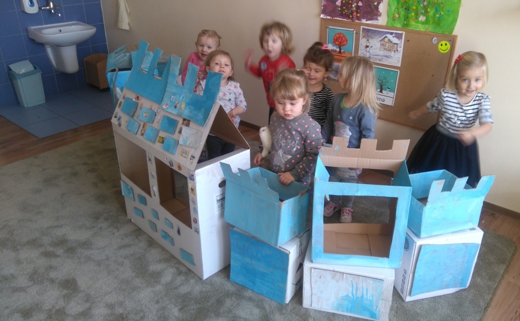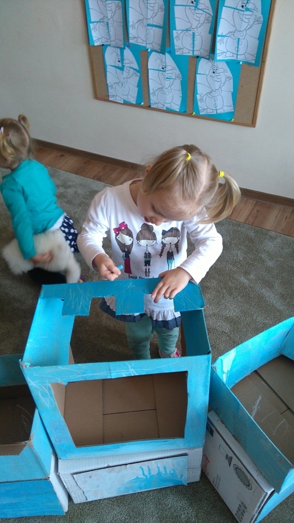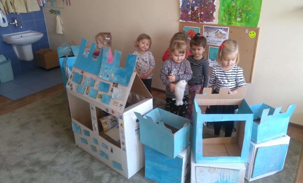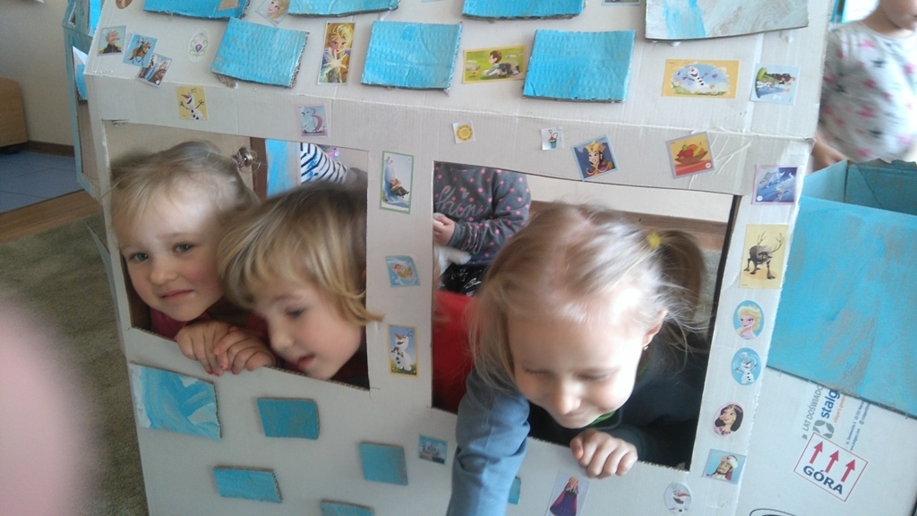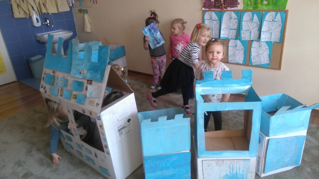 Z kartonów, które przynieśliśmy do przedszkola zbudowaliśmy piękny i duży zamek, w którym dawno, dawno temu mieszkała Królowa Śniegu, a teraz mogliśmy bawić się my. Kartony pomalowaliśmy na biało – niebiesko, a pani Natalia wycięła w nich okno i drzwi. Kiedy wszystko razem poskładaliśmy, na górze ustawiliśmy wieżyczki, to powstał nasz prywatny bajowy zamek, w którym bawiliśmy się słuchając bajki pt. „Królowa Śniegu”.