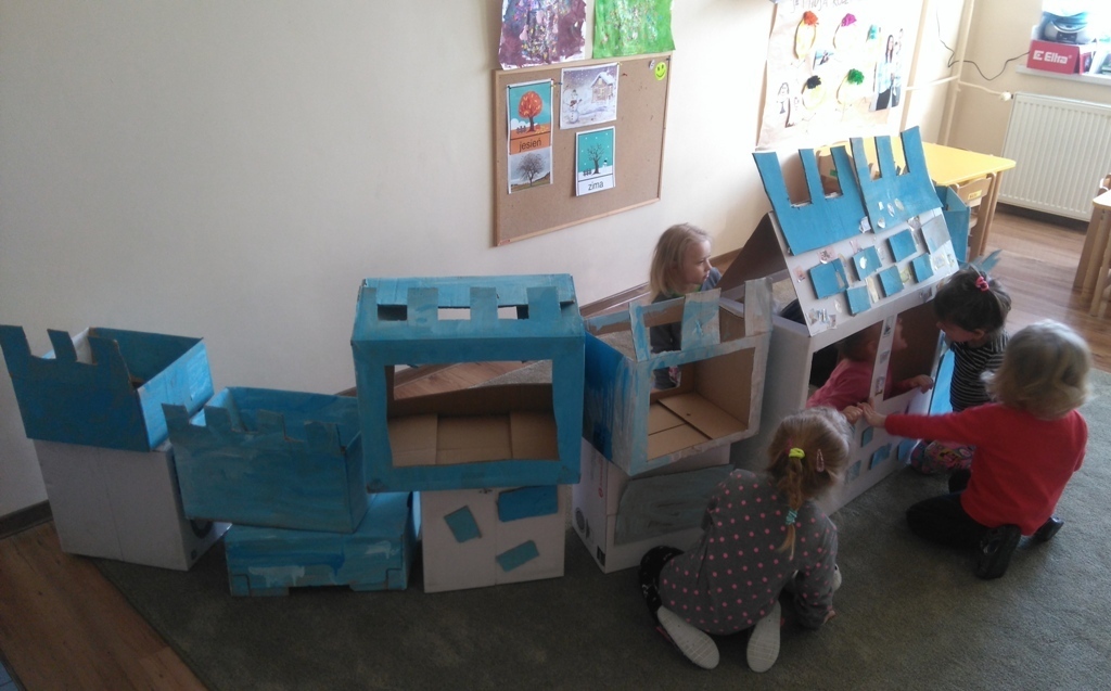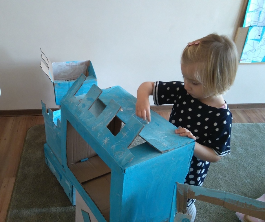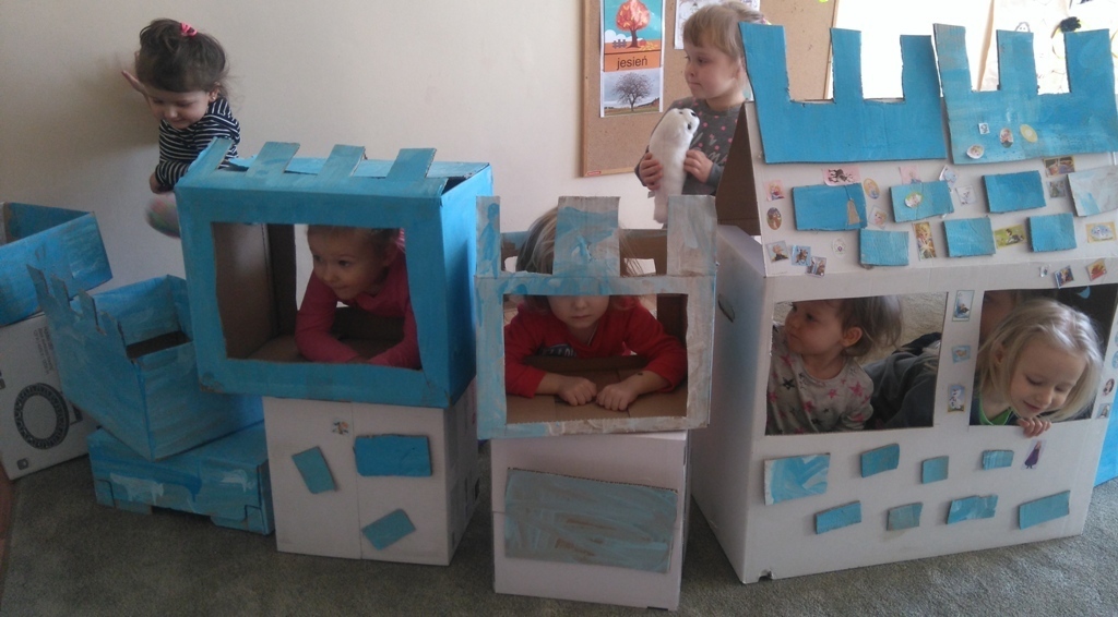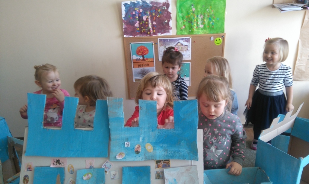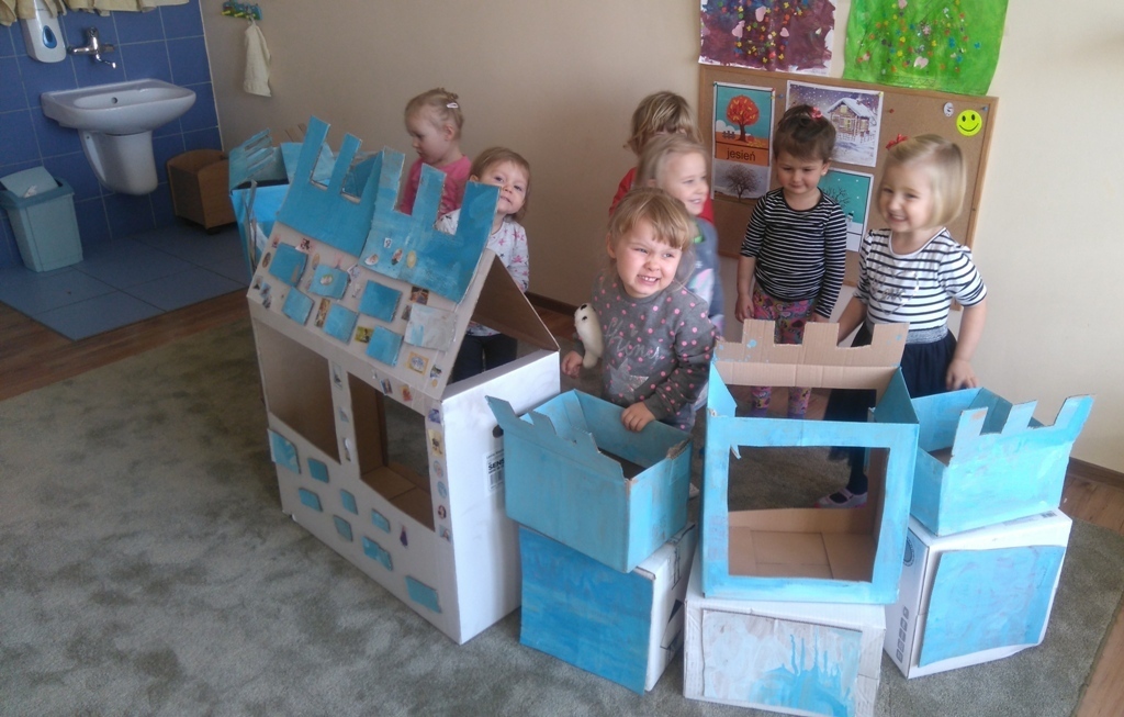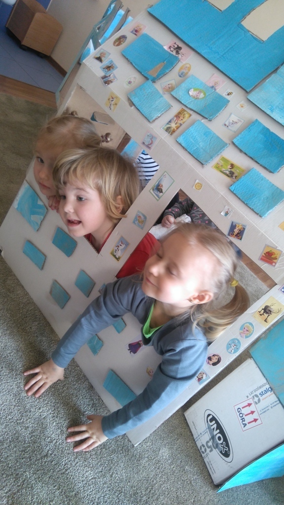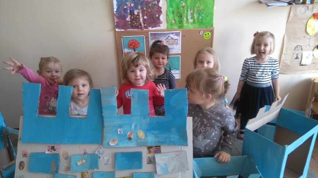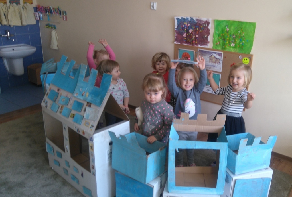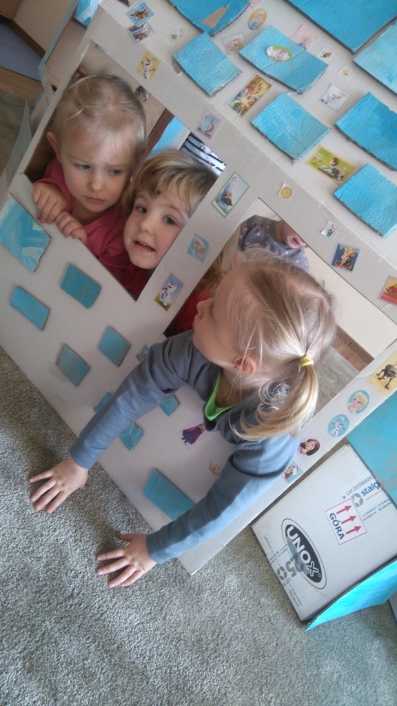 Z kartonów, które przynieśliśmy do przedszkola zbudowaliśmy piękny i duży zamek, w którym dawno, dawno temu mieszkała Królowa Śniegu, a teraz mogliśmy bawić się my. Kartony pomalowaliśmy na biało – niebiesko, a pani Natalia wycięła w nich okno i drzwi. Kiedy wszystko razem poskładaliśmy, na górze ustawiliśmy wieżyczki, to powstał nasz prywatny bajowy zamek, w którym bawiliśmy się słuchając bajki pt. „Królowa Śniegu”.