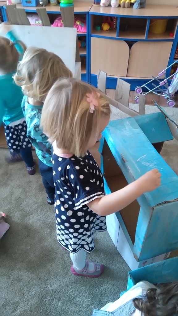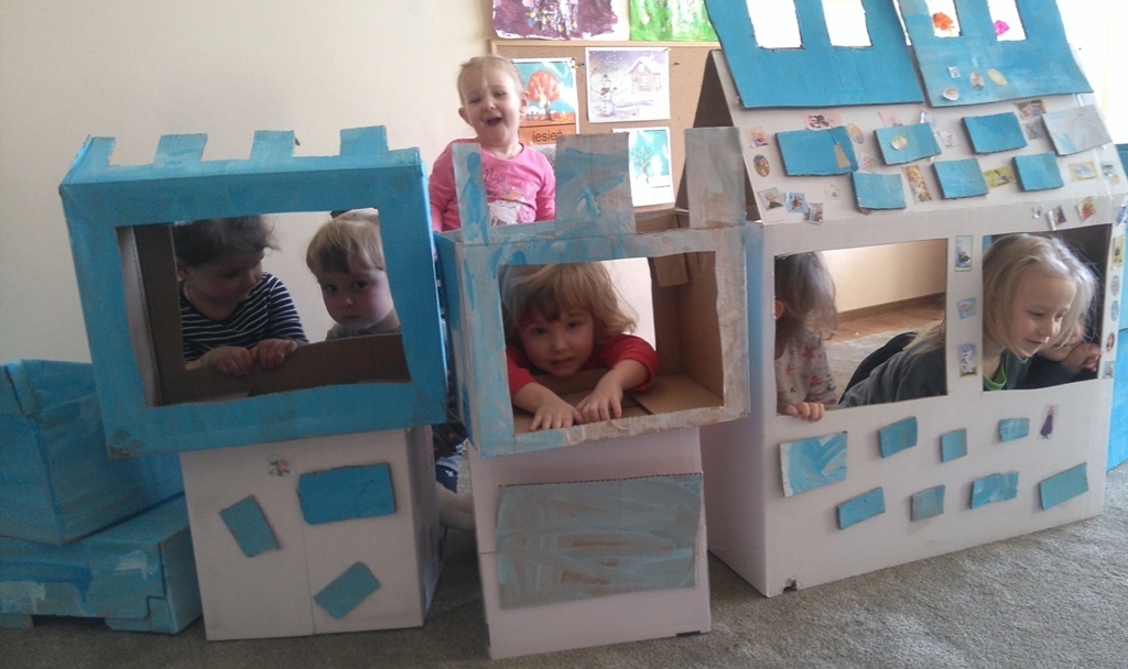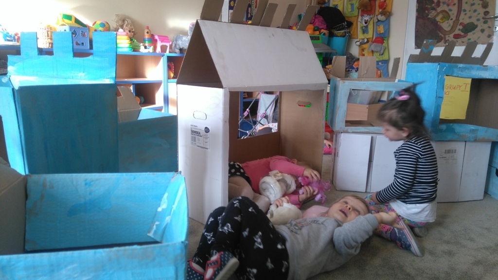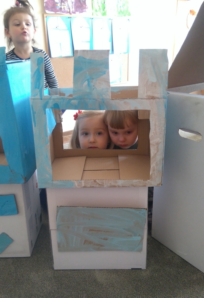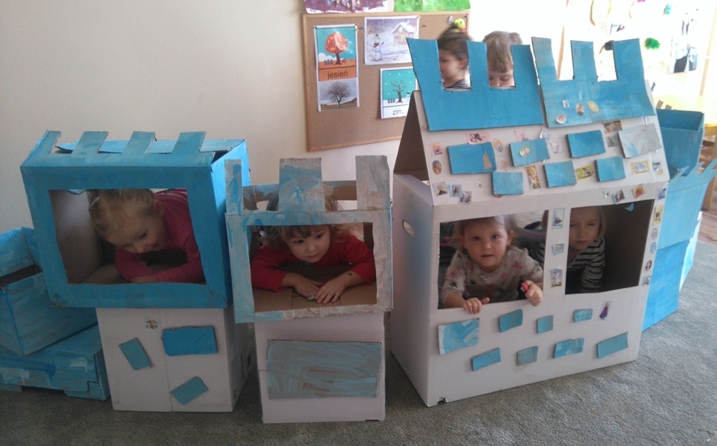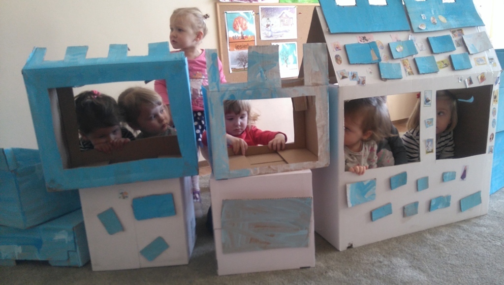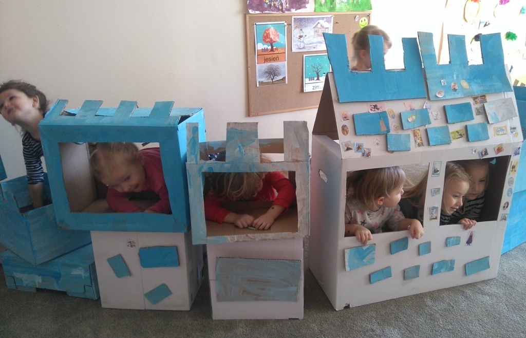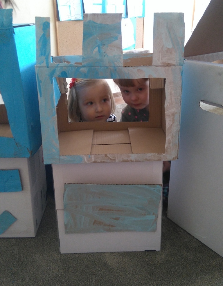 Z kartonów, które przynieśliśmy do przedszkola zbudowaliśmy piękny i duży zamek, w którym dawno, dawno temu mieszkała Królowa Śniegu, a teraz mogliśmy bawić się my. Kartony pomalowaliśmy na biało – niebiesko, a pani Natalia wycięła w nich okno i drzwi. Kiedy wszystko razem poskładaliśmy, na górze ustawiliśmy wieżyczki, to powstał nasz prywatny bajowy zamek, w którym bawiliśmy się słuchając bajki pt. „Królowa Śniegu”.