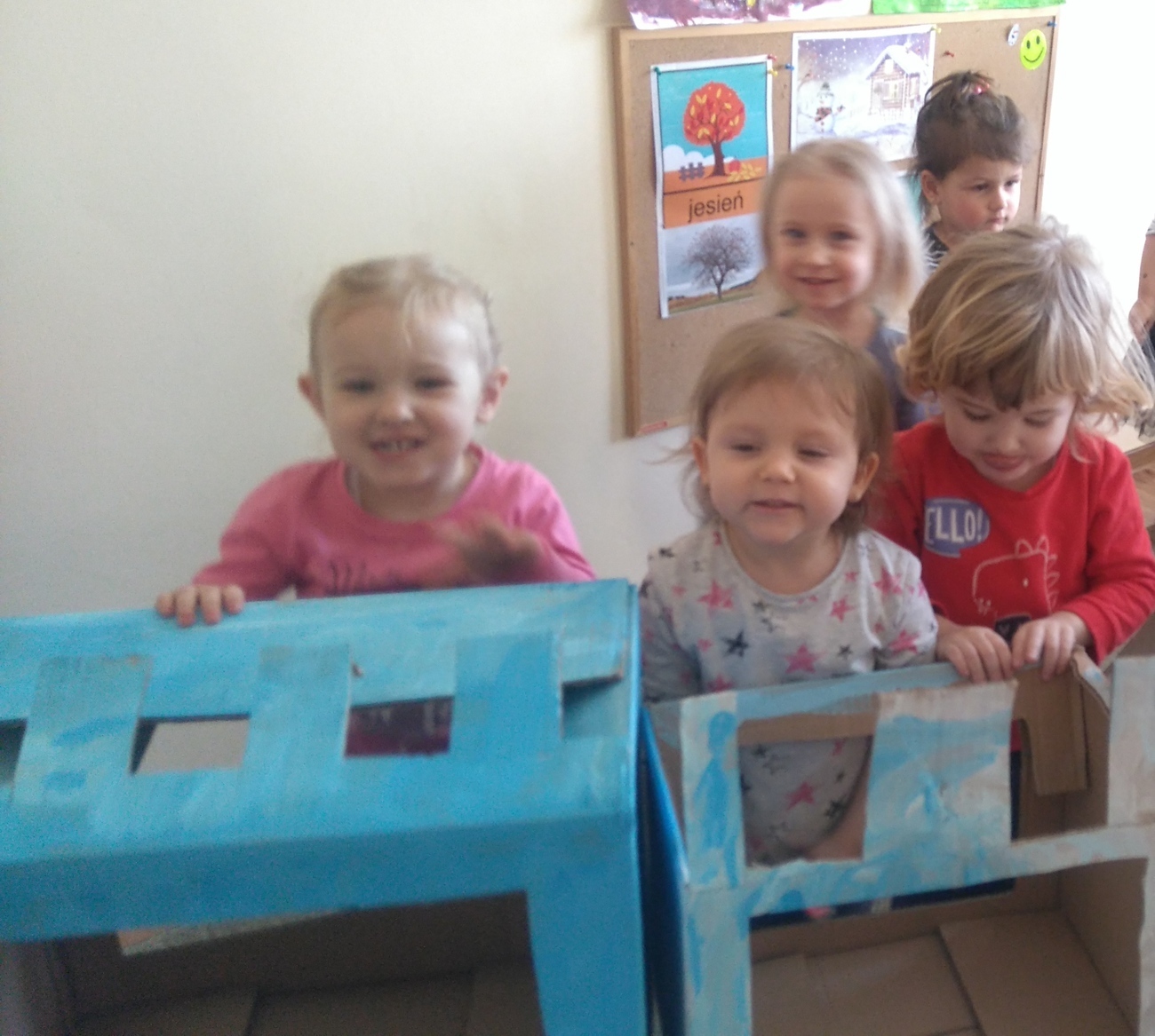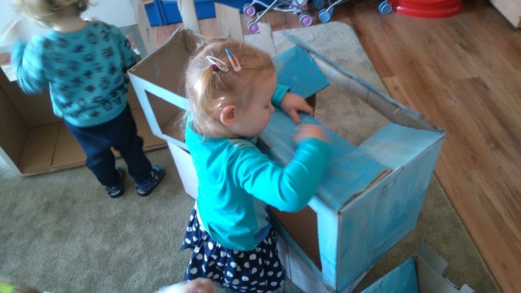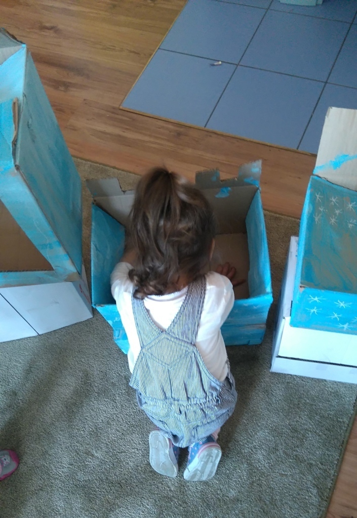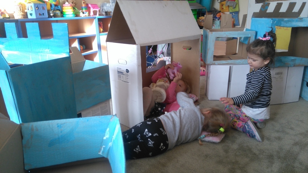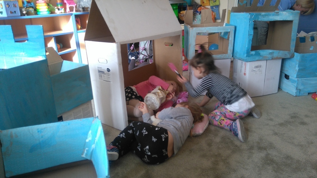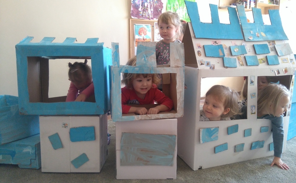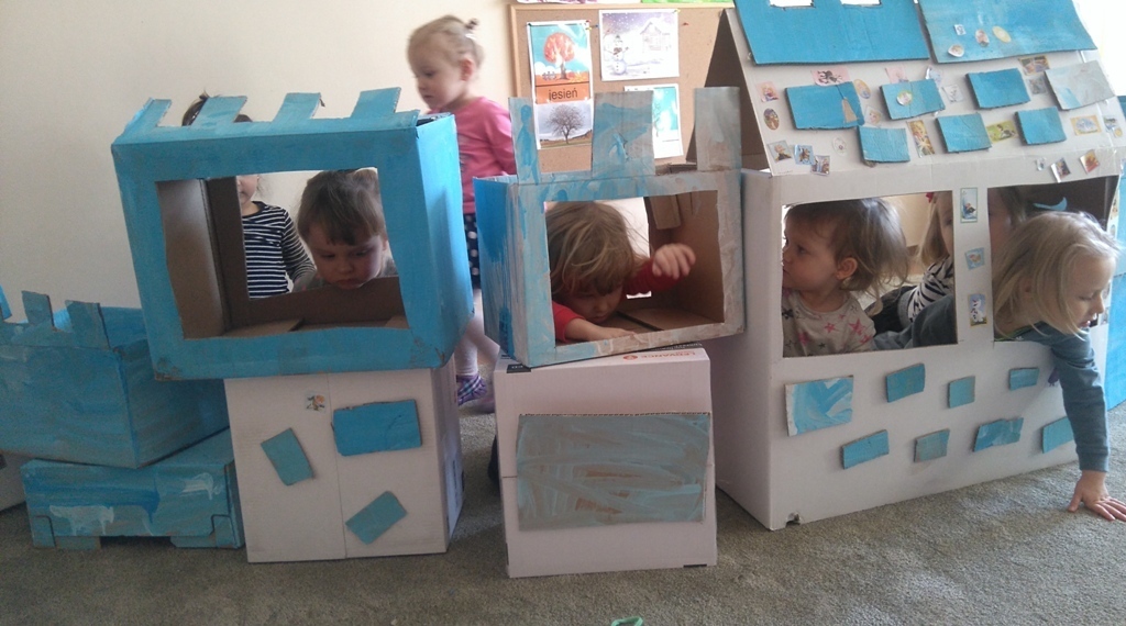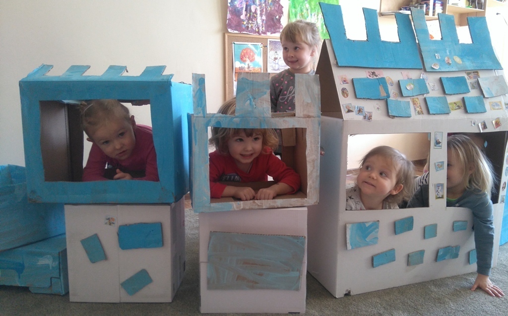 Z kartonów, które przynieśliśmy do przedszkola zbudowaliśmy piękny i duży zamek, w którym dawno, dawno temu mieszkała Królowa Śniegu, a teraz mogliśmy bawić się my. Kartony pomalowaliśmy na biało – niebiesko, a pani Natalia wycięła w nich okno i drzwi. Kiedy wszystko razem poskładaliśmy, na górze ustawiliśmy wieżyczki, to powstał nasz prywatny bajowy zamek, w którym bawiliśmy się słuchając bajki pt. „Królowa Śniegu”.