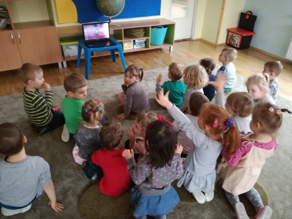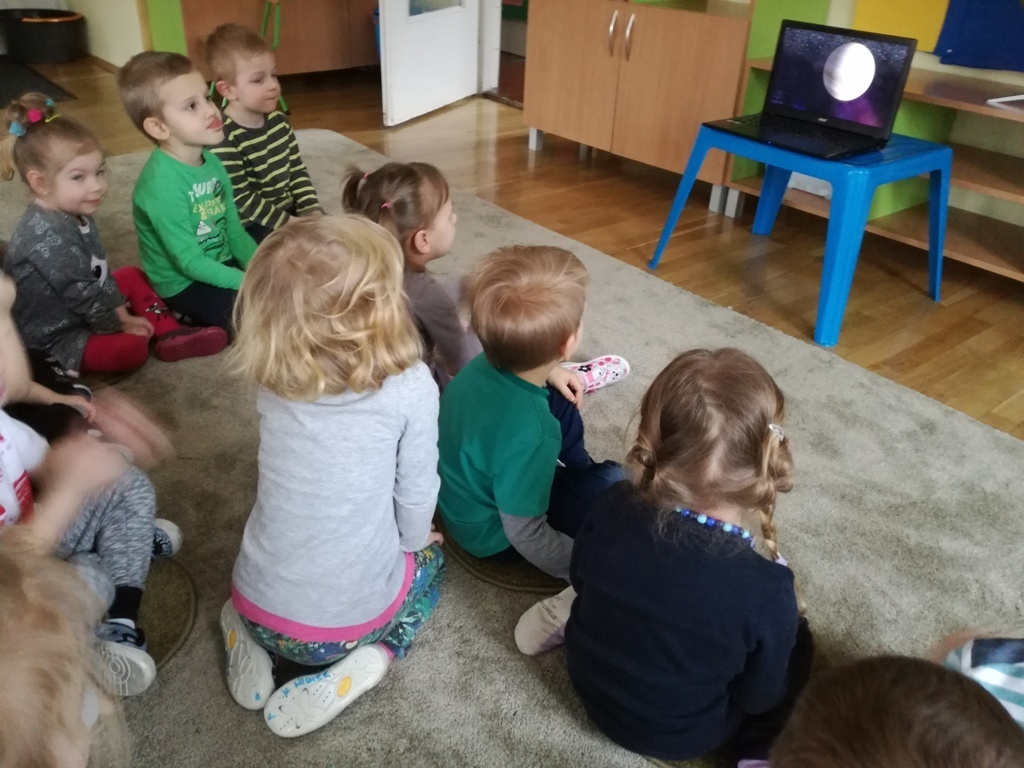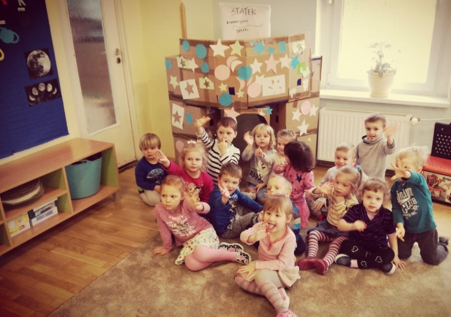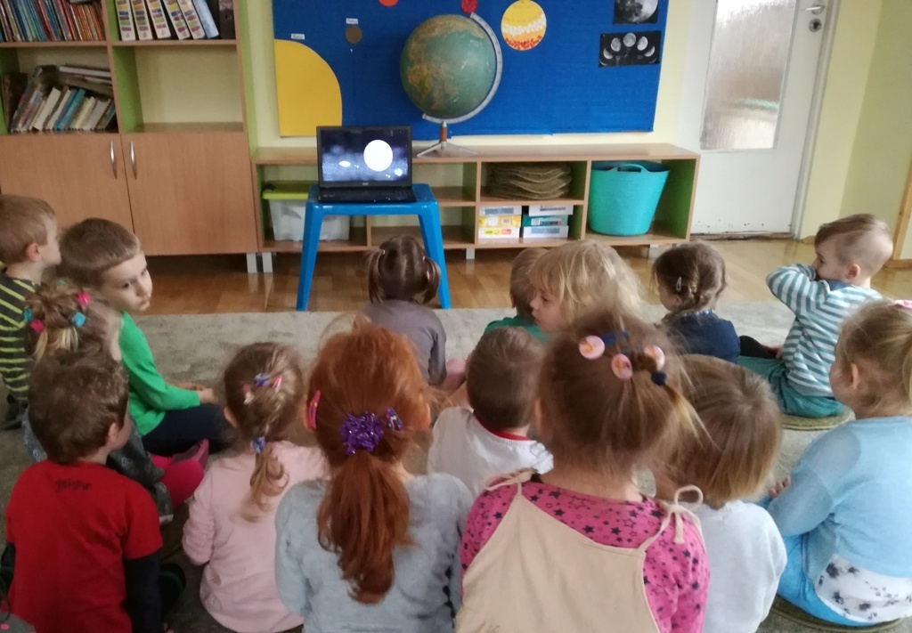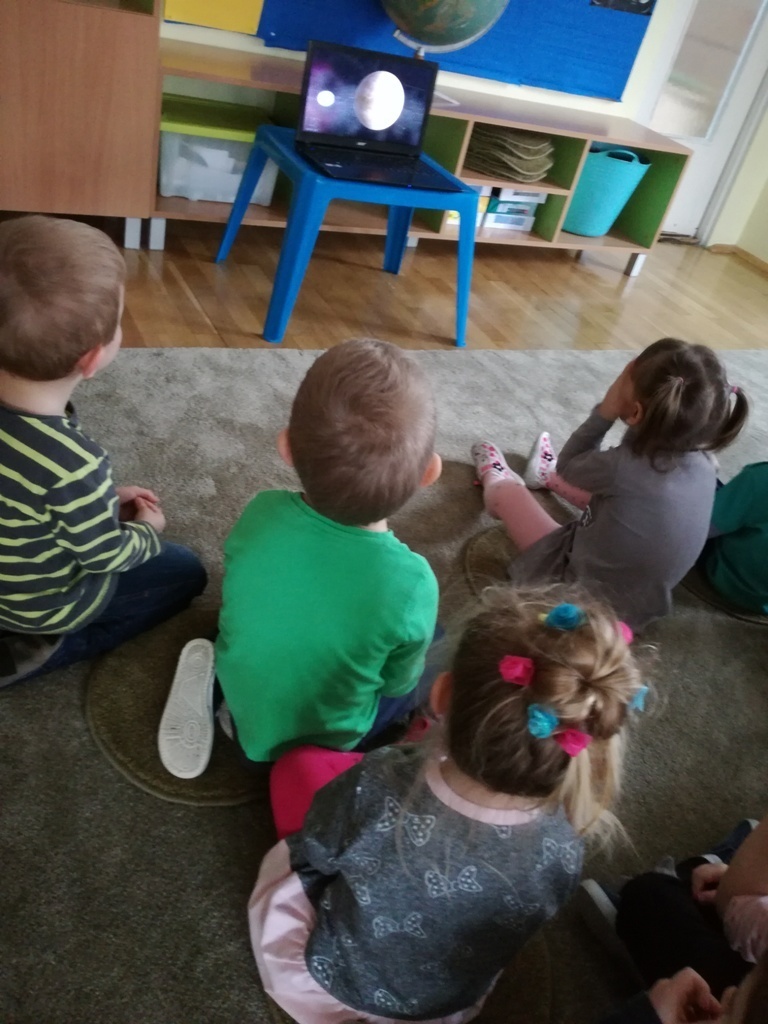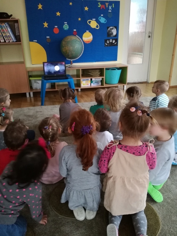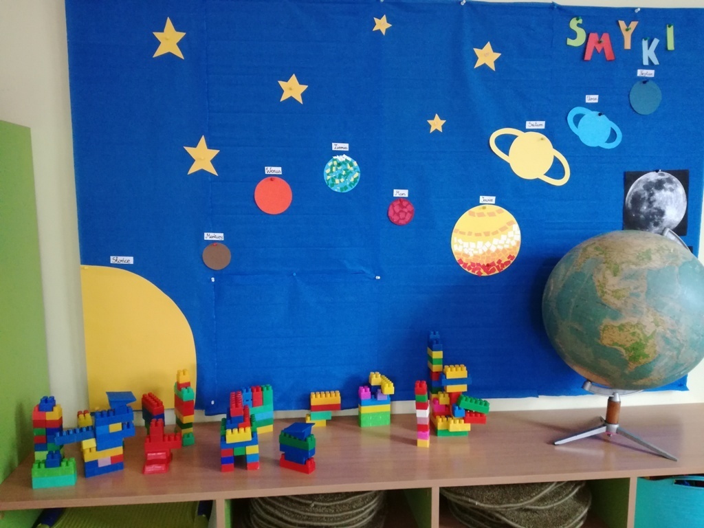Pani Dominika zaprezentowała dzieciom model Układu Słonecznego, opowiadając o Słońcu, planetach, gwiazdach i księżycu. Poznały najbardziej charakterystyczne cechy planet - ich kolory. Potrafią już wskazać, którą z nich jest Ziemia. W czasie zajęć przedszkolaki obejrzały multimedialną prezentację o planetach oraz wzięły udział w zabawach: „Statki kosmiczne”, „Dzień – noc”. Dzieci poznały postać kosmonauty i wcieliły się podczas zabaw w jego rolę. Ozdobiły statek kosmiczny, którym miały możliwość polecieć w kosmos i skonstruowały swoje własne rakiety z klocków.