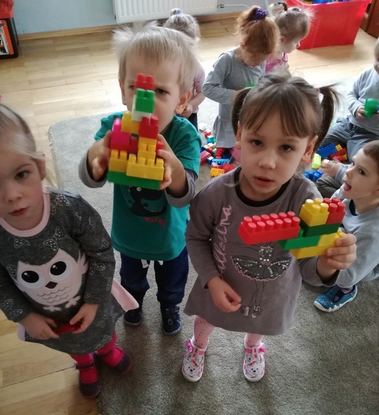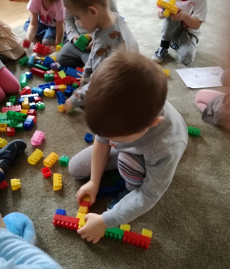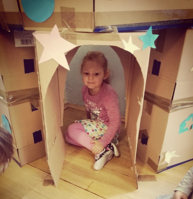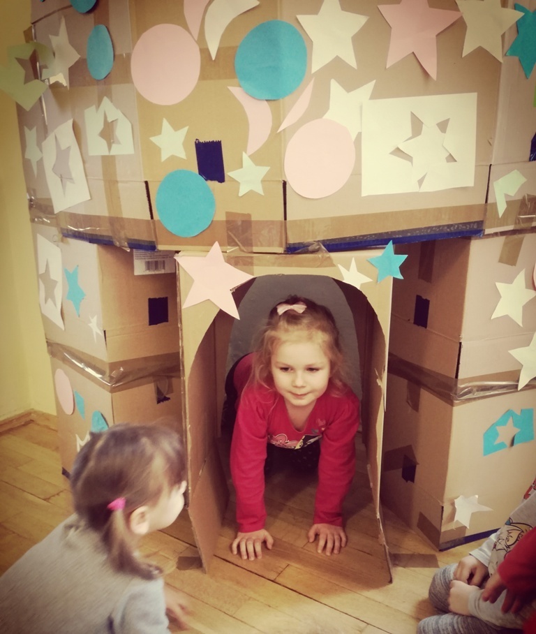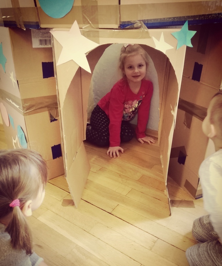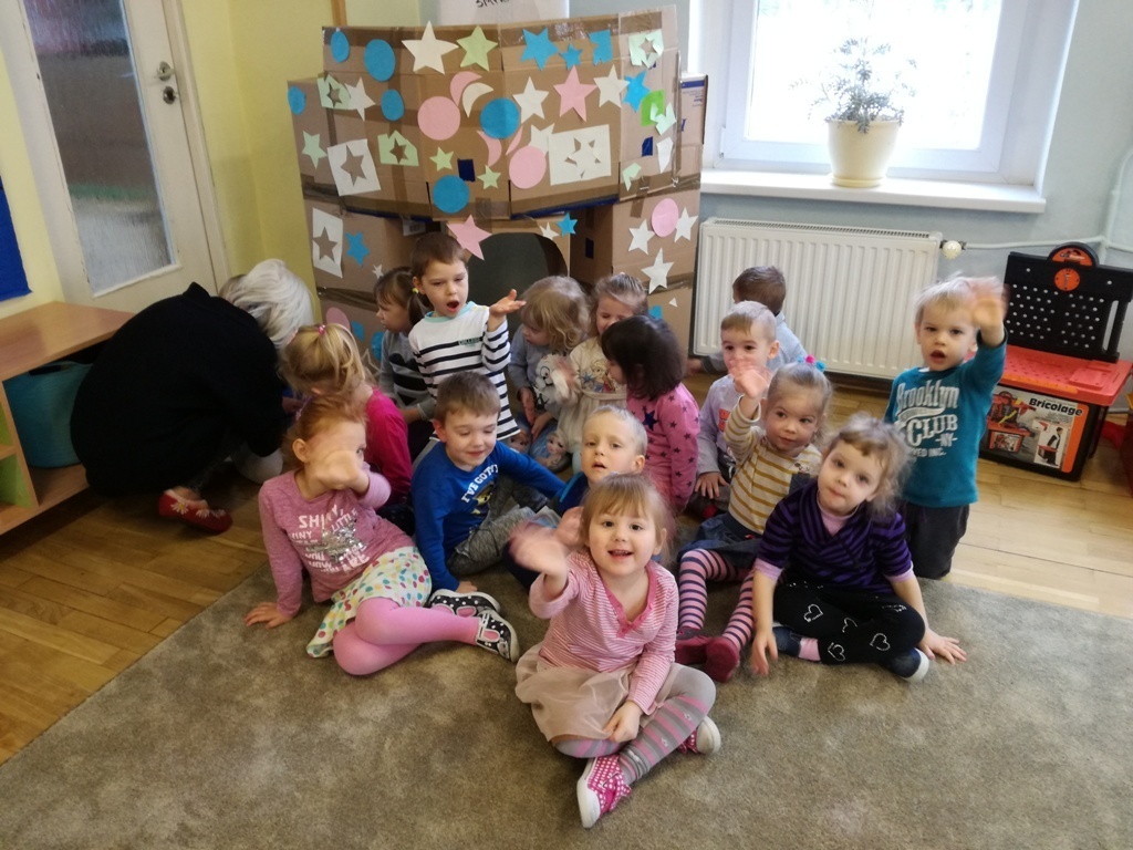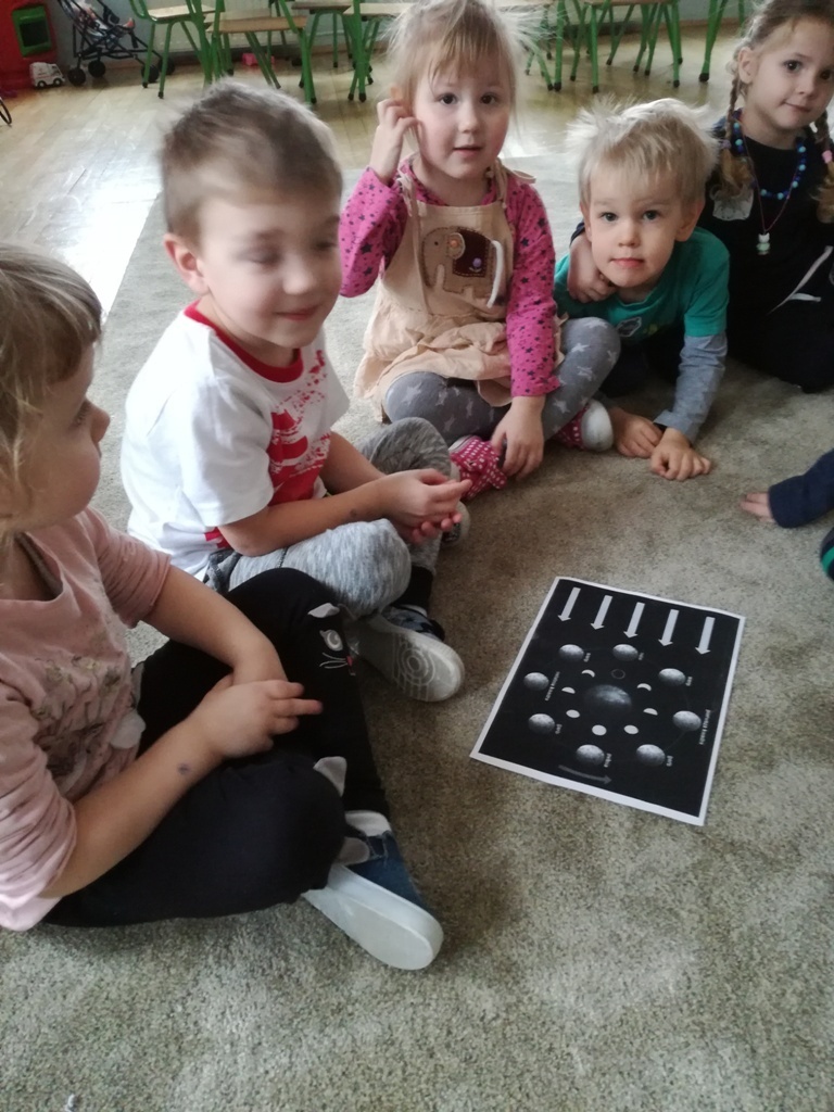 Pani Dominika zaprezentowała dzieciom model Układu Słonecznego, opowiadając o Słońcu, planetach, gwiazdach i księżycu. Poznały najbardziej charakterystyczne cechy planet - ich kolory. Potrafią już wskazać, którą z nich jest Ziemia. W czasie zajęć przedszkolaki obejrzały multimedialną prezentację o planetach oraz wzięły udział w zabawach: „Statki kosmiczne”, „Dzień – noc”. Dzieci poznały postać kosmonauty i wcieliły się podczas zabaw w jego rolę. Ozdobiły statek kosmiczny, którym miały możliwość polecieć w kosmos i skonstruowały swoje własne rakiety z klocków.