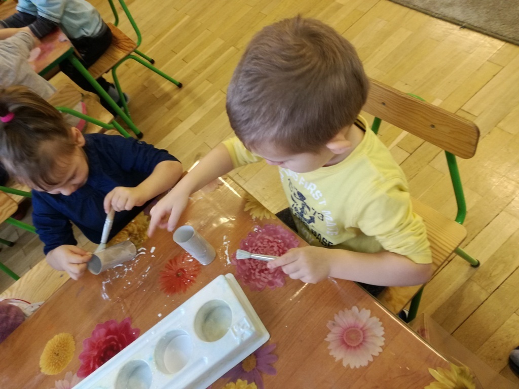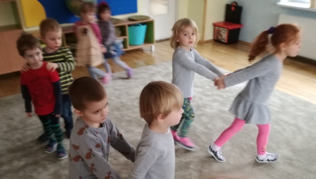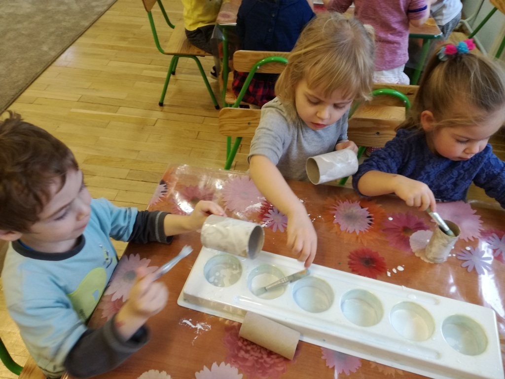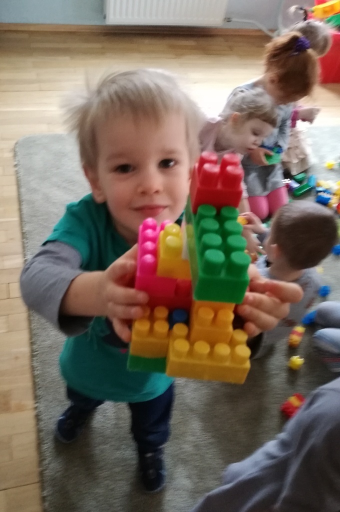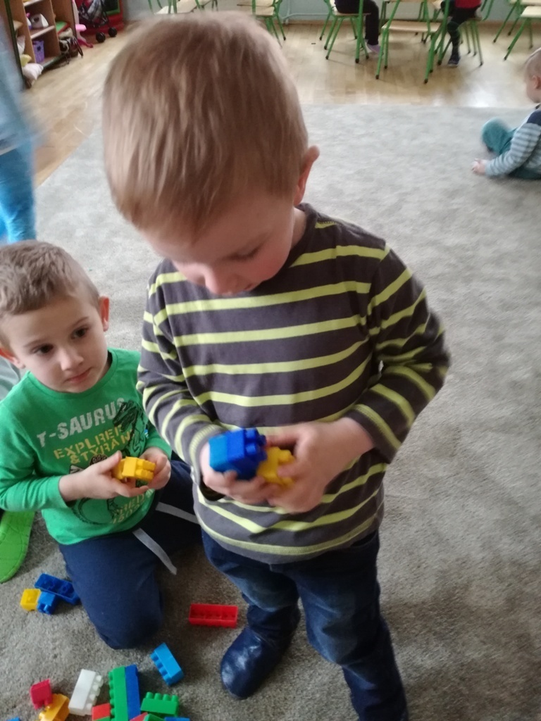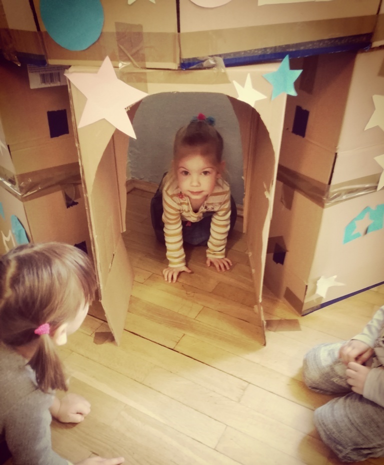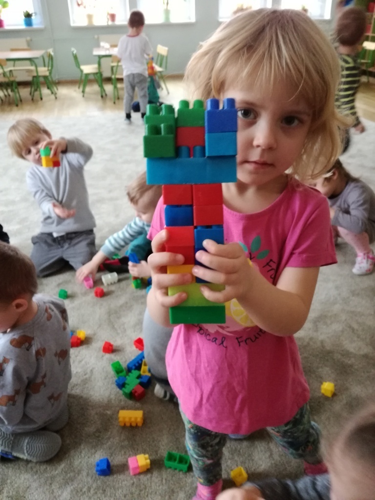 Pani Dominika zaprezentowała dzieciom model Układu Słonecznego, opowiadając o Słońcu, planetach, gwiazdach i księżycu. Poznały najbardziej charakterystyczne cechy planet - ich kolory. Potrafią już wskazać, którą z nich jest Ziemia. W czasie zajęć przedszkolaki obejrzały multimedialną prezentację o planetach oraz wzięły udział w zabawach: „Statki kosmiczne”, „Dzień – noc”. Dzieci poznały postać kosmonauty i wcieliły się podczas zabaw w jego rolę. Ozdobiły statek kosmiczny, którym miały możliwość polecieć w kosmos i skonstruowały swoje własne rakiety z klocków.