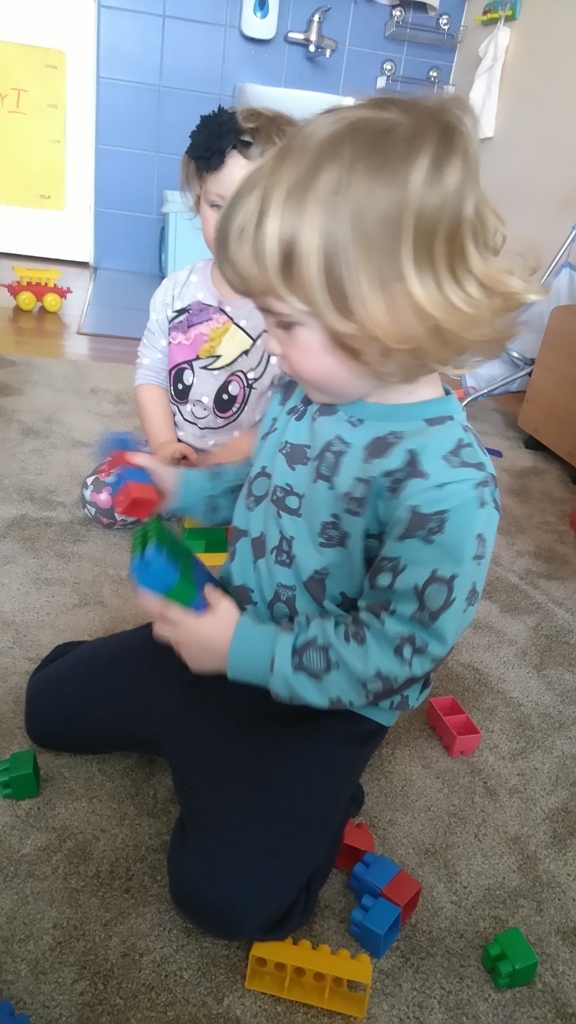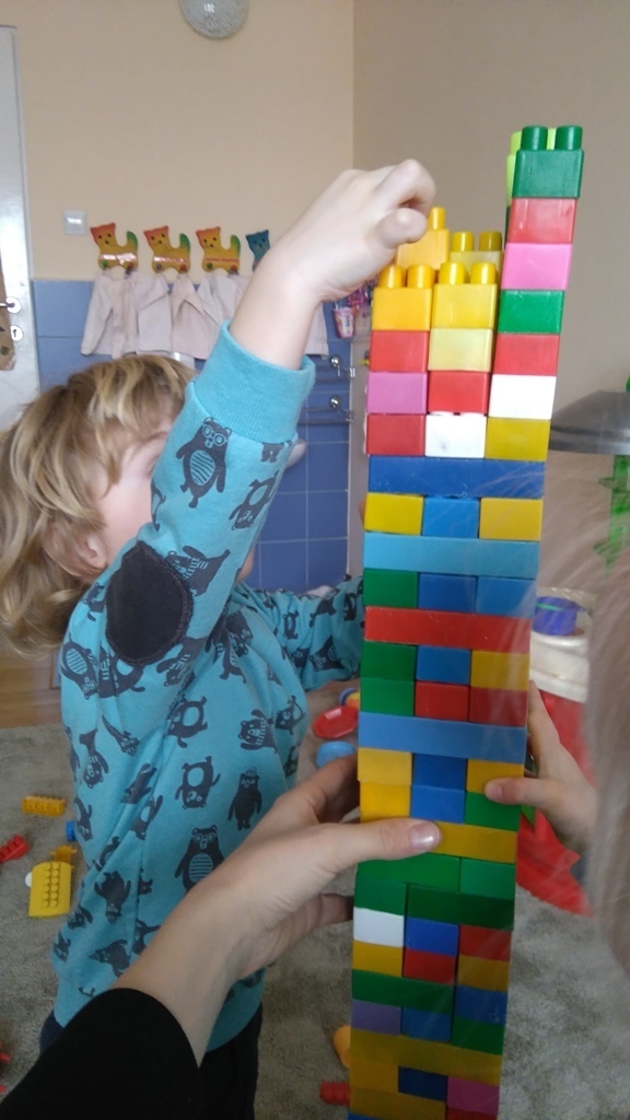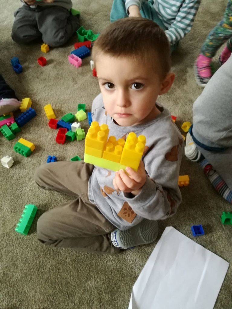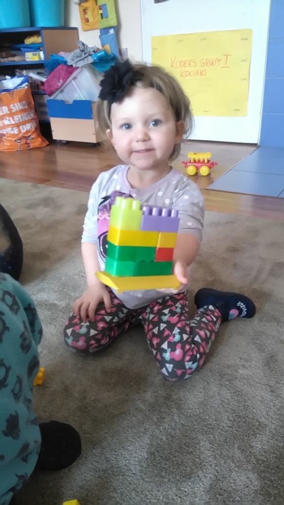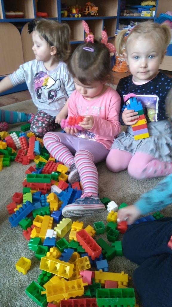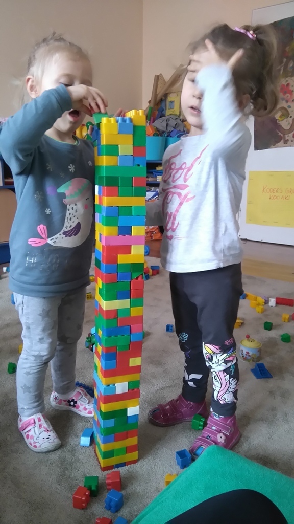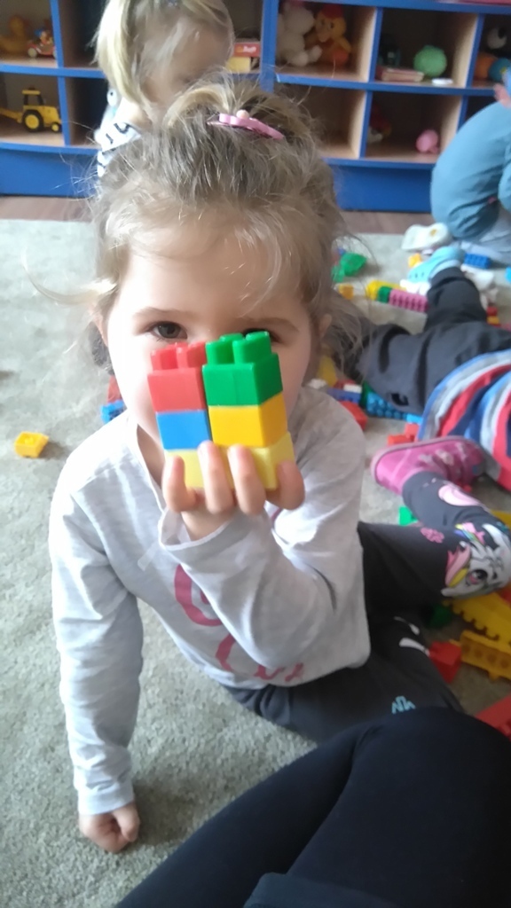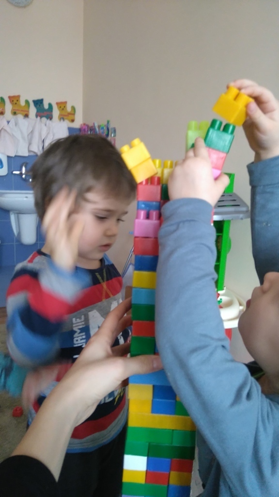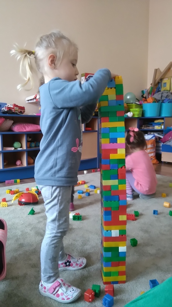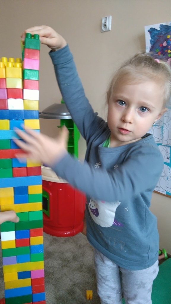 Konstruowanie budowli z klocków gr. I. W dniu dzisiejszym udało nam się wspólnymi siłami zbudować olbrzymią wieżę, którą było wyższa od nas i trudno nam już było na koniec dokładać do niej klocki ponieważ nie dosięgaliśmy do jej czubka. Nasza zabawa miała na celu wytworzenie miłej i radosnej atmosfery, zbudowanie poczucia przunależności do grupy i integrowanie się z nią poprzez wspólną zabawę, która teżjest bardzo przyjemna.