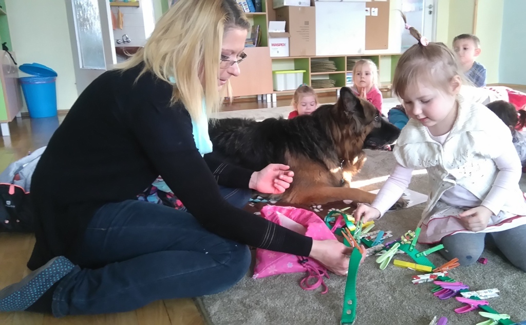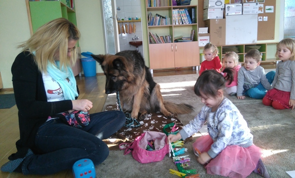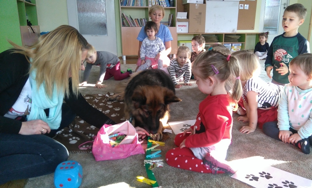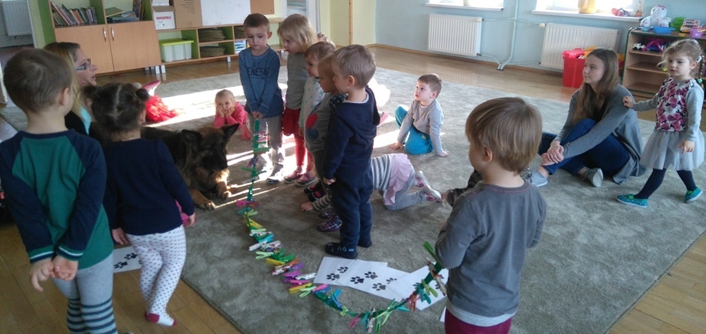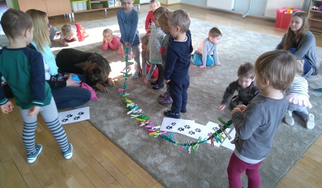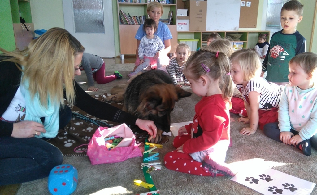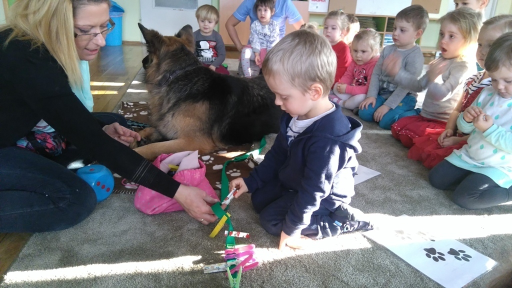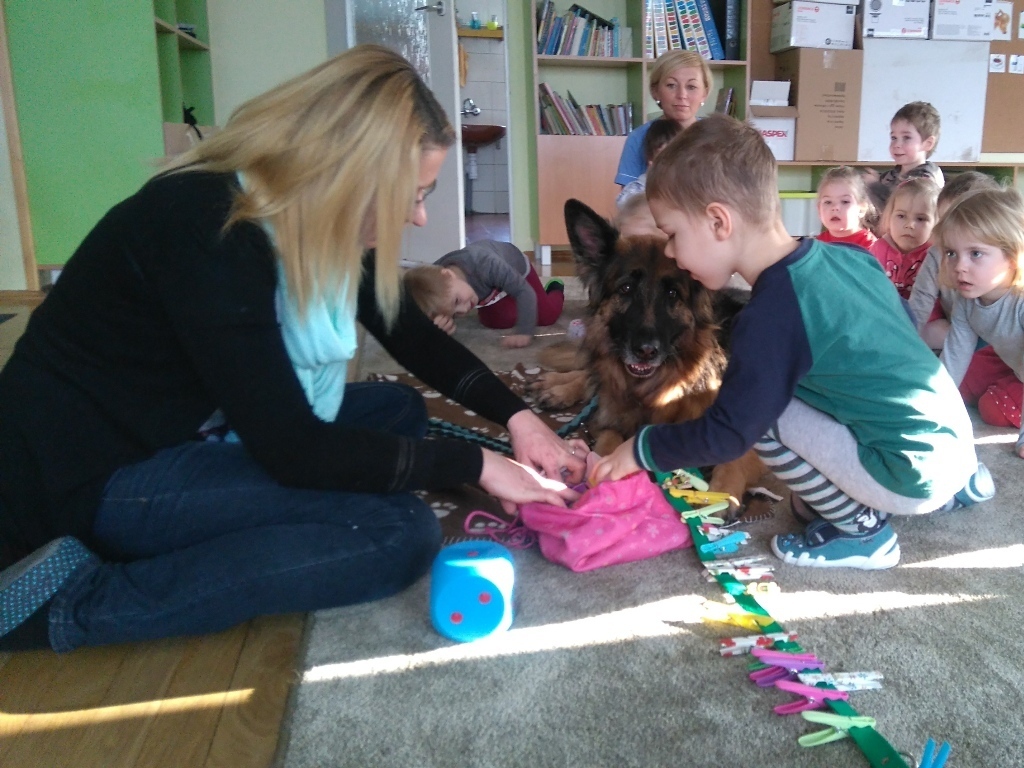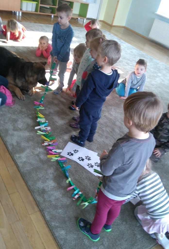 Dzisiejszego dnia przybiegł do nas gość, nazywa się Wandzia – już mieliśmy kiedyś możliwość go poznać. Nasze zadanie polegało na udekorowaniu jej smyczy. Po kolei rzucaliśmy kostką. Liczba kropek oznaczała ilość kolorowych spinaczy, które przyczepialiśmy do smyczy. Następnie wszyscy musieliśmy odpinać kolorowe spinacze ze smyczy i schować do torebki. Każdy mógł pogłaskać psa, a nawet przytulić. Nauczyliśmy się tego dnia, że psy to bardzo miłe i łagodne zwierzęta.