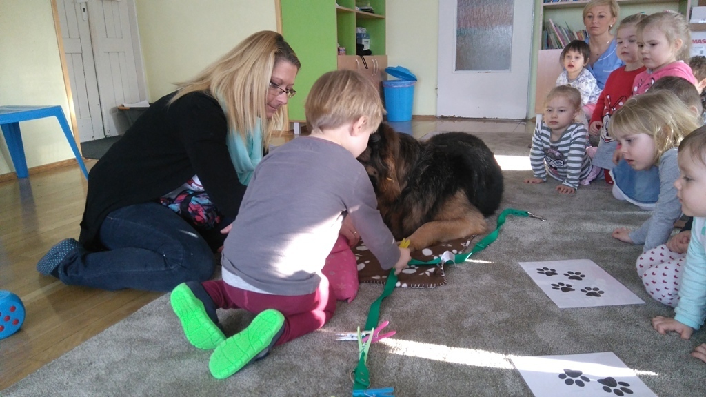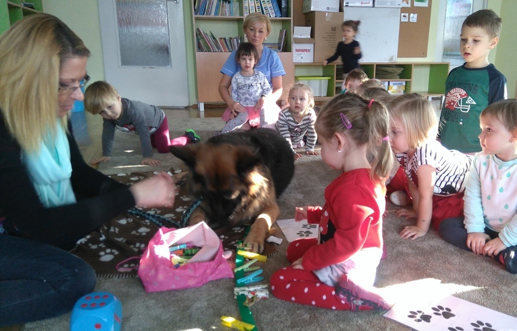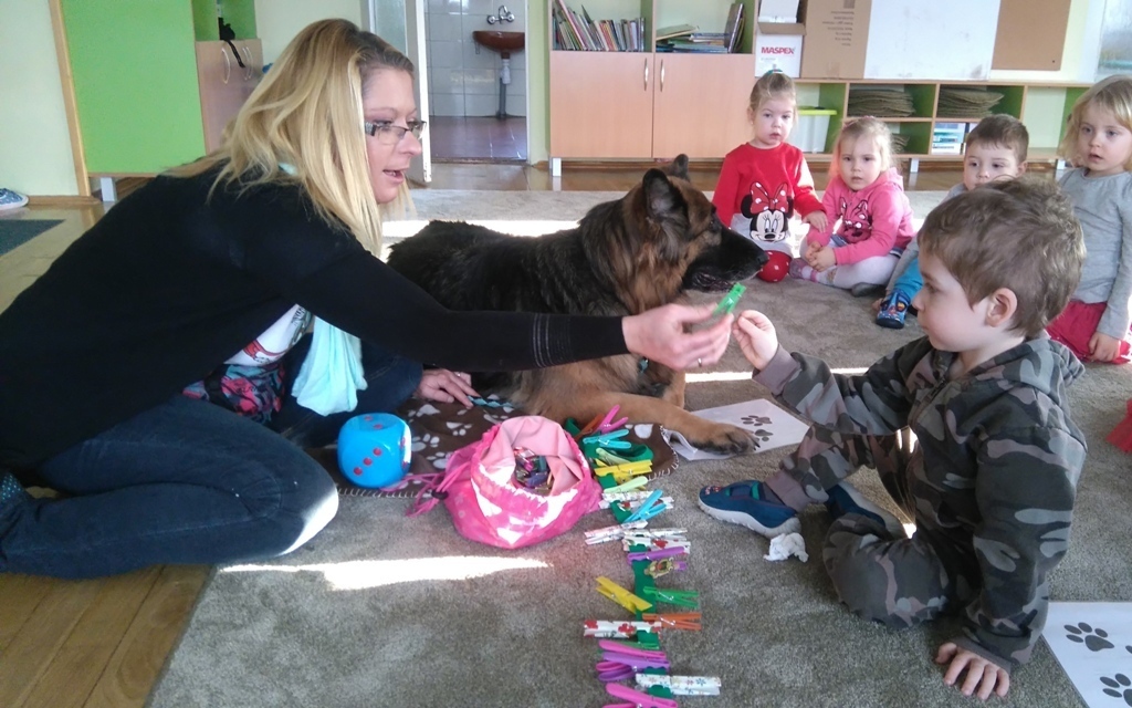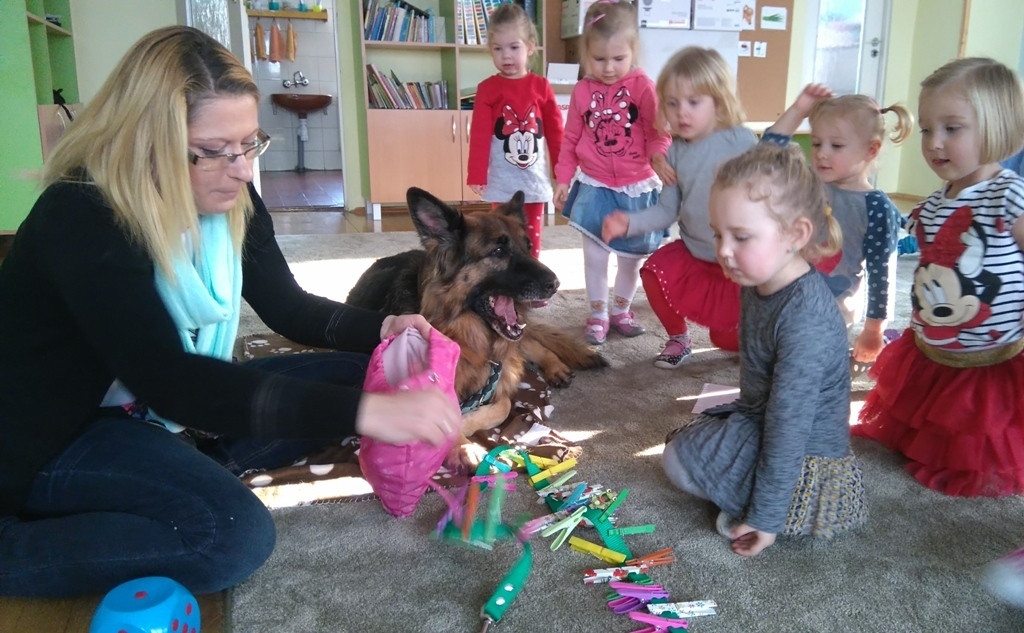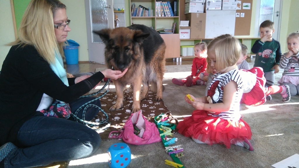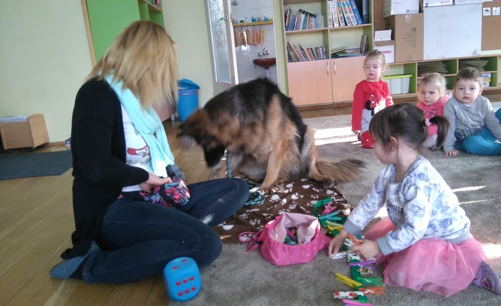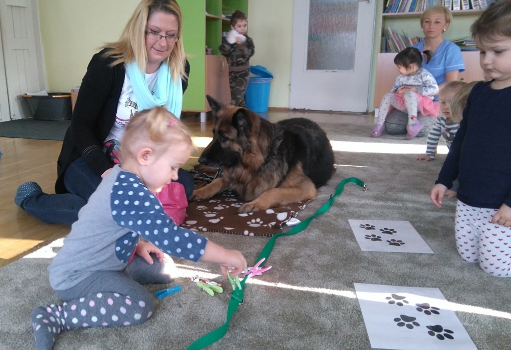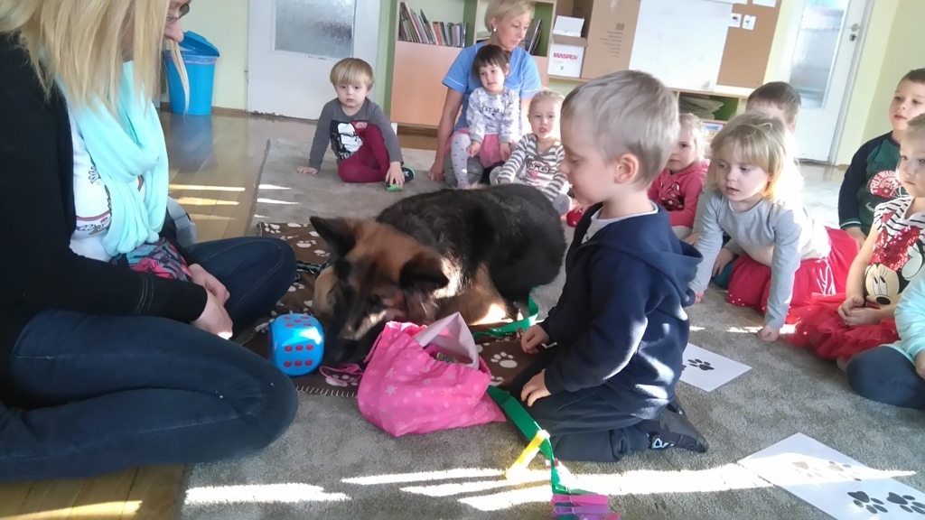 Dzisiejszego dnia przybiegł do nas gość, nazywa się Wandzia – już mieliśmy kiedyś możliwość go poznać. Nasze zadanie polegało na udekorowaniu jej smyczy. Po kolei rzucaliśmy kostką. Liczba kropek oznaczała ilość kolorowych spinaczy, które przyczepialiśmy do smyczy. Następnie wszyscy musieliśmy odpinać kolorowe spinacze ze smyczy i schować do torebki. Każdy mógł pogłaskać psa, a nawet przytulić. Nauczyliśmy się tego dnia, że psy to bardzo miłe i łagodne zwierzęta.