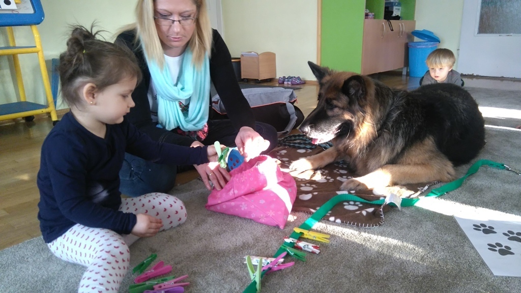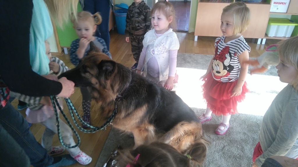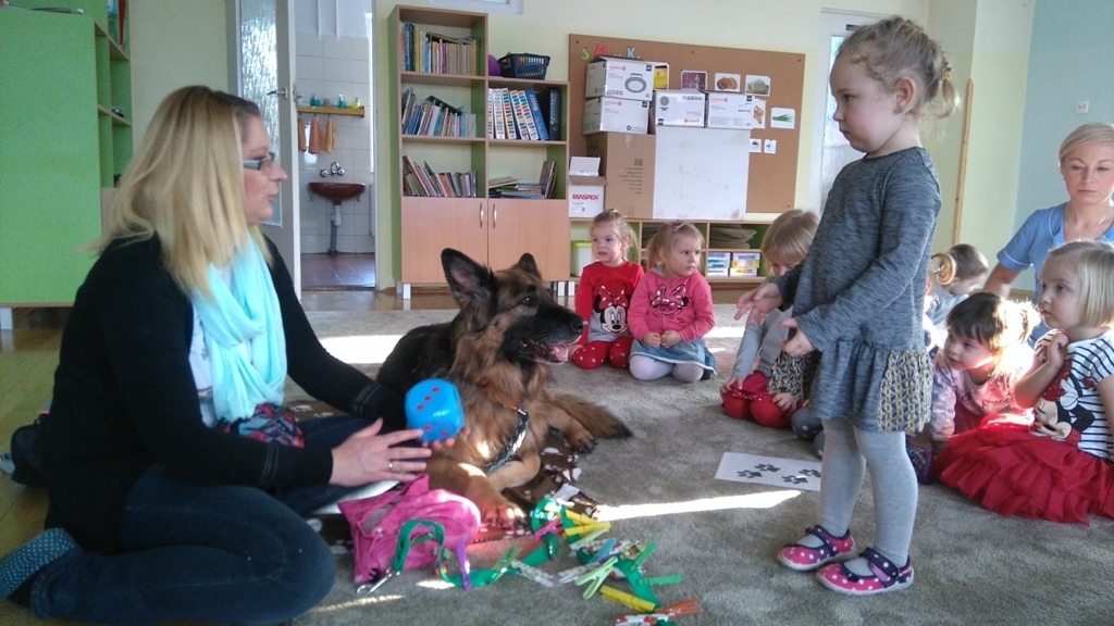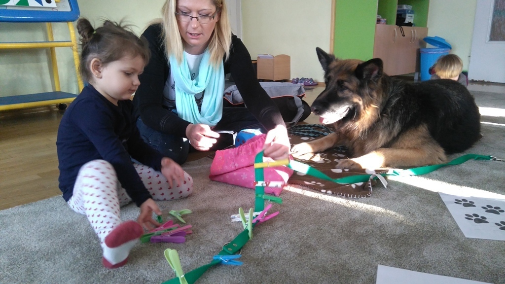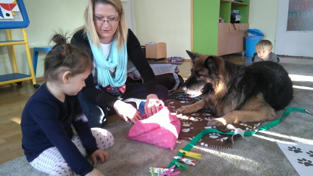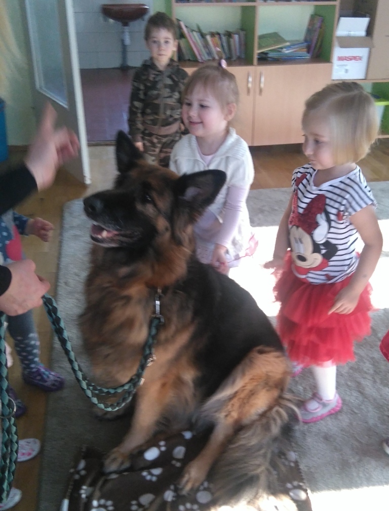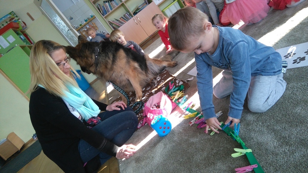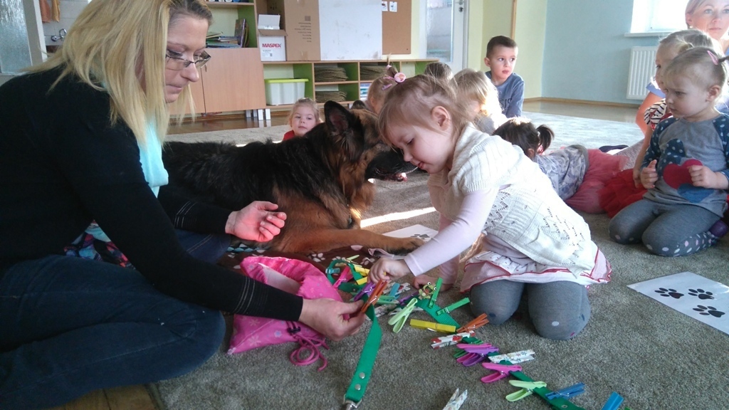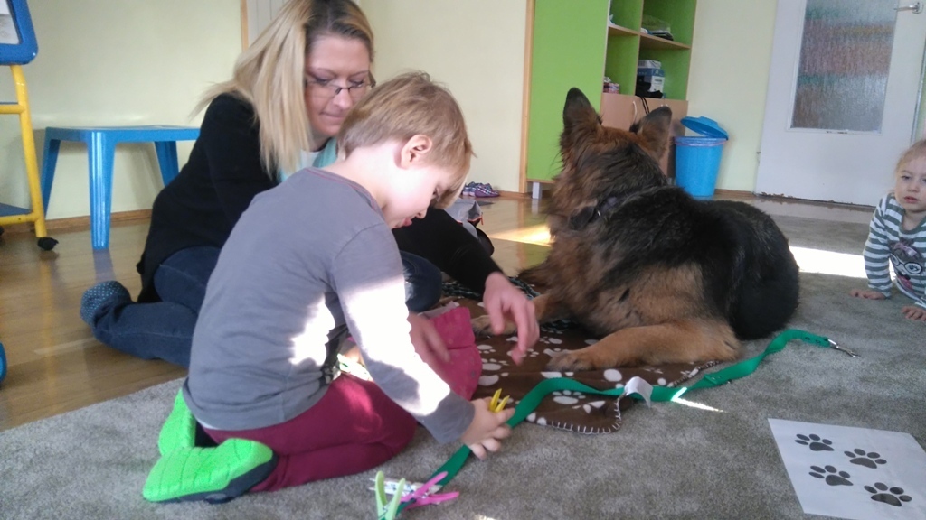 Dzisiejszego dnia przybiegł do nas gość, nazywa się Wandzia – już mieliśmy kiedyś możliwość go poznać. Nasze zadanie polegało na udekorowaniu jej smyczy. Po kolei rzucaliśmy kostką. Liczba kropek oznaczała ilość kolorowych spinaczy, które przyczepialiśmy do smyczy. Następnie wszyscy musieliśmy odpinać kolorowe spinacze ze smyczy i schować do torebki. Każdy mógł pogłaskać psa, a nawet przytulić. Nauczyliśmy się tego dnia, że psy to bardzo miłe i łagodne zwierzęta.