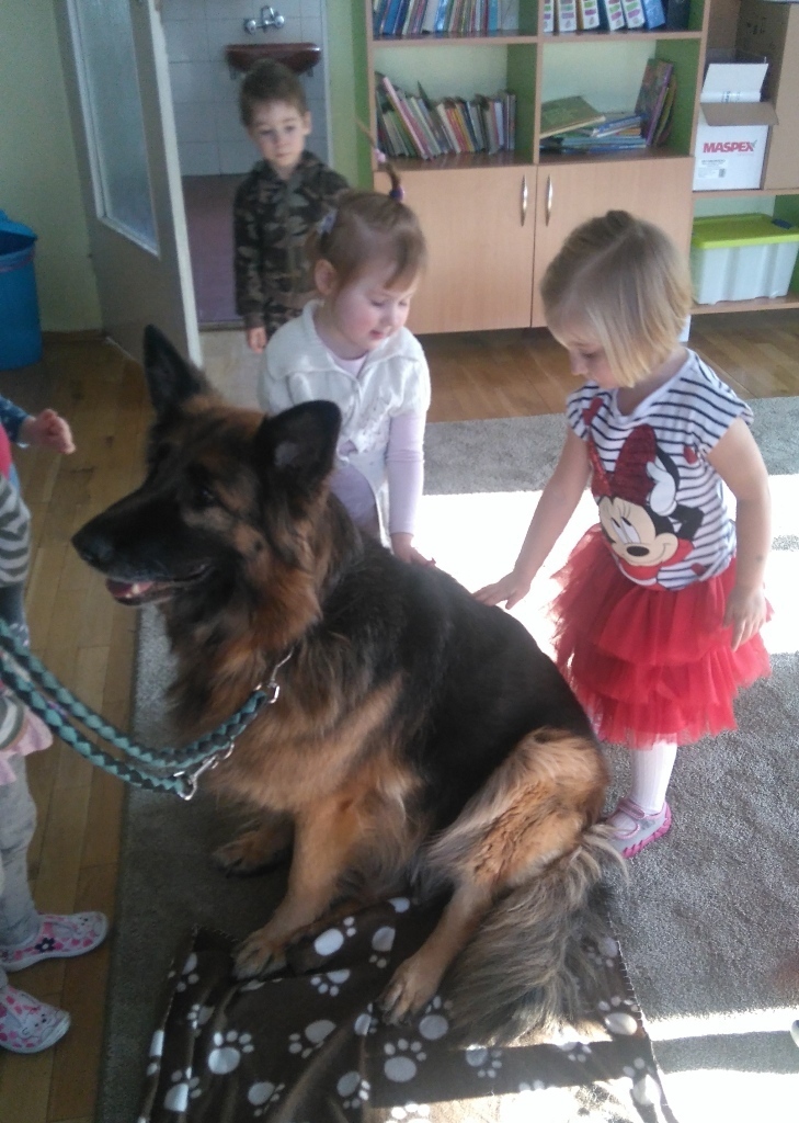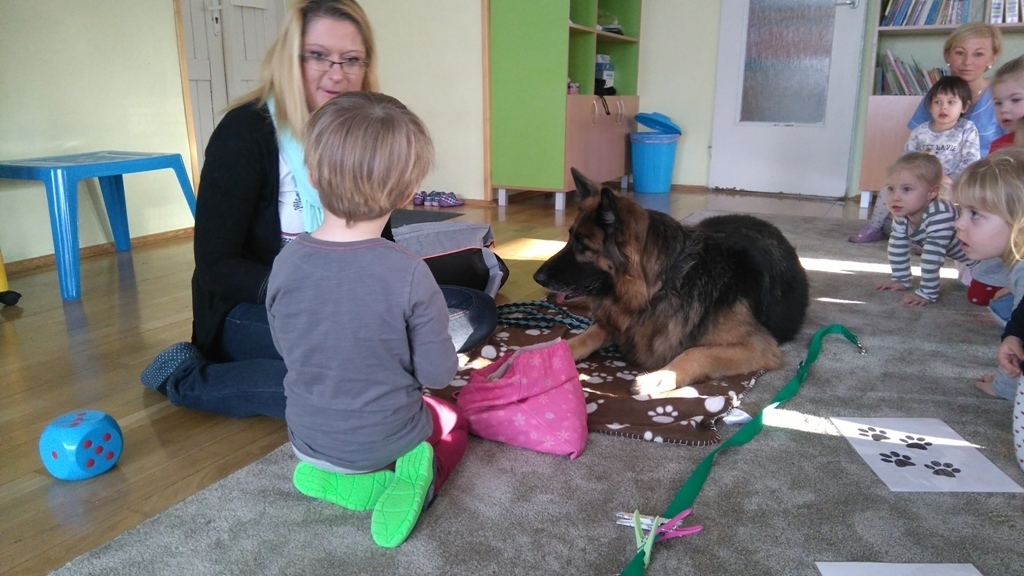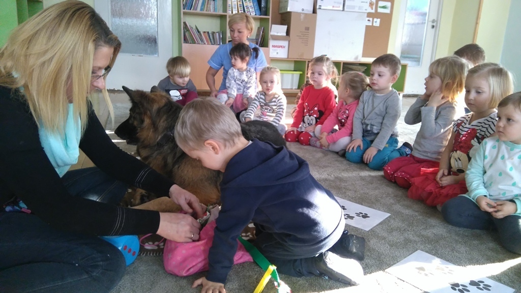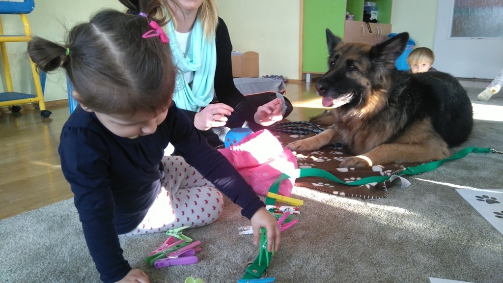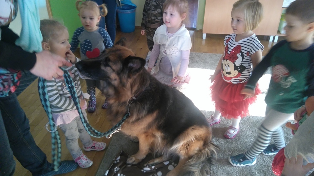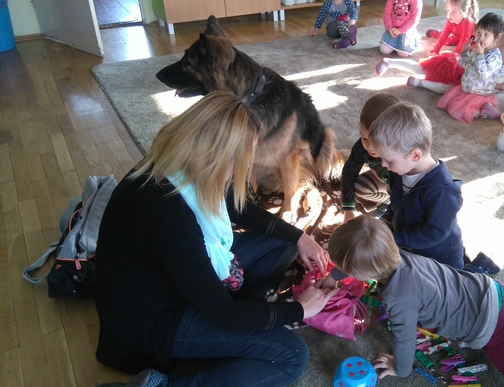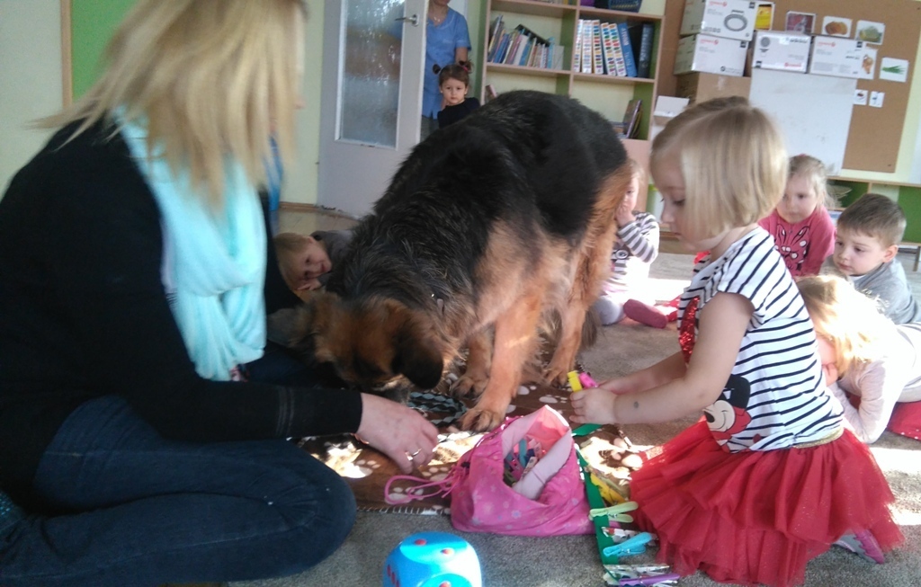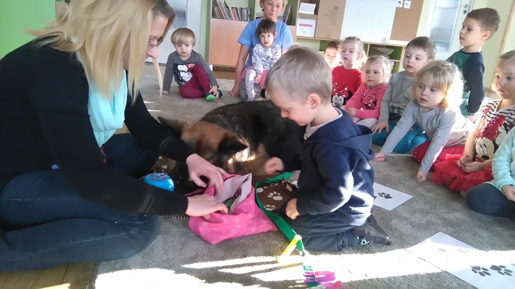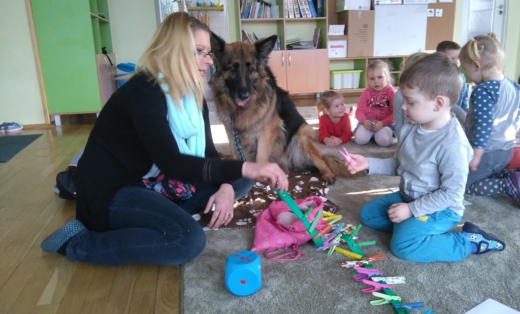 Dzisiejszego dnia przybiegł do nas gość, nazywa się Wandzia – już mieliśmy kiedyś możliwość go poznać. Nasze zadanie polegało na udekorowaniu jej smyczy. Po kolei rzucaliśmy kostką. Liczba kropek oznaczała ilość kolorowych spinaczy, które przyczepialiśmy do smyczy. Następnie wszyscy musieliśmy odpinać kolorowe spinacze ze smyczy i schować do torebki. Każdy mógł pogłaskać psa, a nawet przytulić. Nauczyliśmy się tego dnia, że psy to bardzo miłe i łagodne zwierzęta.