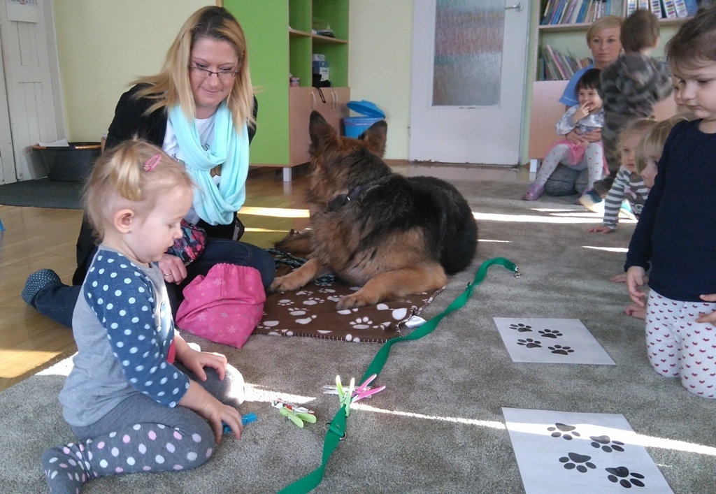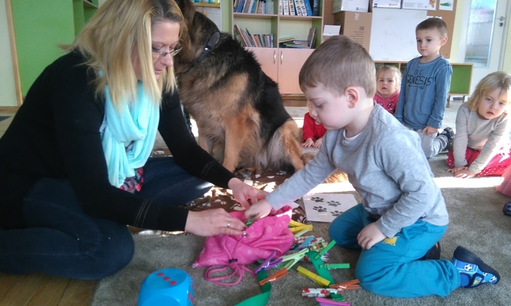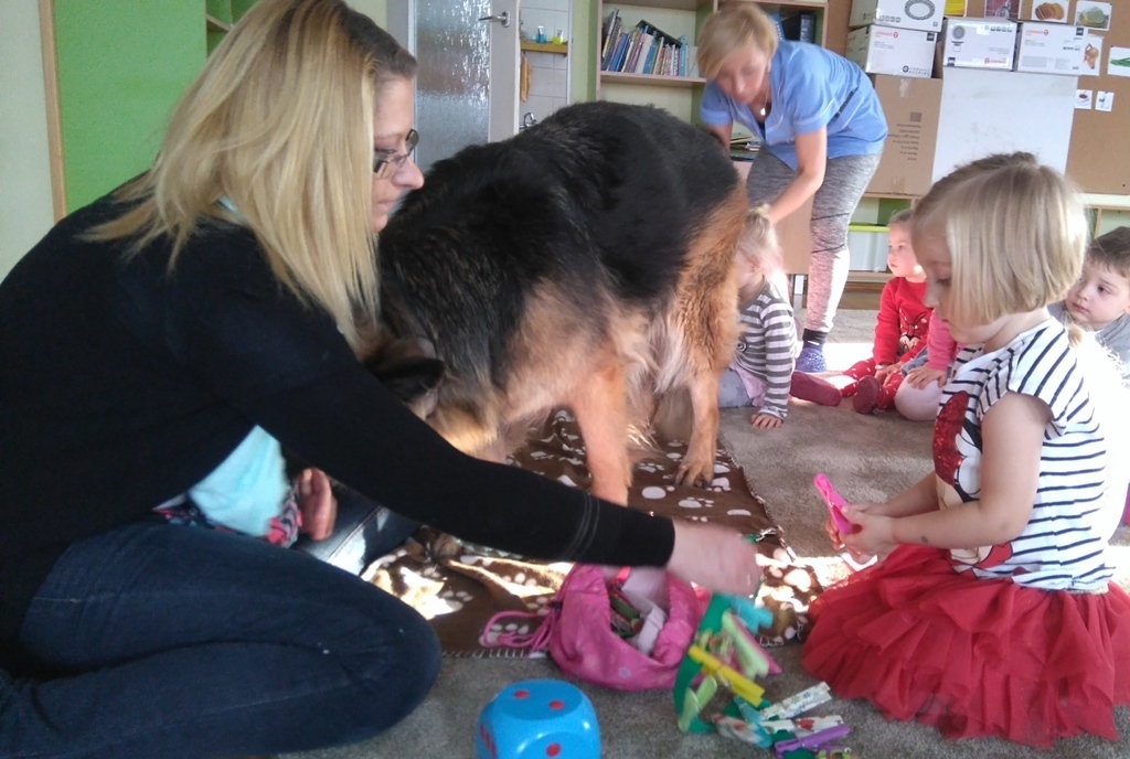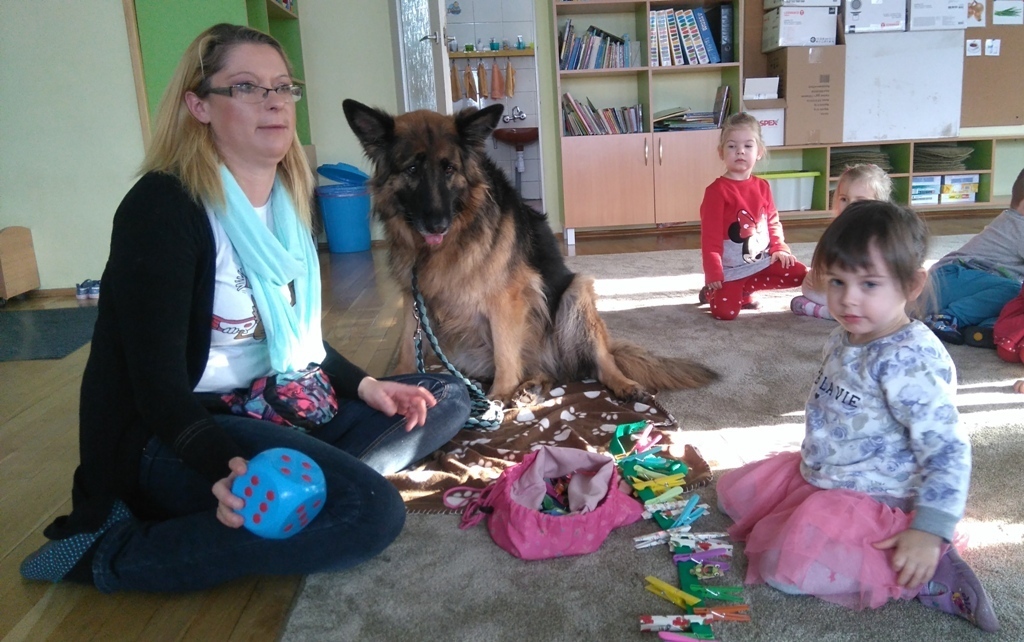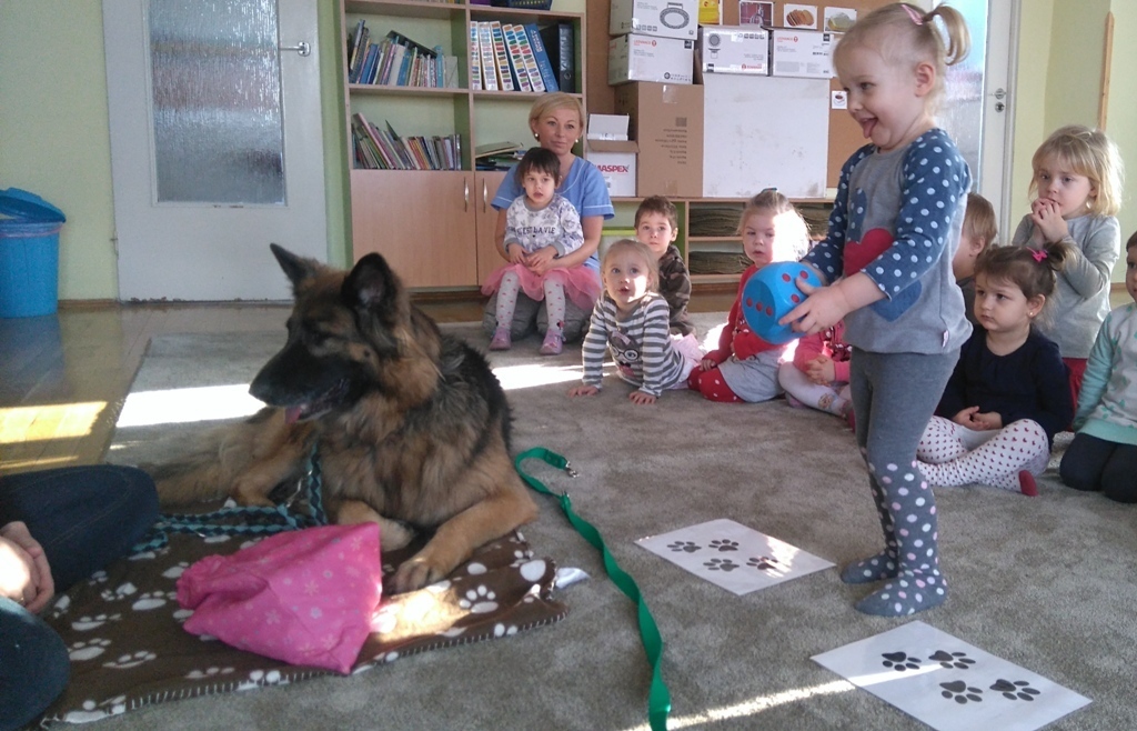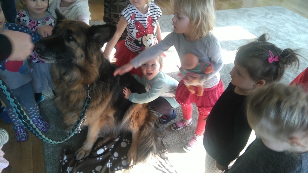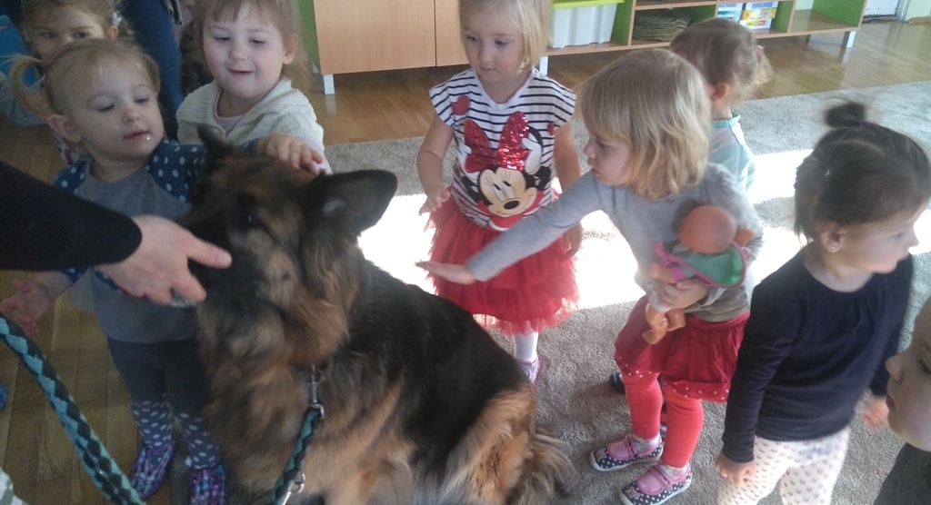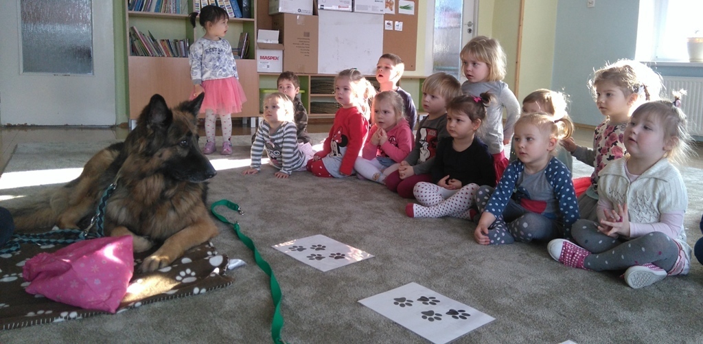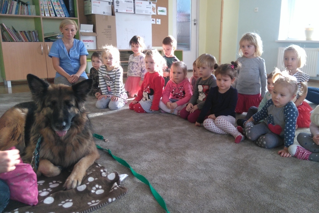 Dzisiejszego dnia przybiegł do nas gość, nazywa się Wandzia – już mieliśmy kiedyś możliwość go poznać. Nasze zadanie polegało na udekorowaniu jej smyczy. Po kolei rzucaliśmy kostką. Liczba kropek oznaczała ilość kolorowych spinaczy, które przyczepialiśmy do smyczy. Następnie wszyscy musieliśmy odpinać kolorowe spinacze ze smyczy i schować do torebki. Każdy mógł pogłaskać psa, a nawet przytulić. Nauczyliśmy się tego dnia, że psy to bardzo miłe i łagodne zwierzęta.