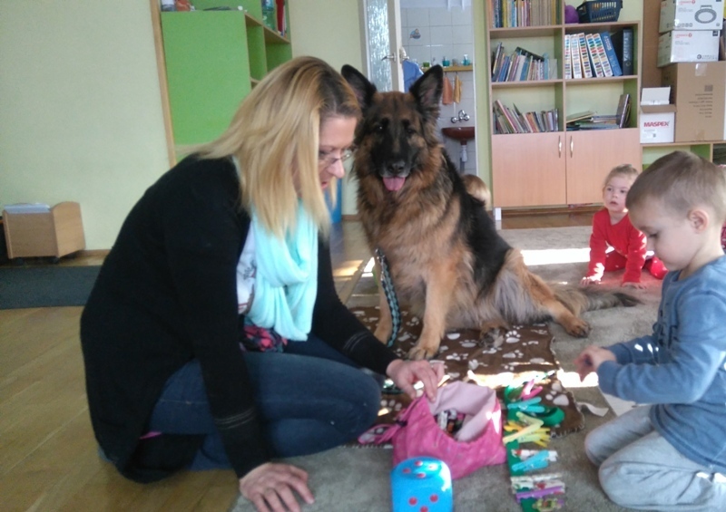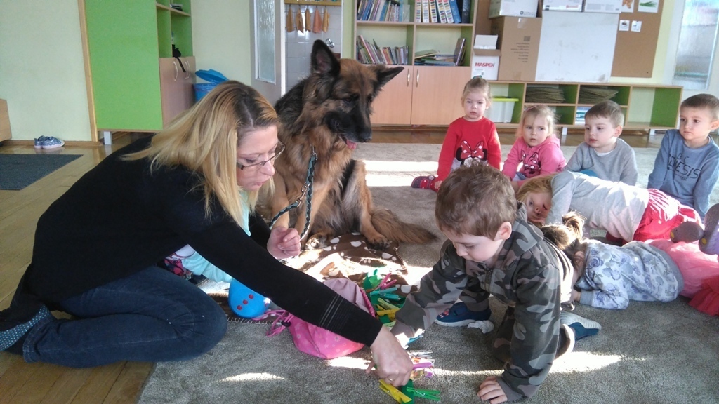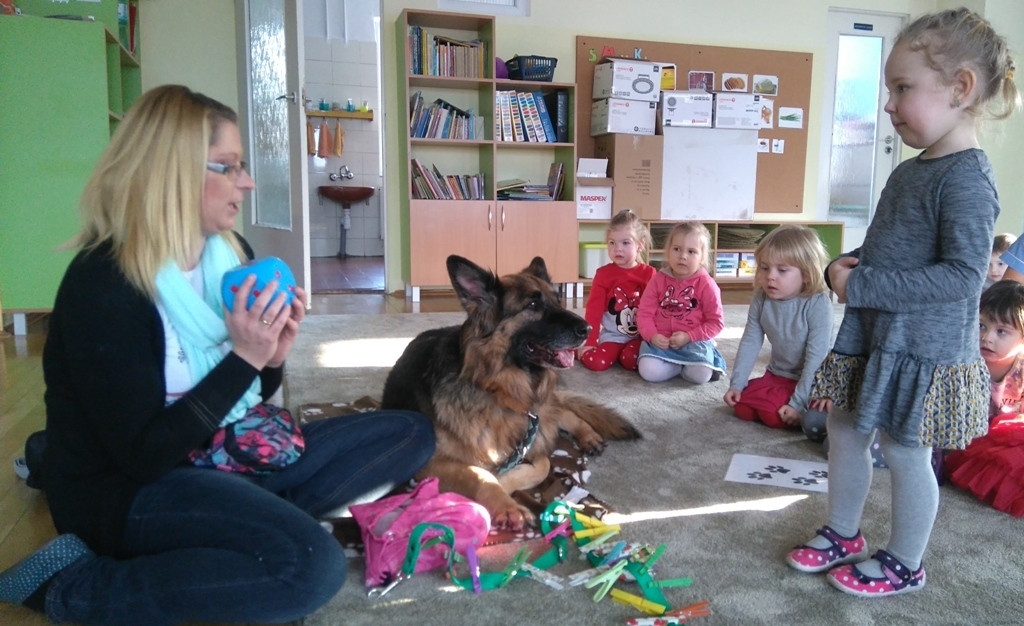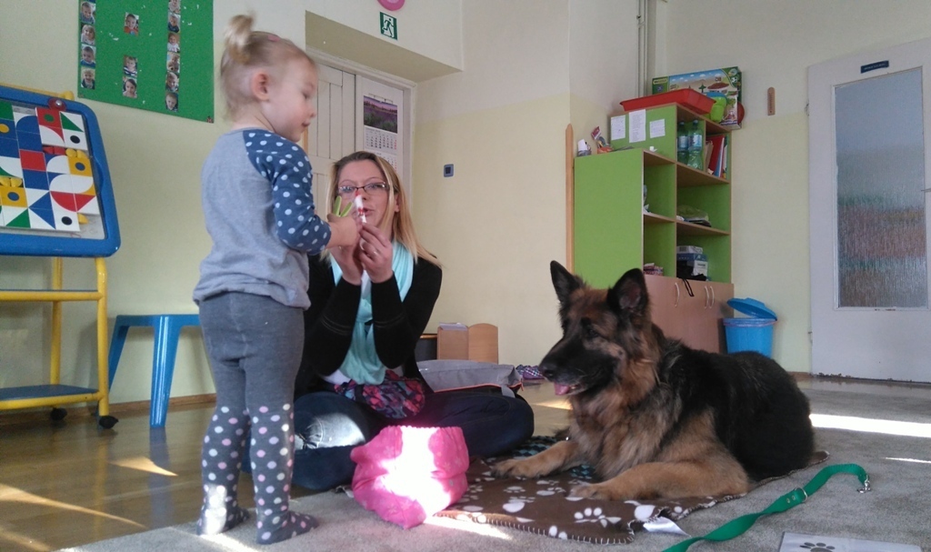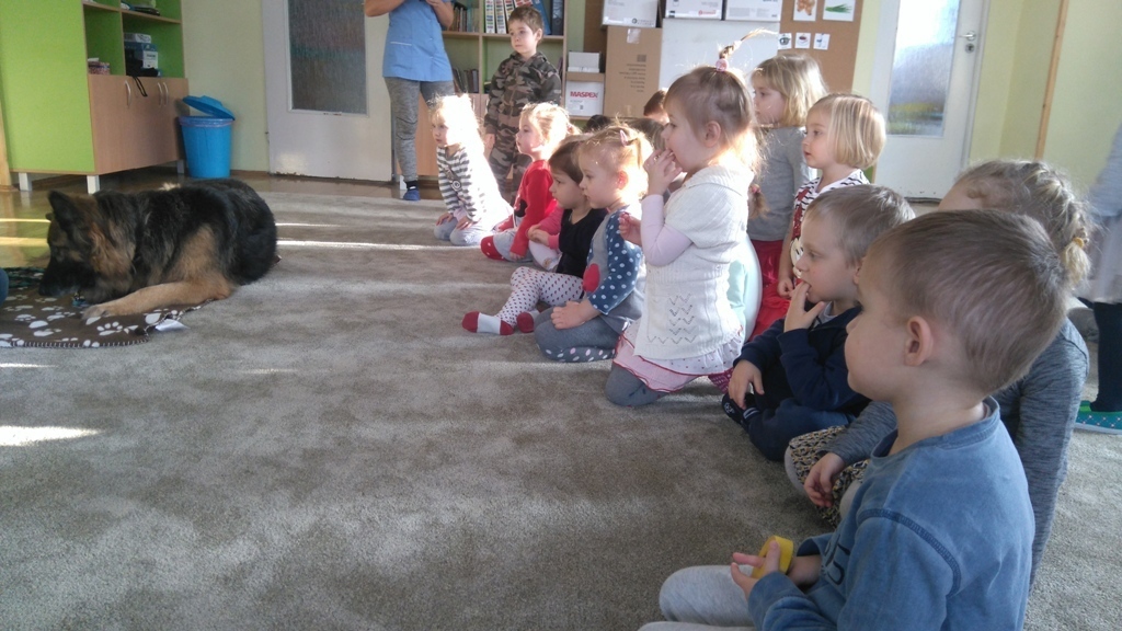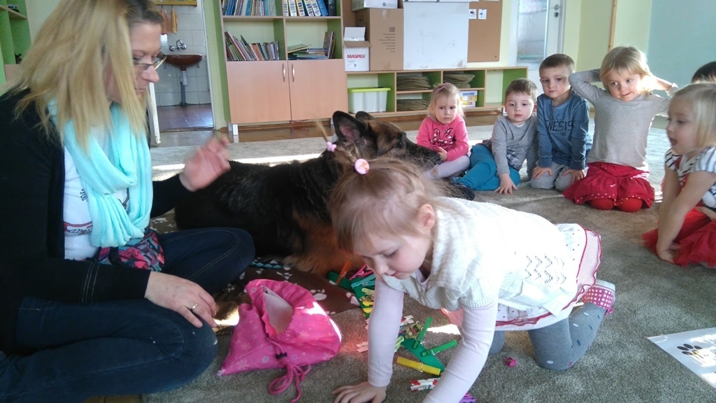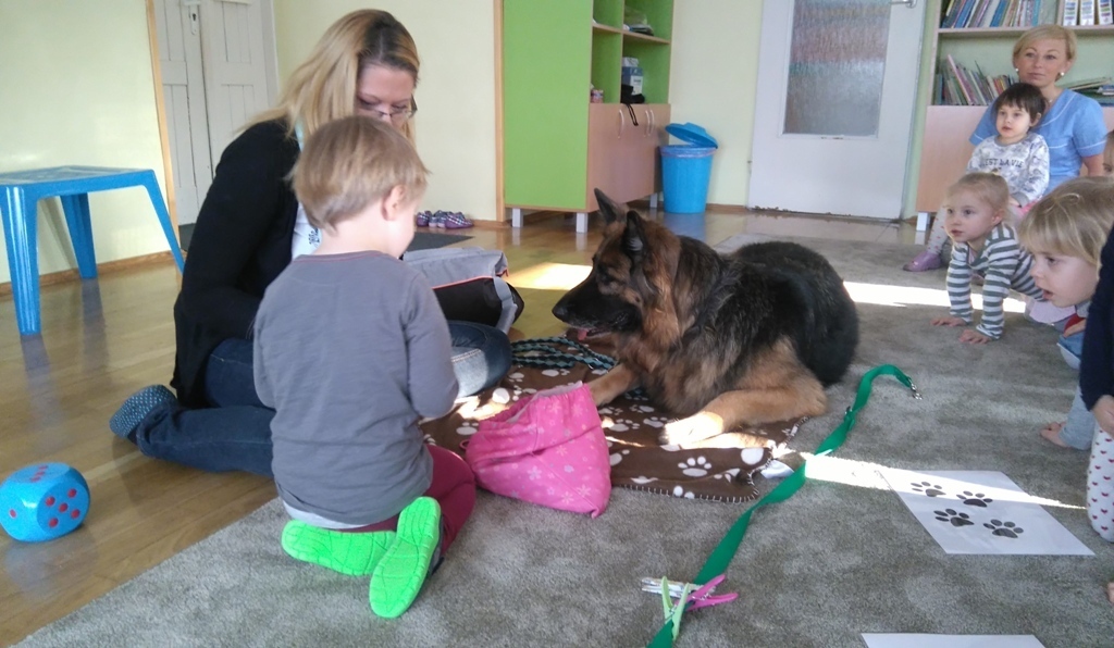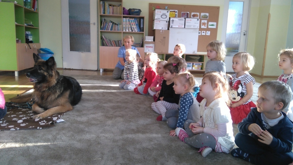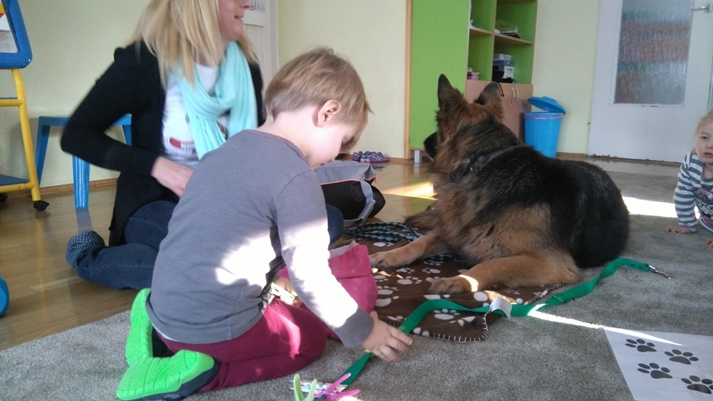 Dzisiejszego dnia przybiegł do nas gość, nazywa się Wandzia – już mieliśmy kiedyś możliwość go poznać. Nasze zadanie polegało na udekorowaniu jej smyczy. Po kolei rzucaliśmy kostką. Liczba kropek oznaczała ilość kolorowych spinaczy, które przyczepialiśmy do smyczy. Następnie wszyscy musieliśmy odpinać kolorowe spinacze ze smyczy i schować do torebki. Każdy mógł pogłaskać psa, a nawet przytulić. Nauczyliśmy się tego dnia, że psy to bardzo miłe i łagodne zwierzęta.