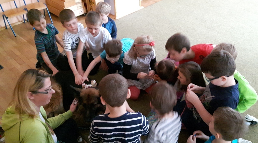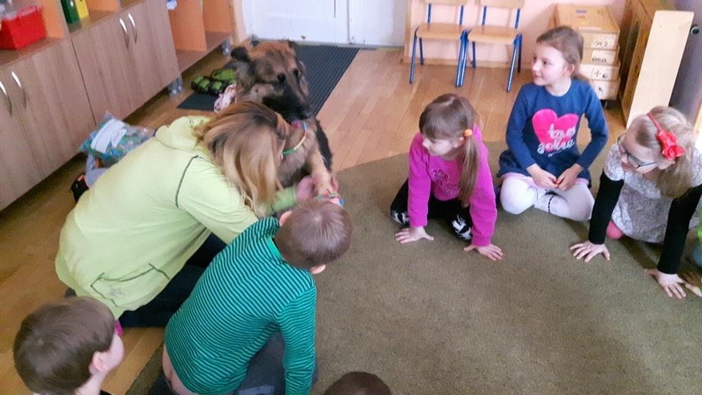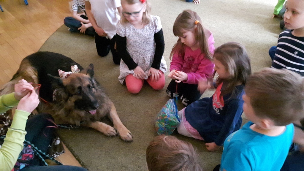 można by zaśpiewać ponieważ dziś nasz psi terapeuta obchodzi 8 urodziny. W związku z tym grupa starszaków wykonała prezenty w postaci naszyjnika i bransoletki. Starszaki dzięki tym zajęciom miały kolejną okazję do ćwiczenia zręczności poprzez nawlekaniu korali na tasiemkę. Mogły też doskonalić umiejętności pracy w grupie ponieważ chłopcy i dziewczynki osobno przygotowali prezenty dla Wandzi.