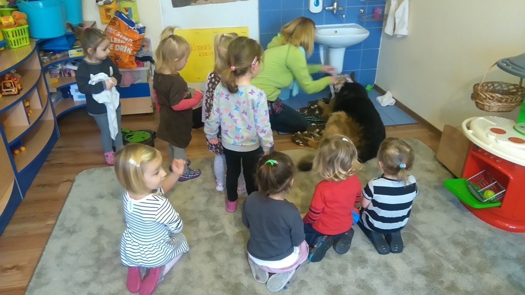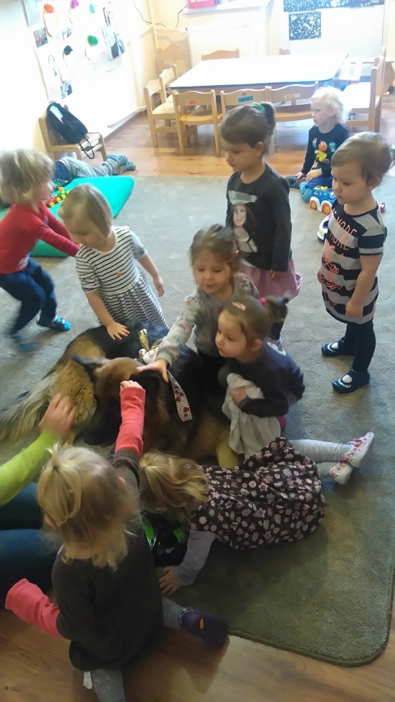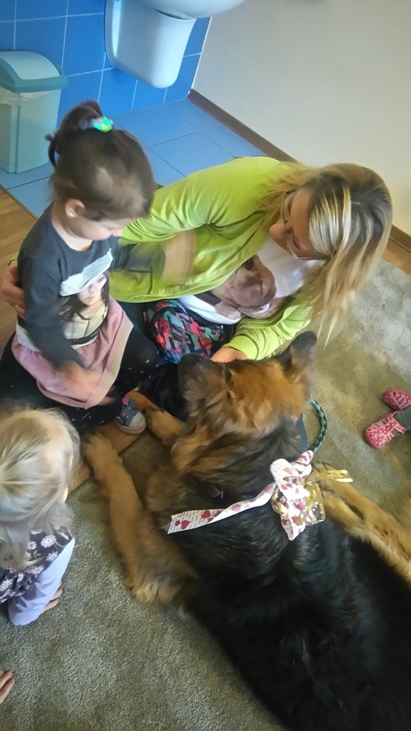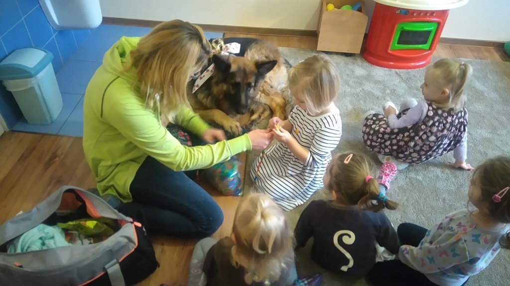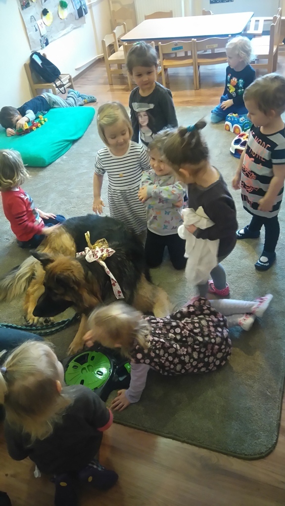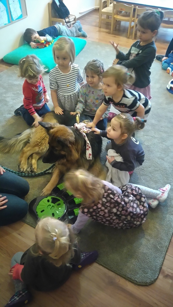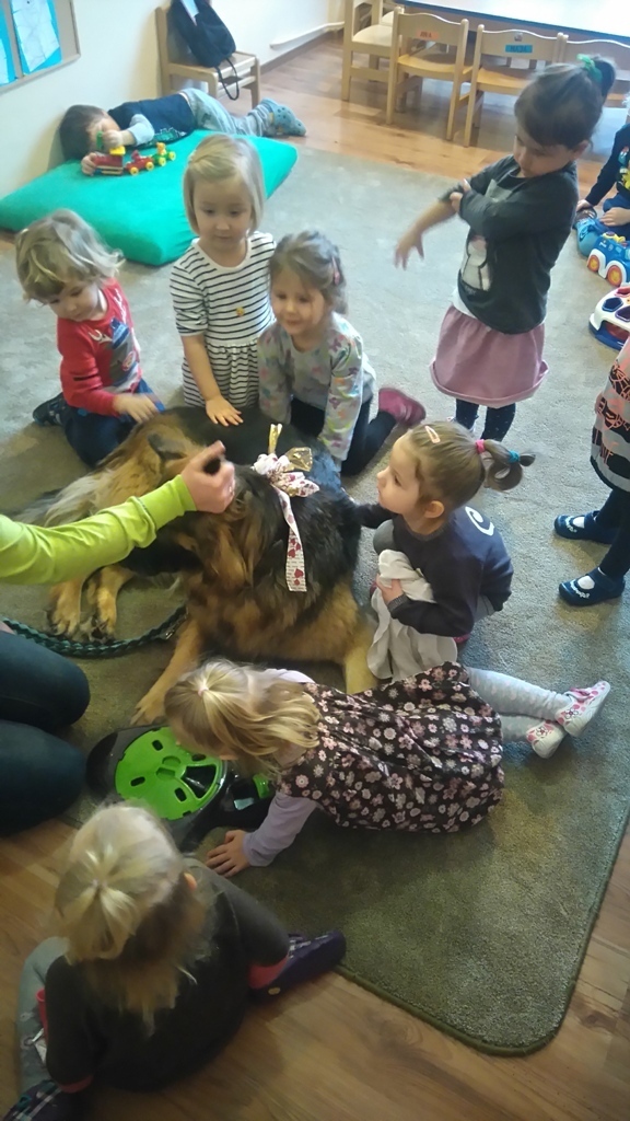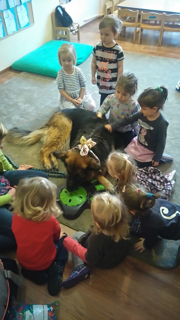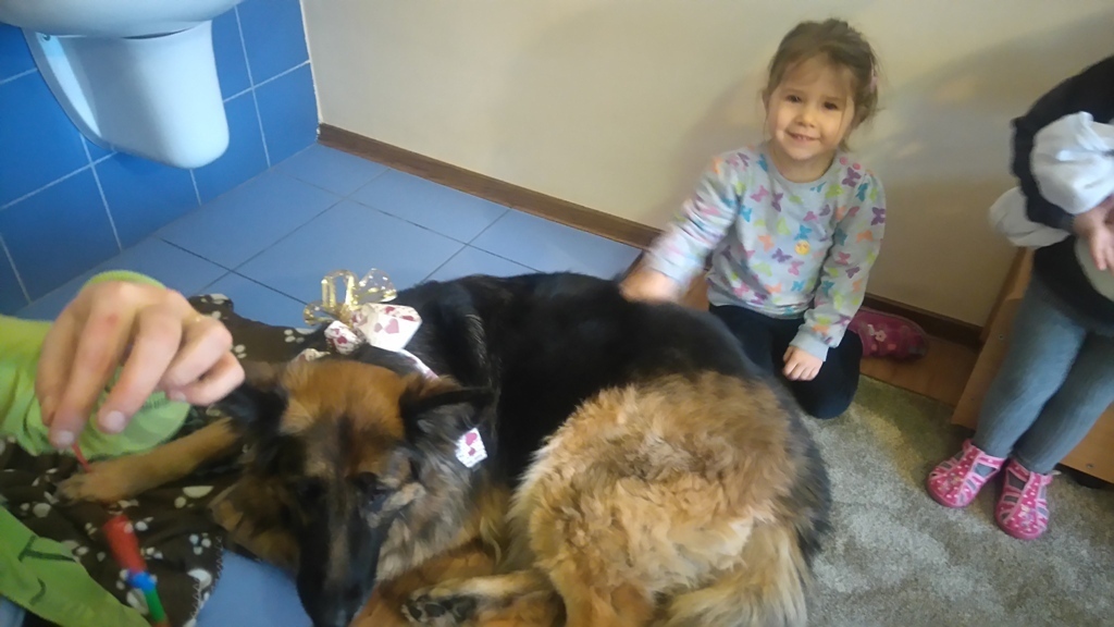 W tak wyjątkowy dzień, jaki jest dzisiaj odwiedziła nas nasza ulubiona koleżanka – Wandzia. Wandzia dzisiaj skończyła 8 lat i przyszła świętować swoje urodzinki z nami, przez co czuliśmy się wyróżnieni. Zaśpiewaliśmy razem 100 lat, zrobiliśmy wspólnie prezent - bransoletkę, którą Wandzi wręczyliśmy i chyba była zadowolona, bo pomachała do nas ogonem. Pani Marta pokazała nam sztuczkę, którą robi Wandzia. Za pomocą swojego mocnego węchu potrafi odnaleźć wszystkie smakołyki ukryte przez nas w swojej zabawce i je zjeść. Dzisiejsze spotkanie nauczyło nas, że zwierzęta tak jak ludzie mają uczucia i trzeba je zawsze dobrze traktować.
