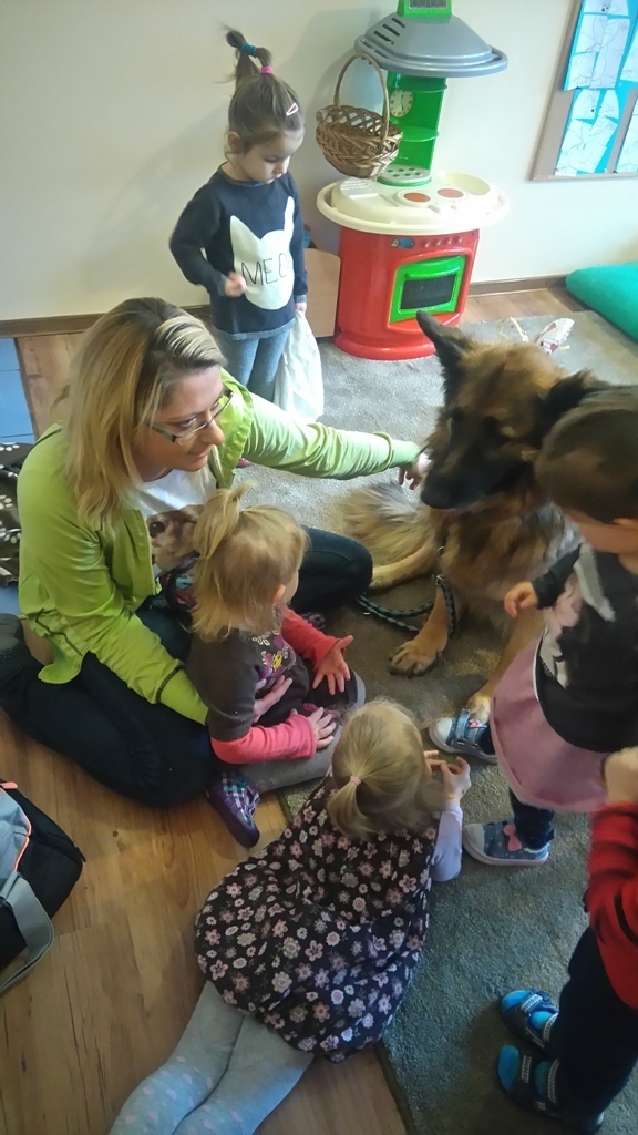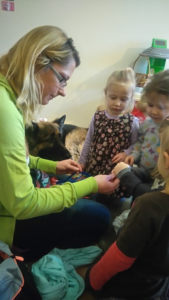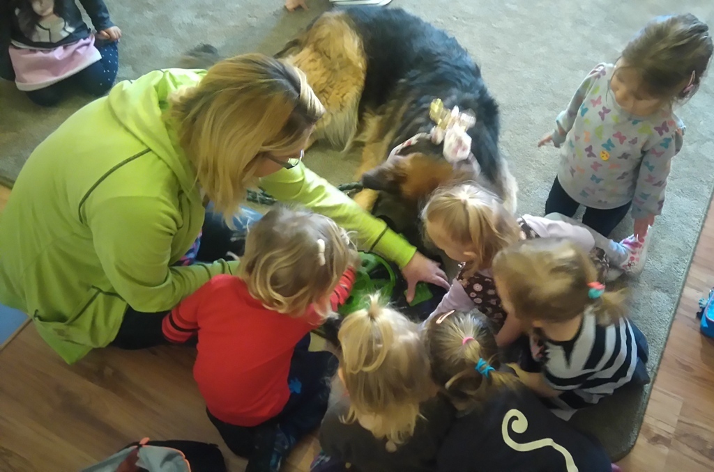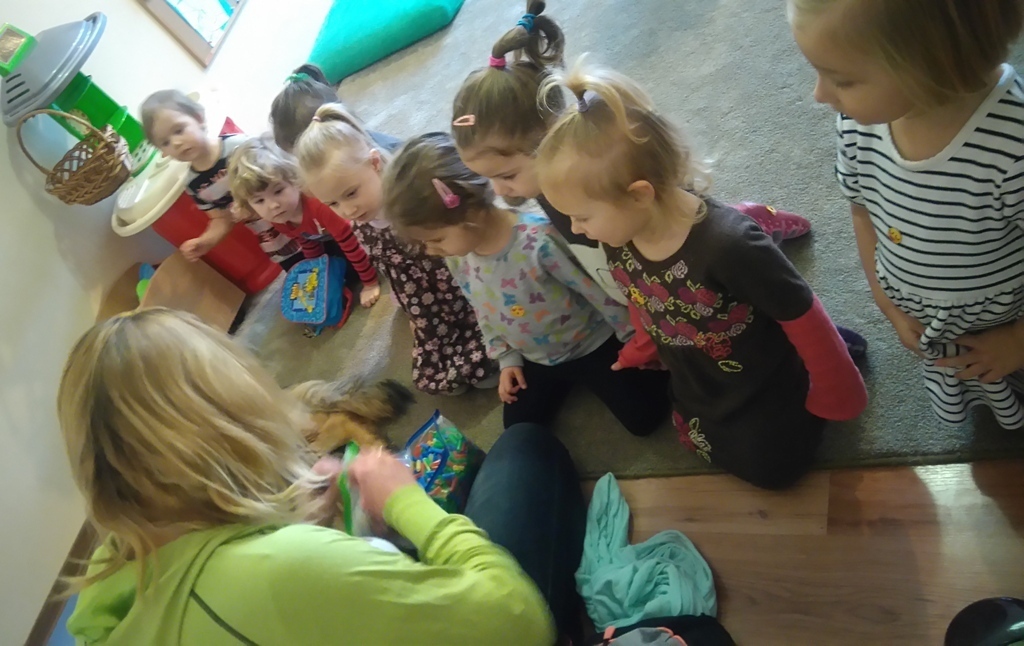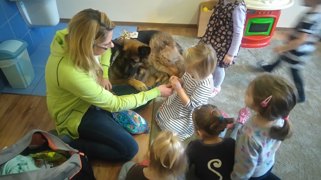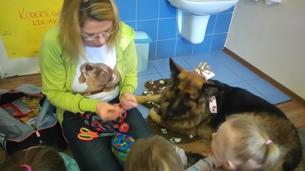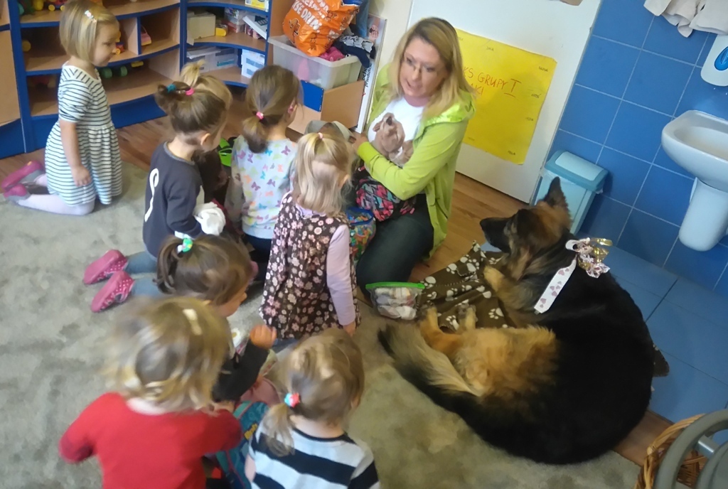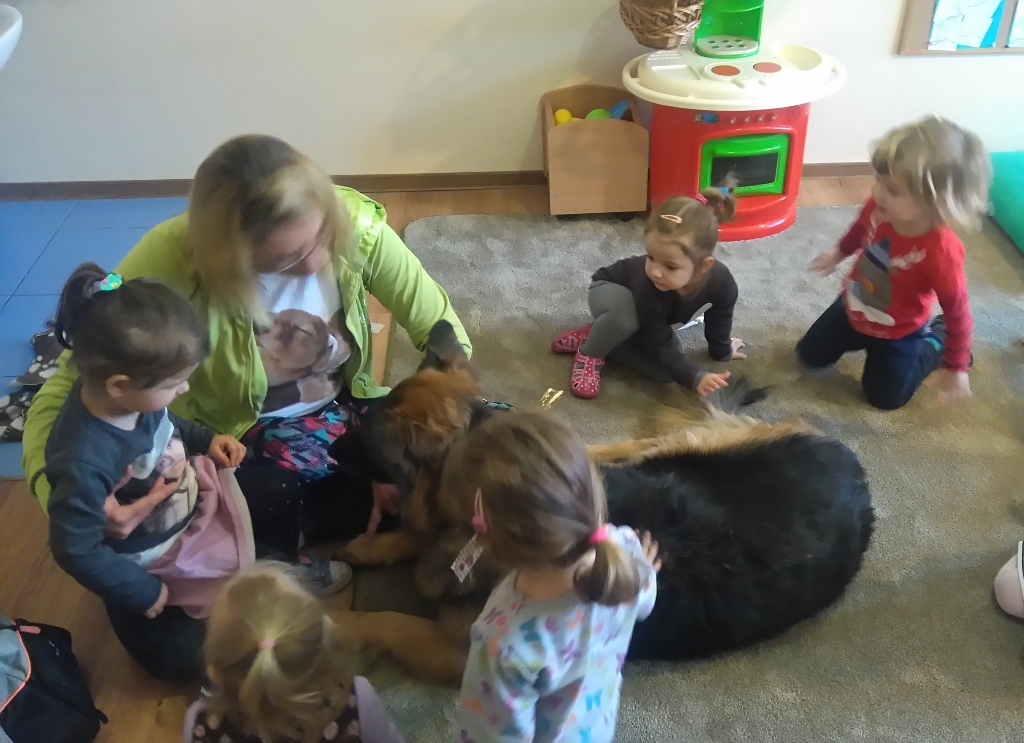W tak wyjątkowy dzień, jaki jest dzisiaj odwiedziła nas nasza ulubiona koleżanka – Wandzia. Wandzia dzisiaj skończyła 8 lat i przyszła świętować swoje urodzinki z nami, przez co czuliśmy się wyróżnieni. Zaśpiewaliśmy razem 100 lat, zrobiliśmy wspólnie prezent - bransoletkę, którą Wandzi wręczyliśmy i chyba była zadowolona, bo pomachała do nas ogonem. Pani Marta pokazała nam sztuczkę, którą robi Wandzia. Za pomocą swojego mocnego węchu potrafi odnaleźć wszystkie smakołyki ukryte przez nas w swojej zabawce i je zjeść. Dzisiejsze spotkanie nauczyło nas, że zwierzęta tak jak ludzie mają uczucia i trzeba je zawsze dobrze traktować.
