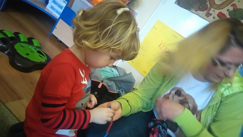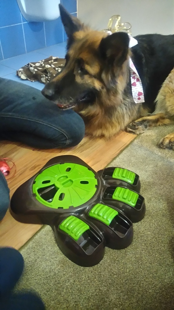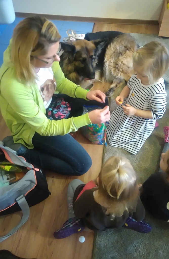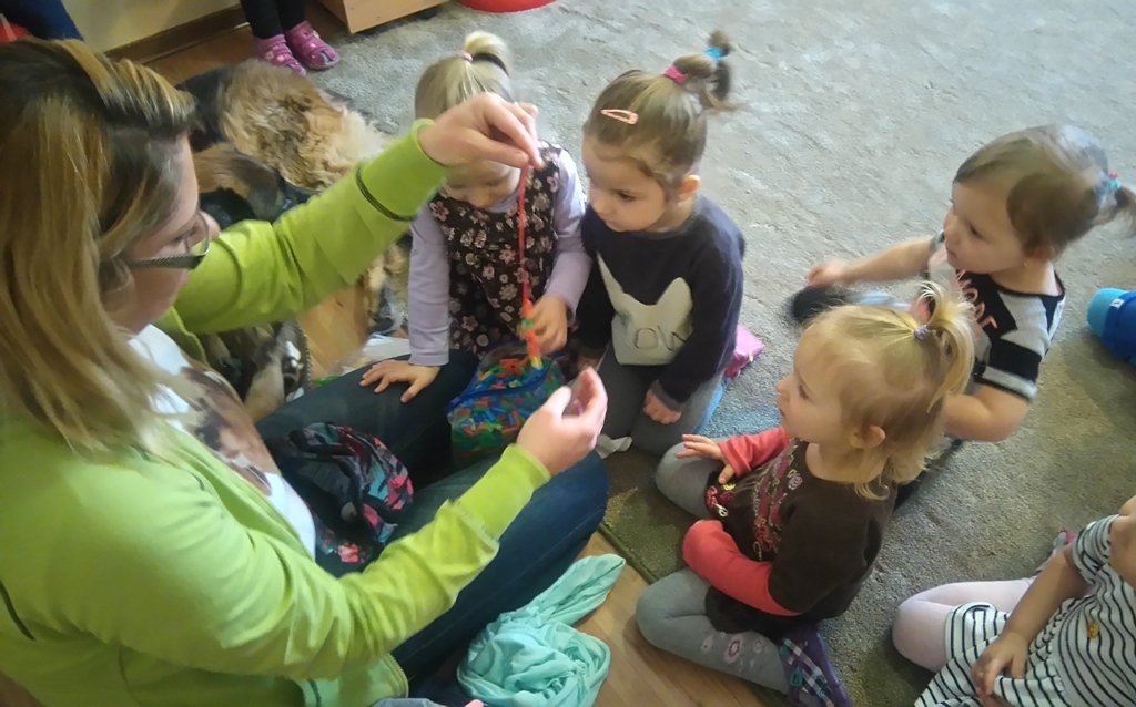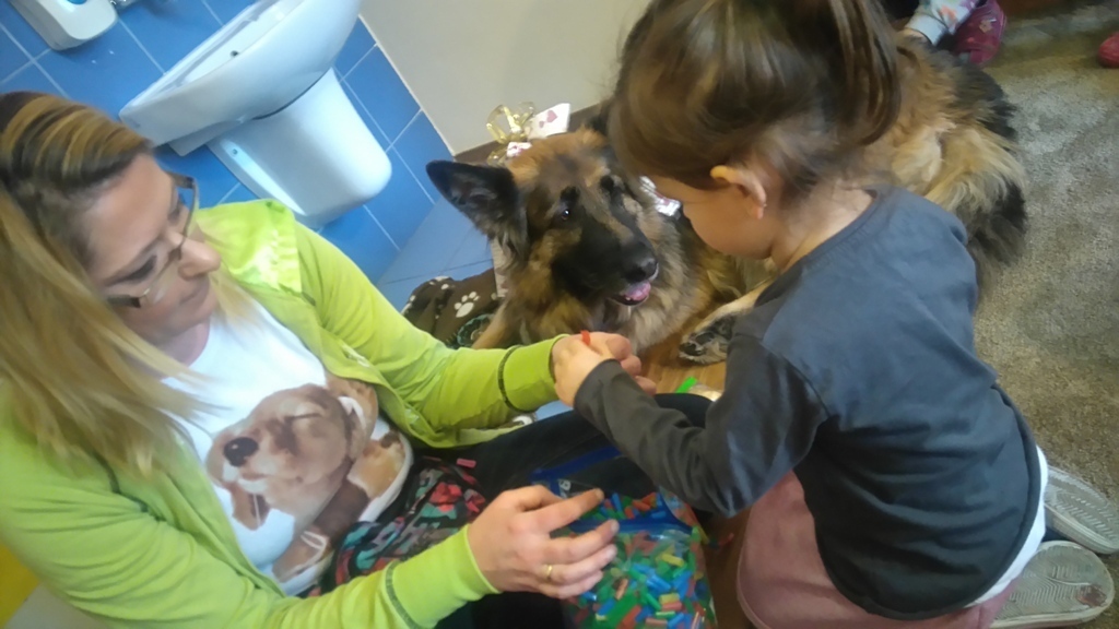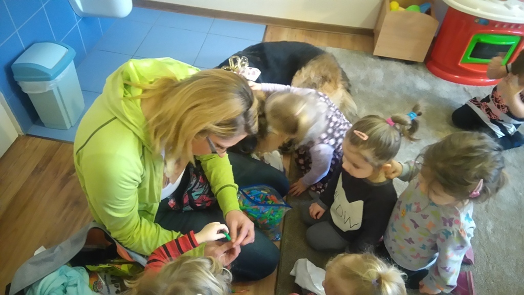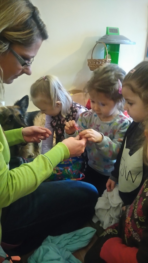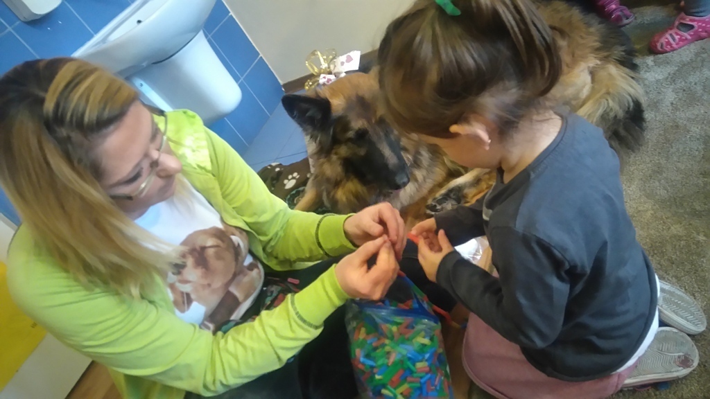 W tak wyjątkowy dzień, jaki jest dzisiaj odwiedziła nas nasza ulubiona koleżanka – Wandzia. Wandzia dzisiaj skończyła 8 lat i przyszła świętować swoje urodzinki z nami, przez co czuliśmy się wyróżnieni. Zaśpiewaliśmy razem 100 lat, zrobiliśmy wspólnie prezent - bransoletkę, którą Wandzi wręczyliśmy i chyba była zadowolona, bo pomachała do nas ogonem. Pani Marta pokazała nam sztuczkę, którą robi Wandzia. Za pomocą swojego mocnego węchu potrafi odnaleźć wszystkie smakołyki ukryte przez nas w swojej zabawce i je zjeść. Dzisiejsze spotkanie nauczyło nas, że zwierzęta tak jak ludzie mają uczucia i trzeba je zawsze dobrze traktować.