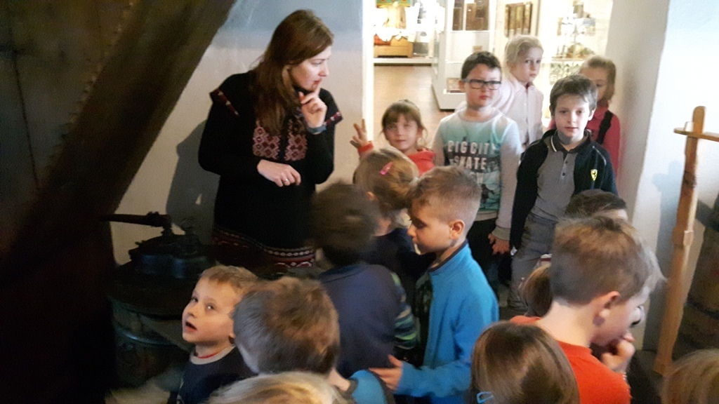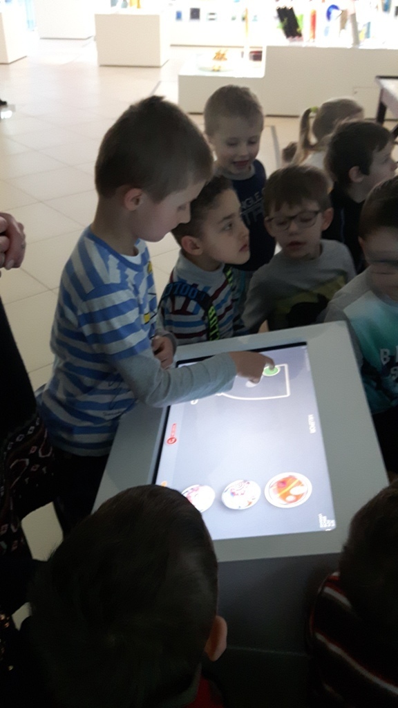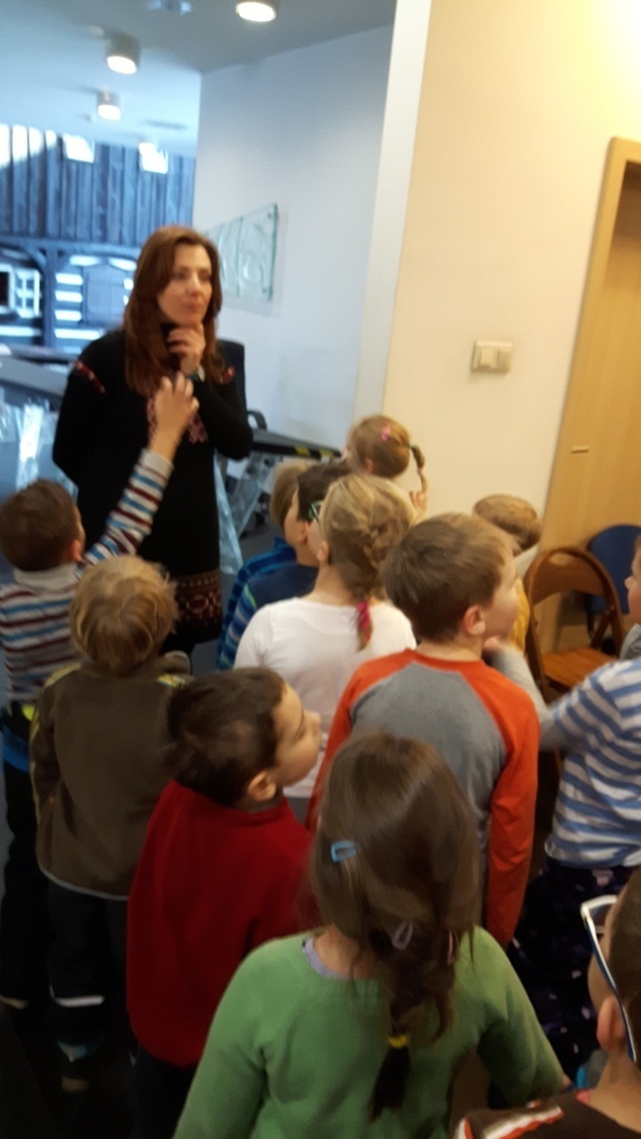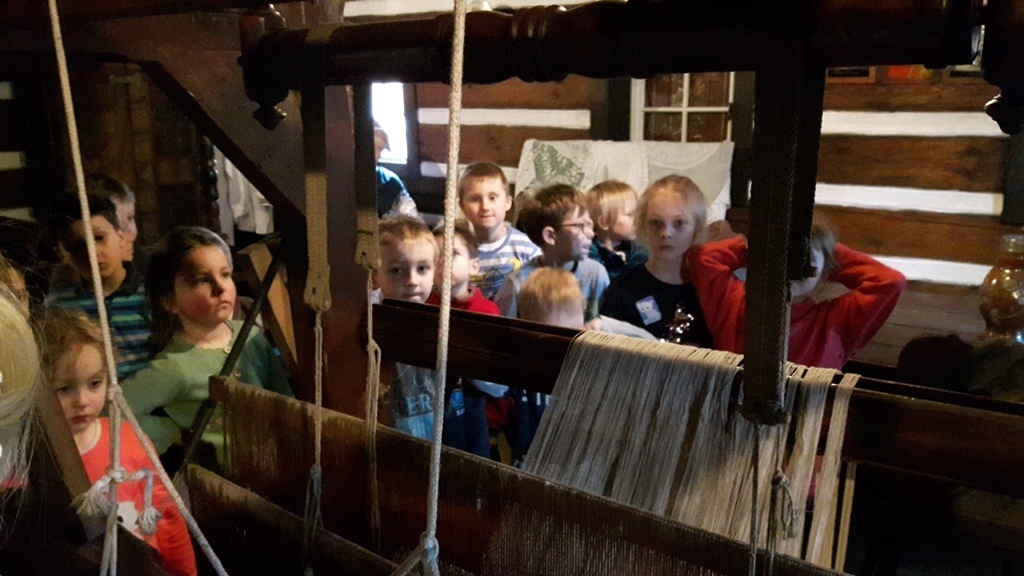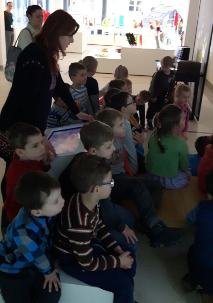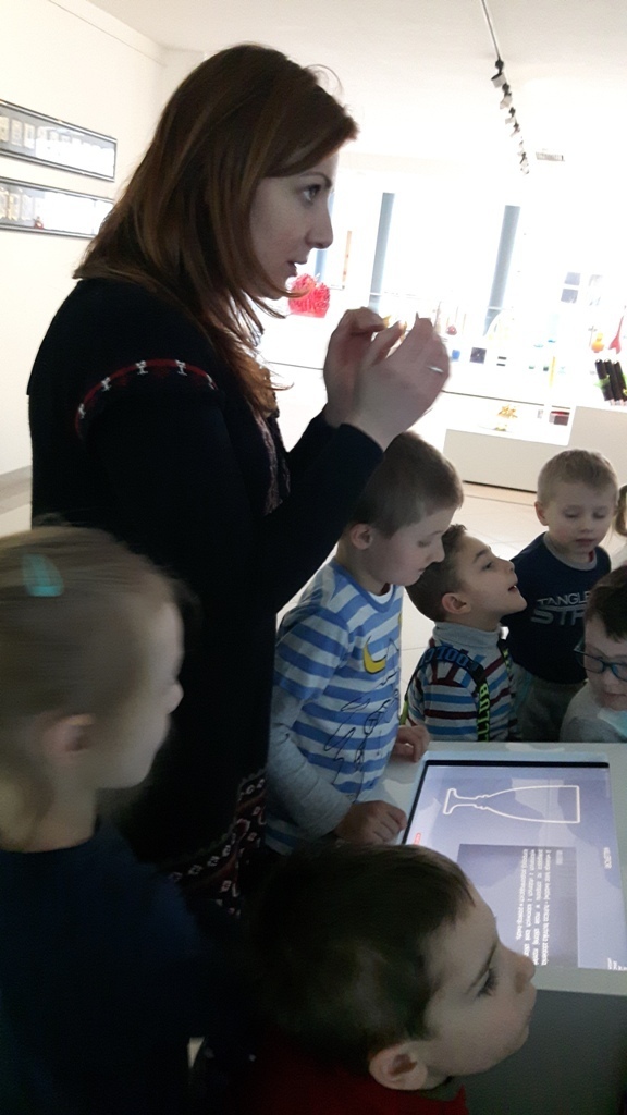 W dniu dzisiejszym dwie najstarsze grupy wybrały się do Muzeum Karkonoskiego, aby wraz z panią przewodnik obejrzeć część bardzo bogatej wystawy. Starszaki poznały znaczenie słowa eksponat. Utrwaliły zasady odpowiedniego zachowania w muzeum. Dzieci poza fascynującą, bo multimedialną prezentacją wyrobu szkła, miały możliwość wirtualnego zdobienia wazonów. Przewodniczka oprowadziła również Tuptusiowe starszaki po wiejskiej chacie, w której nie było elektryczności, ani kanalizacji – co bardzo mocno zaskoczyło dzieci i zastanowiło jak wtedy wyglądało życie. Przedszkolaki przekonały się również, że pralka może działać bez prądu, a na globusie (który był eksponatem w mieszkaniu z kamienicy) nie było kontynentów, a była mapa nieba. Wszystkie widziane dziś eksponaty są niewielką częścią wystawy mieszczącej się w Muzeum Karkonoskim, do którego z pewnością jeszcze nie raz wrócimy.
