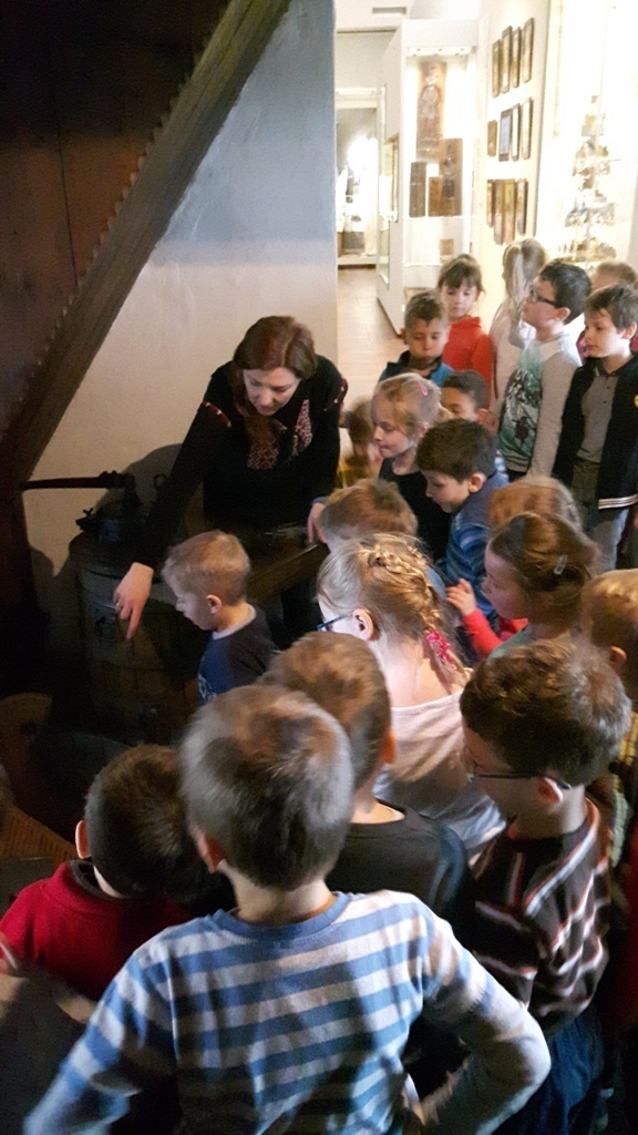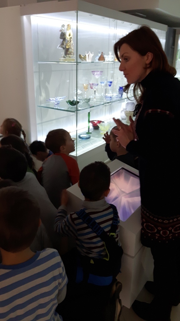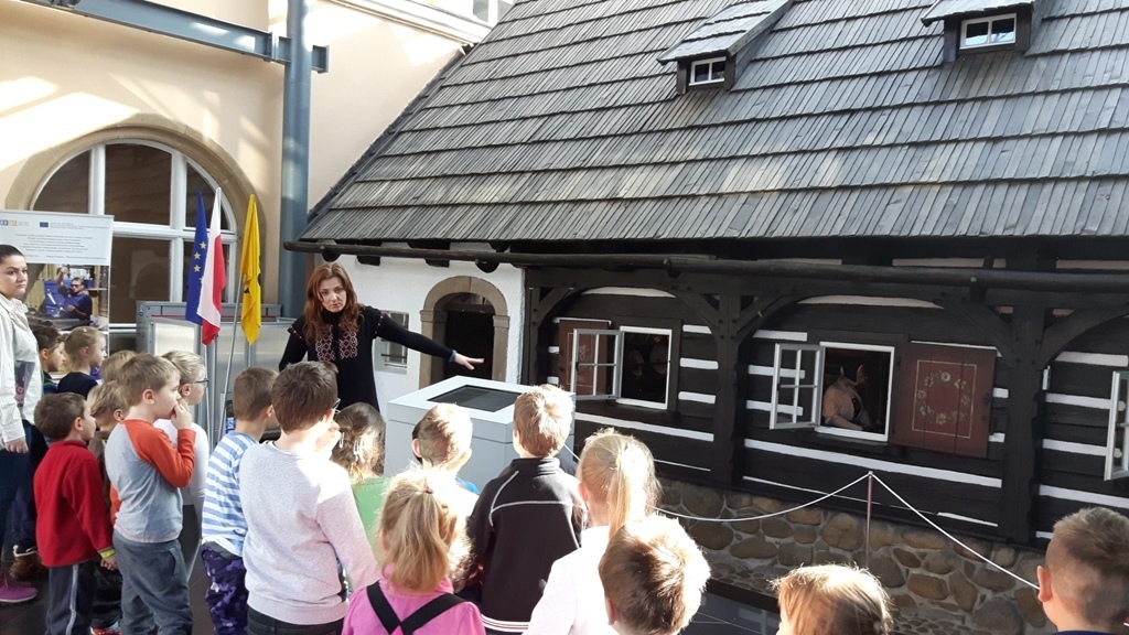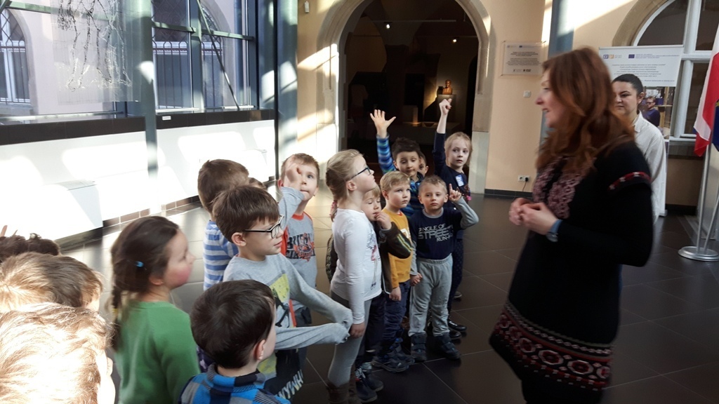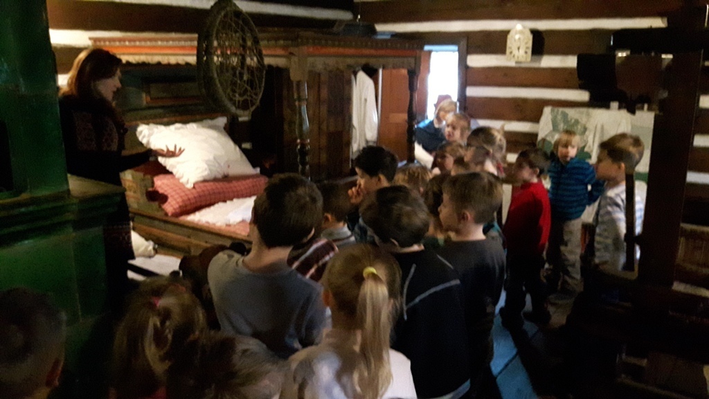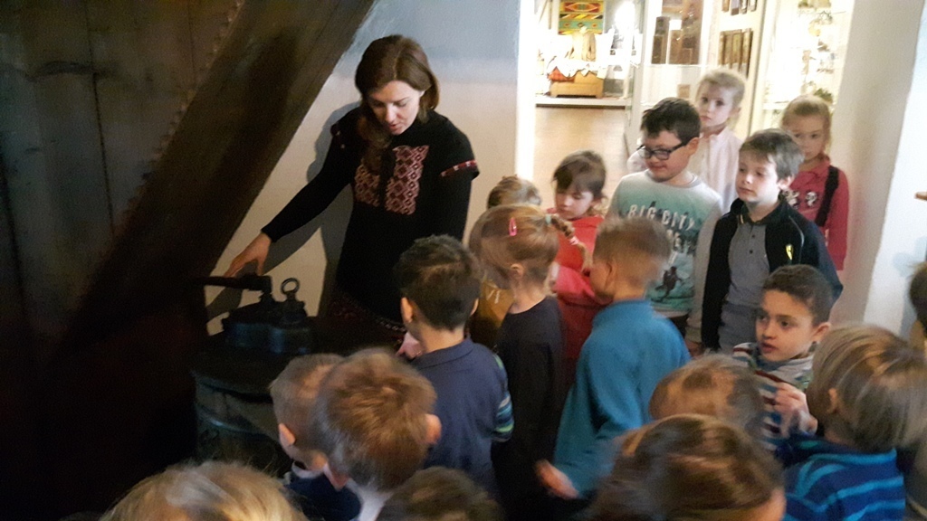 W dniu dzisiejszym dwie najstarsze grupy wybrały się do Muzeum Karkonoskiego, aby wraz z panią przewodnik obejrzeć część bardzo bogatej wystawy. Starszaki poznały znaczenie słowa eksponat. Utrwaliły zasady odpowiedniego zachowania w muzeum. Dzieci poza fascynującą, bo multimedialną prezentacją wyrobu szkła, miały możliwość wirtualnego zdobienia wazonów. Przewodniczka oprowadziła również Tuptusiowe starszaki po wiejskiej chacie, w której nie było elektryczności, ani kanalizacji – co bardzo mocno zaskoczyło dzieci i zastanowiło jak wtedy wyglądało życie. Przedszkolaki przekonały się również, że pralka może działać bez prądu, a na globusie (który był eksponatem w mieszkaniu z kamienicy) nie było kontynentów, a była mapa nieba. Wszystkie widziane dziś eksponaty są niewielką częścią wystawy mieszczącej się w Muzeum Karkonoskim, do którego z pewnością jeszcze nie raz wrócimy.