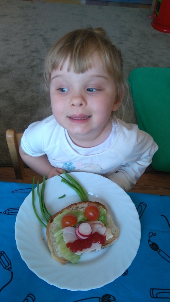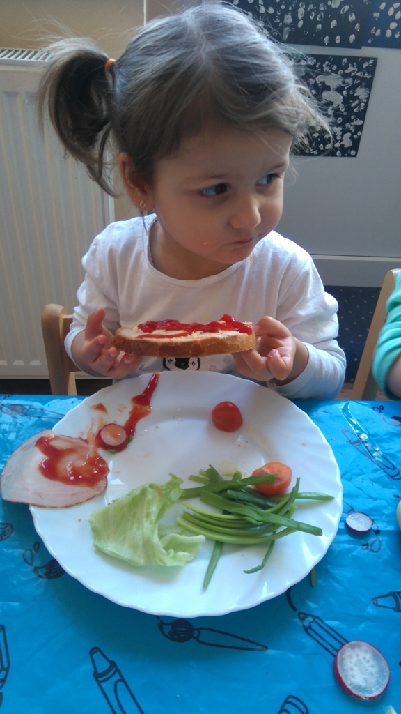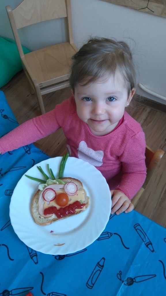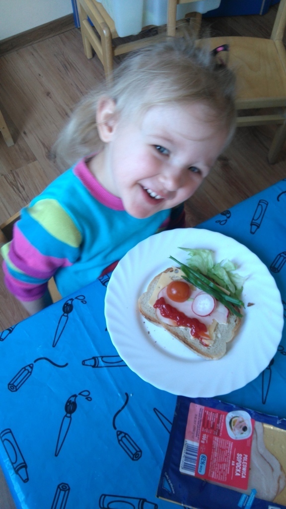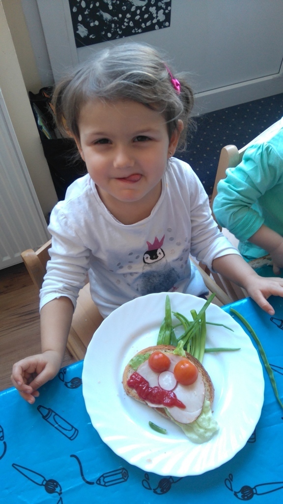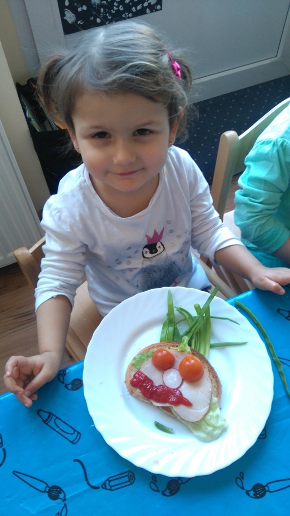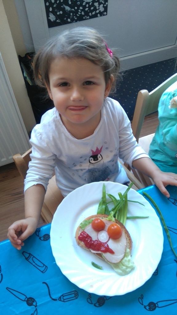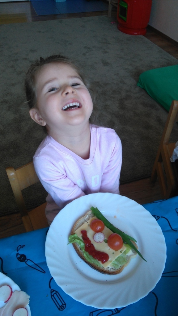 Dzisiejsze zajęcia były pyszne, ponieważ przygotowaliśmy na nich zwariowane kanapki, które możemy teraz robić razem ze swoimi rodzicami w domu na zabawę karnawałową, ponieważ od dziś potrafimy już to zrobić. Każdy z nas dostał potrzebne do wykonania zadania i mógł według własnych pomysłów stworzyć swojego, stworka, którego na koniec zajęć zjadł. Dzięki kanapeczkom mieliśmy okazję przypomnieć sobie wygląd i smak warzyw, a także spróbowaliśmy posmarować chleb masłem używając noża.
