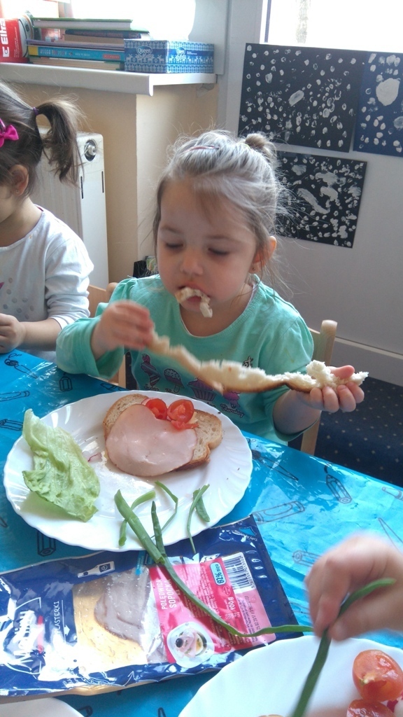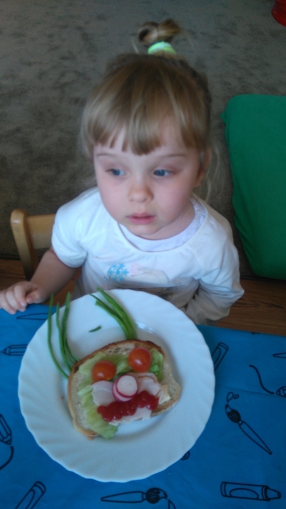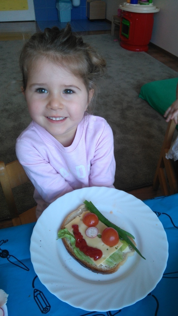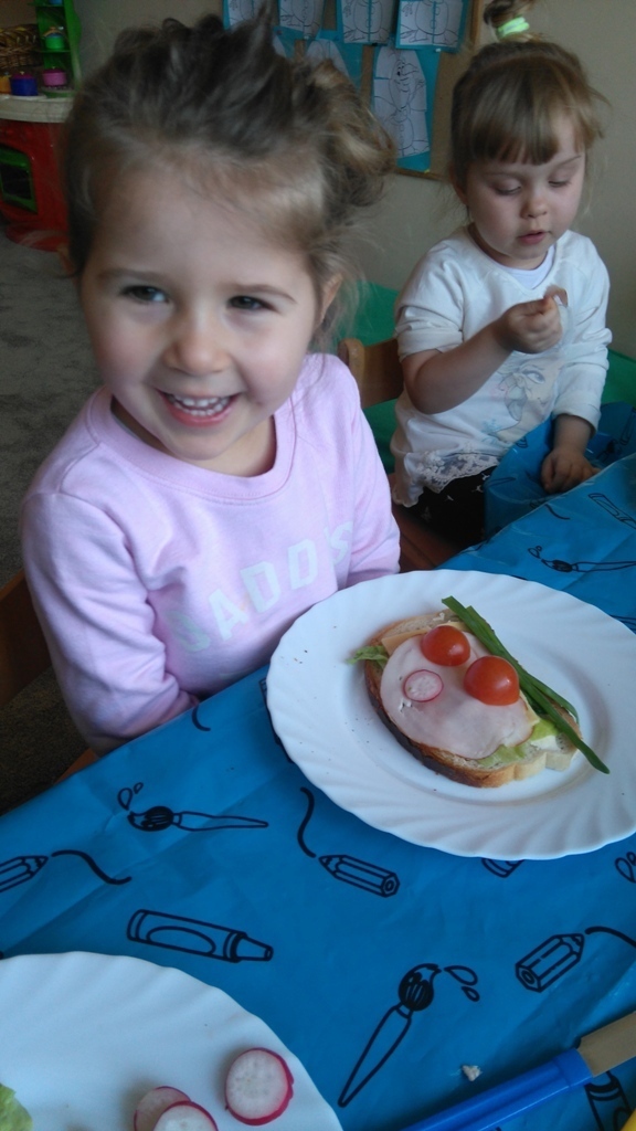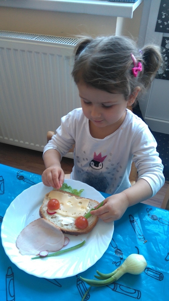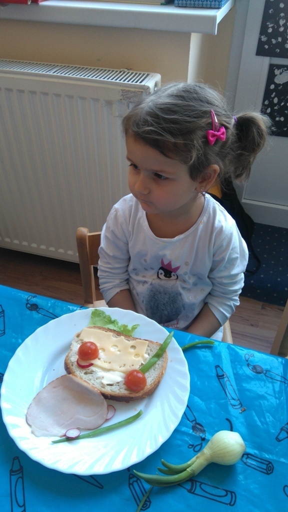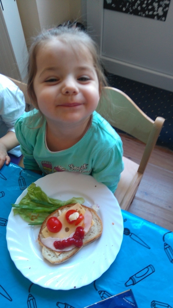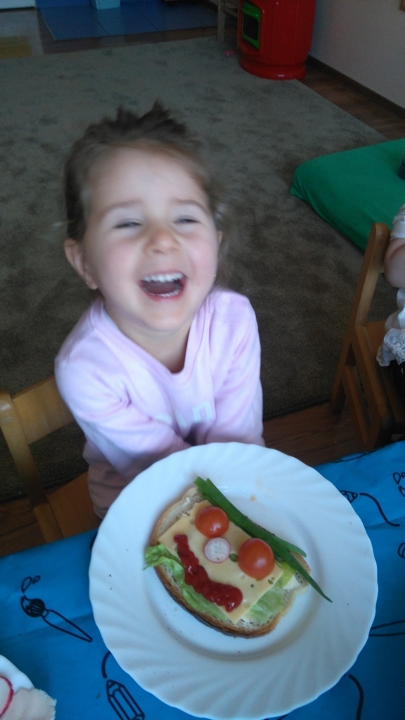 Dzisiejsze zajęcia były pyszne, ponieważ przygotowaliśmy na nich zwariowane kanapki, które możemy teraz robić razem ze swoimi rodzicami w domu na zabawę karnawałową, ponieważ od dziś potrafimy już to zrobić. Każdy z nas dostał potrzebne do wykonania zadania i mógł według własnych pomysłów stworzyć swojego, stworka, którego na koniec zajęć zjadł. Dzięki kanapeczkom mieliśmy okazję przypomnieć sobie wygląd i smak warzyw, a także spróbowaliśmy posmarować chleb masłem używając noża.