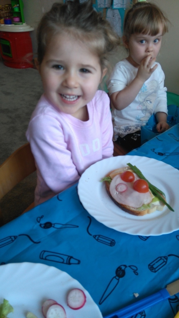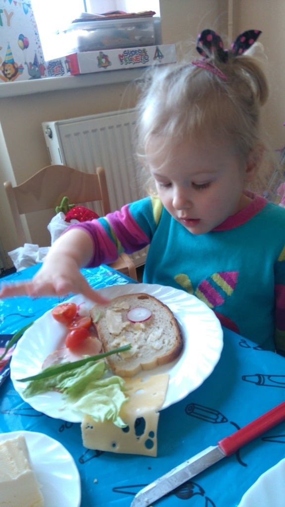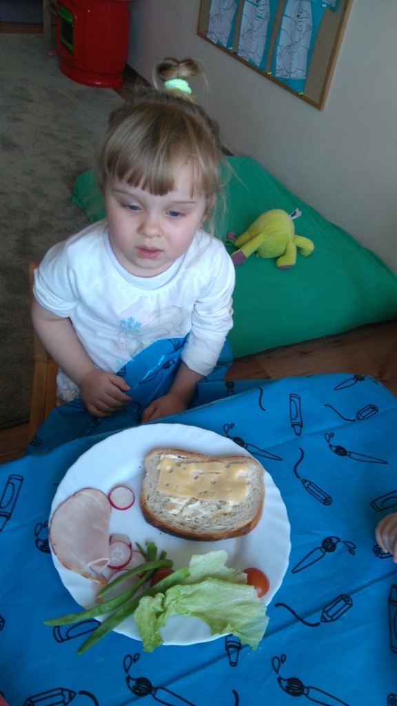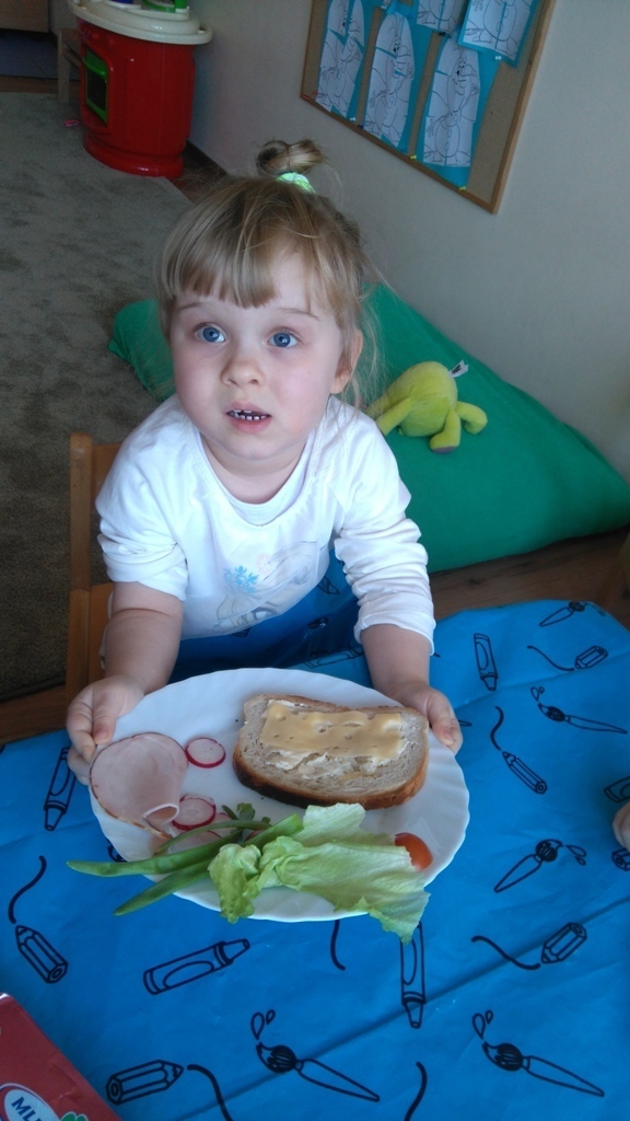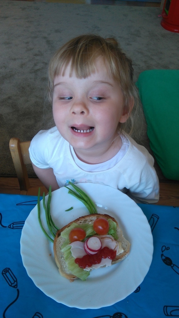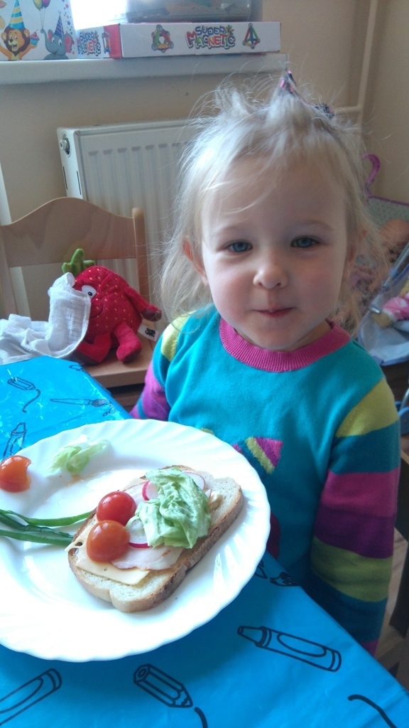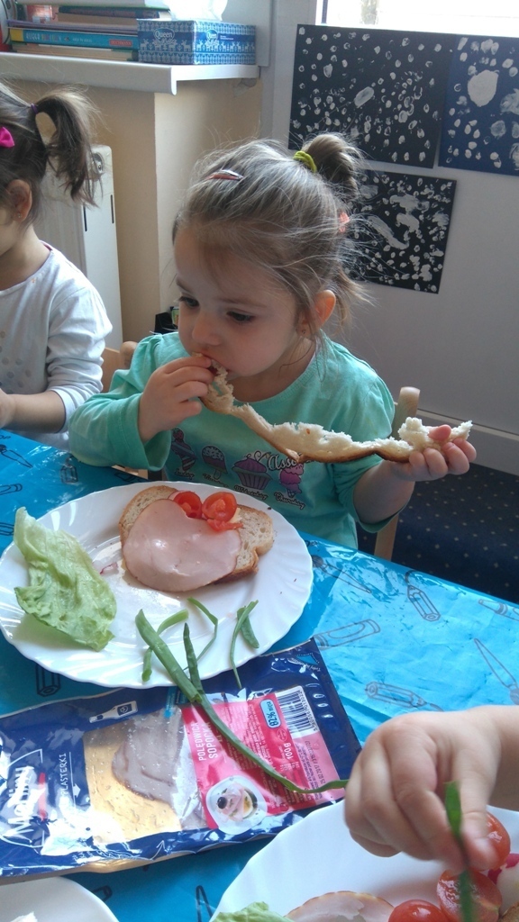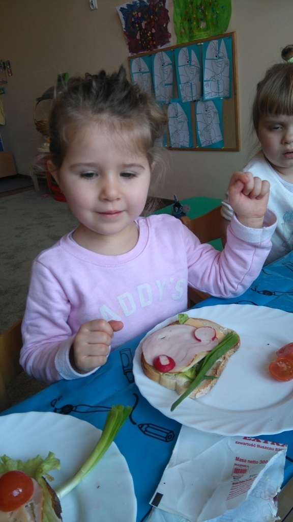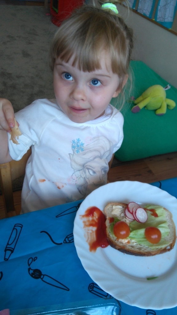 Dzisiejsze zajęcia były pyszne, ponieważ przygotowaliśmy na nich zwariowane kanapki, które możemy teraz robić razem ze swoimi rodzicami w domu na zabawę karnawałową, ponieważ od dziś potrafimy już to zrobić. Każdy z nas dostał potrzebne do wykonania zadania i mógł według własnych pomysłów stworzyć swojego, stworka, którego na koniec zajęć zjadł. Dzięki kanapeczkom mieliśmy okazję przypomnieć sobie wygląd i smak warzyw, a także spróbowaliśmy posmarować chleb masłem używając noża.