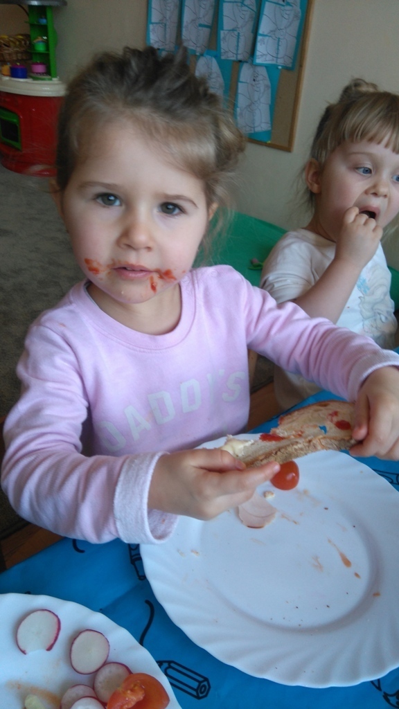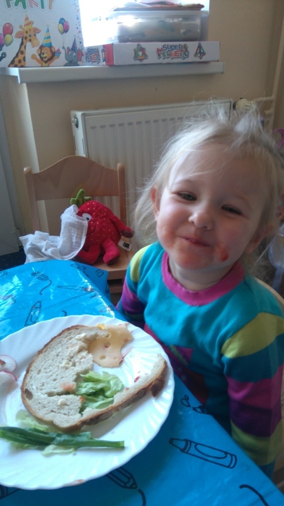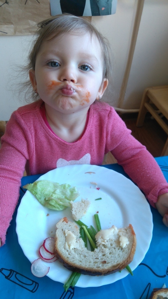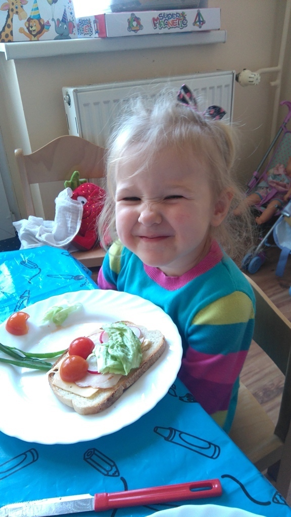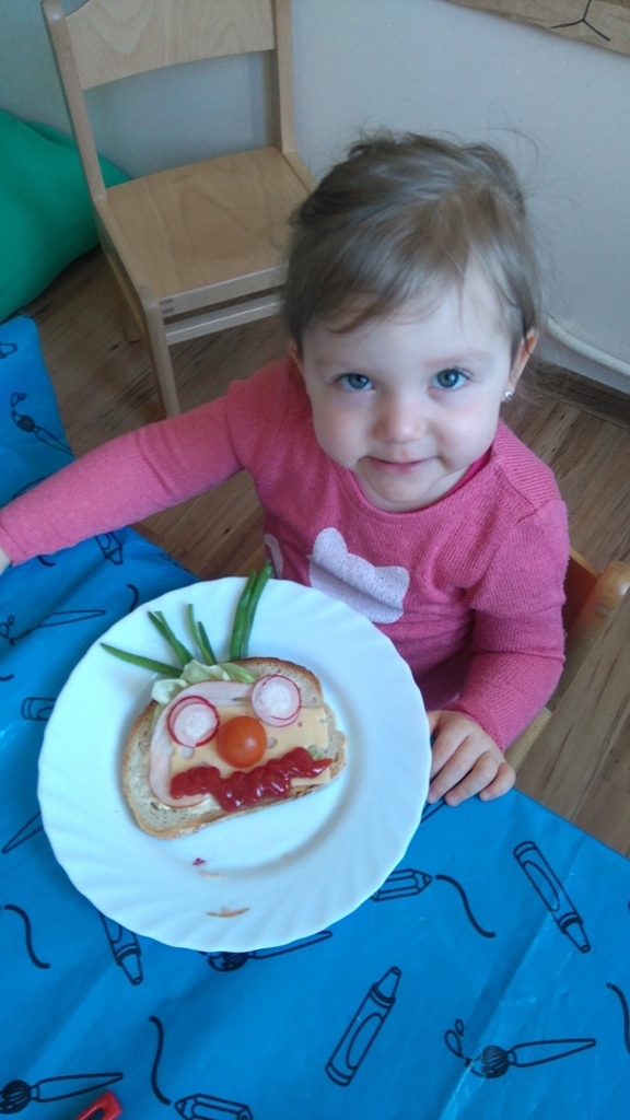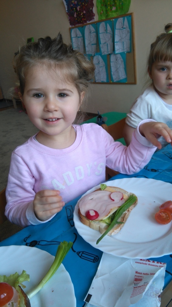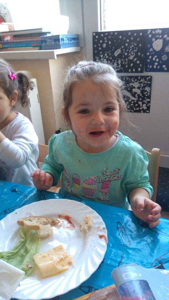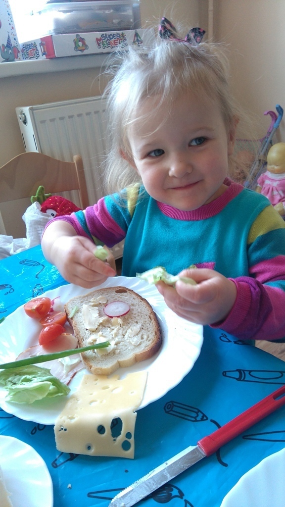 Dzisiejsze zajęcia były pyszne, ponieważ przygotowaliśmy na nich zwariowane kanapki, które możemy teraz robić razem ze swoimi rodzicami w domu na zabawę karnawałową, ponieważ od dziś potrafimy już to zrobić. Każdy z nas dostał potrzebne do wykonania zadania i mógł według własnych pomysłów stworzyć swojego, stworka, którego na koniec zajęć zjadł. Dzięki kanapeczkom mieliśmy okazję przypomnieć sobie wygląd i smak warzyw, a także spróbowaliśmy posmarować chleb masłem używając noża.