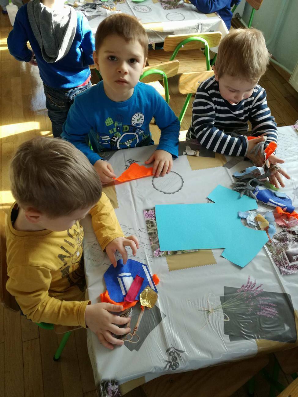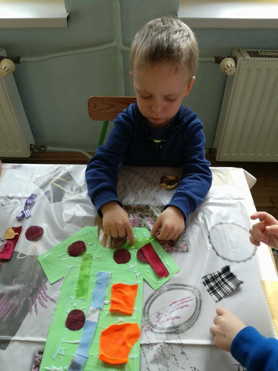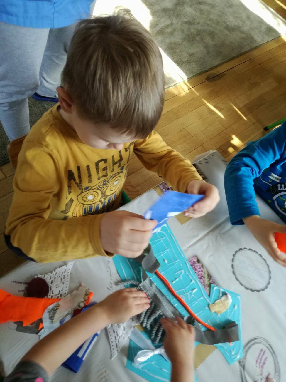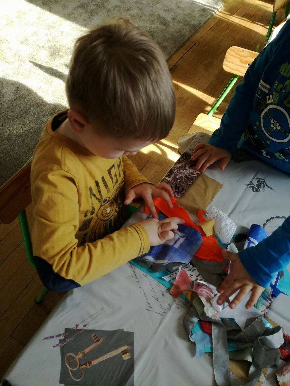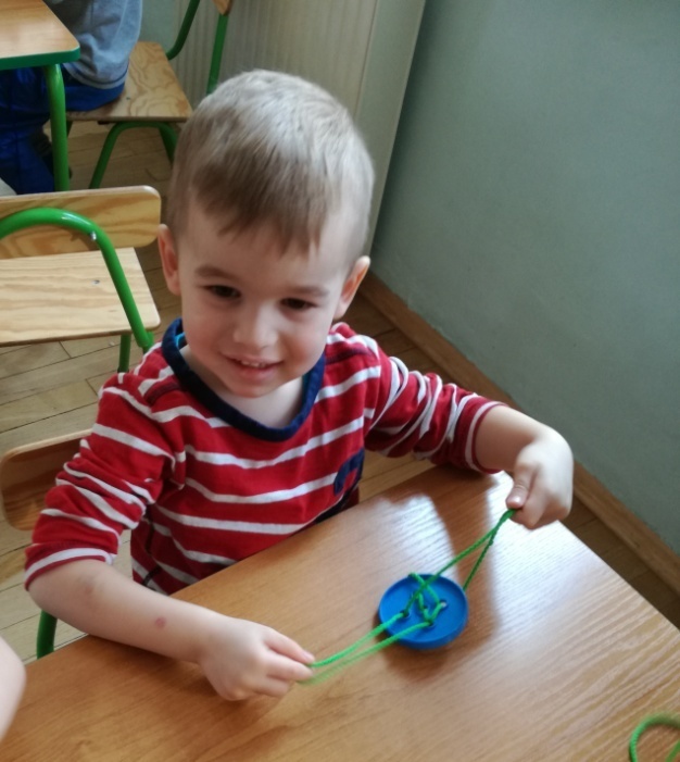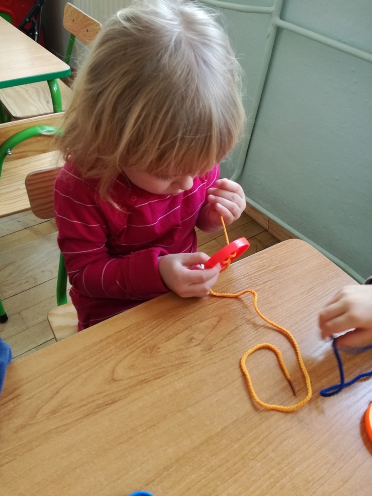 W tym dniu przyglądaliśmy się pracy pani krawcowej, oglądając prezentację przygotowaną przez panią Dominikę. Dowiedzieliśmy się, że pani krawcowa potrzebuje do swojej pracy bardzo dużo przyborów, przede wszystkim: maszyny do szycia, nożyczek, igieł, różnego koloru nici, guzików, itp. Poznaliśmy etapy powstawania ubrań. Próbowaliśmy również przewlec nitkę w postaci sznureczka przez dziurki w dużych guzikach. W grupach zaprojektowaliśmyy sukienki oraz koszulki z różnego rodzaju materiałów. Zajęcia miały na celu poznanie pracy krawcowej oraz narzędzi potrzebnych do pracy, etapów powstawania ubrań oraz rozwijanie sprawności manualnych i inwencji twórczej.