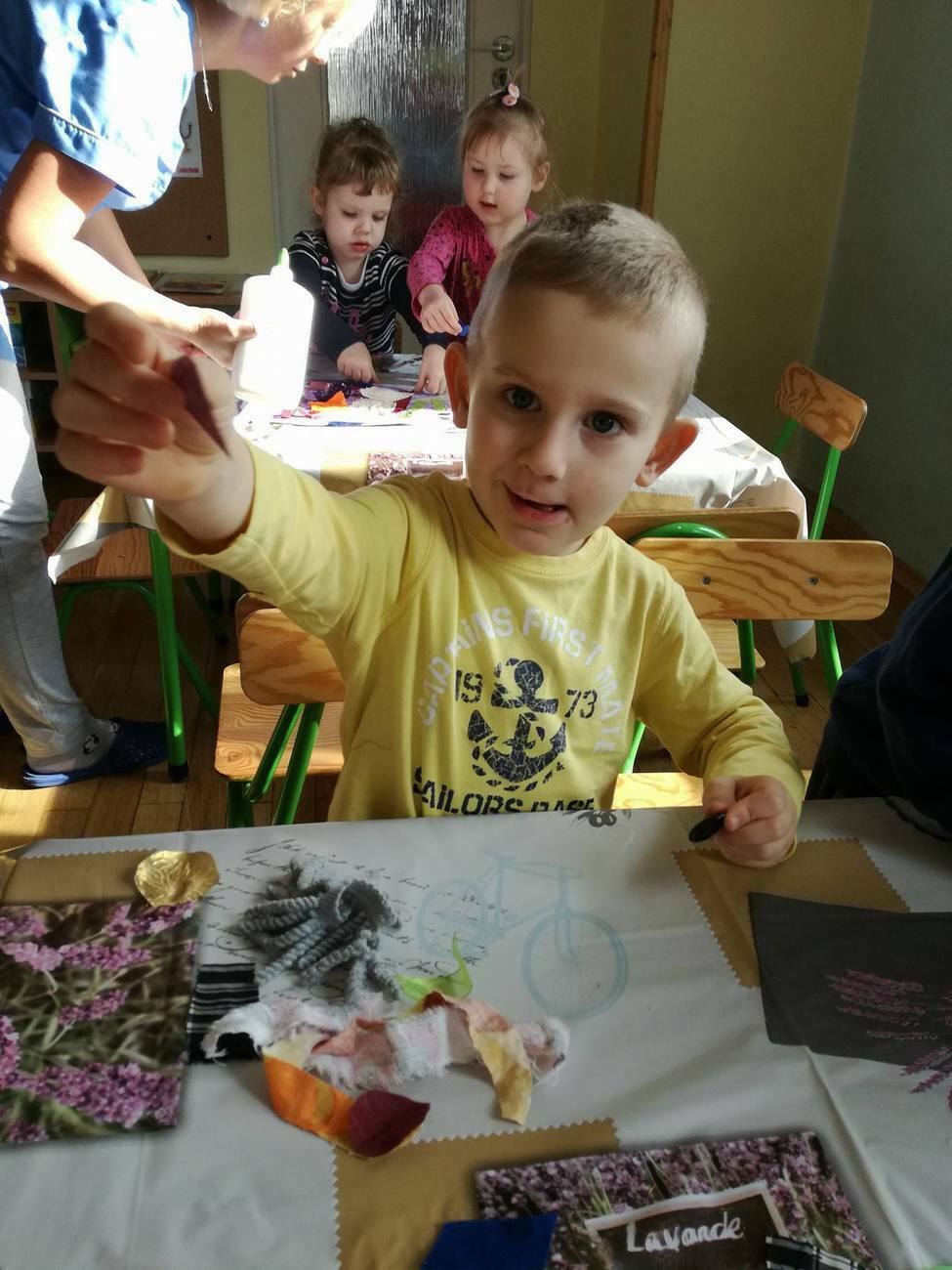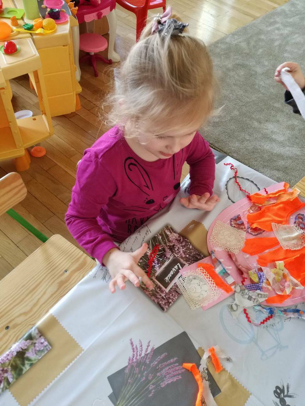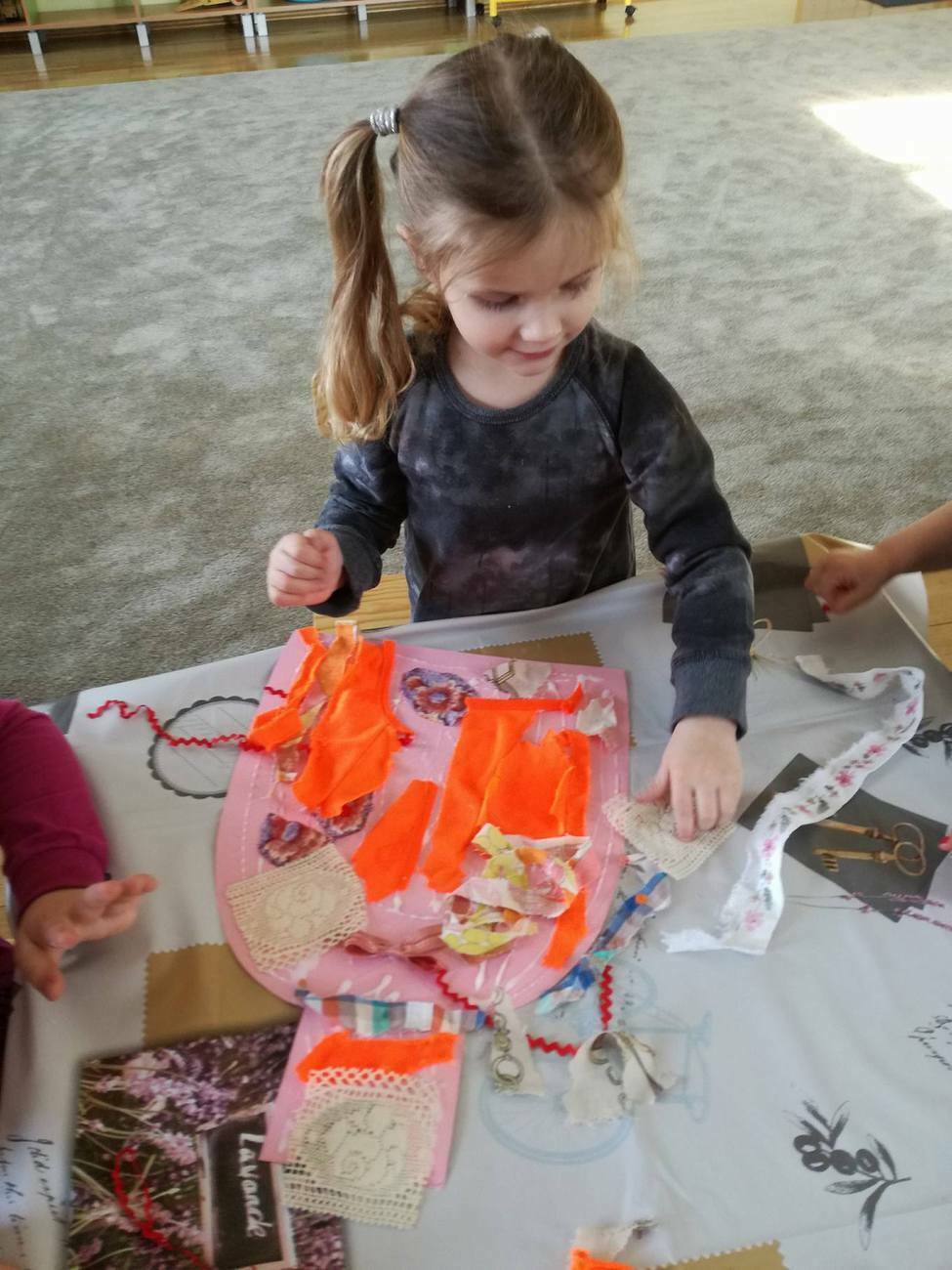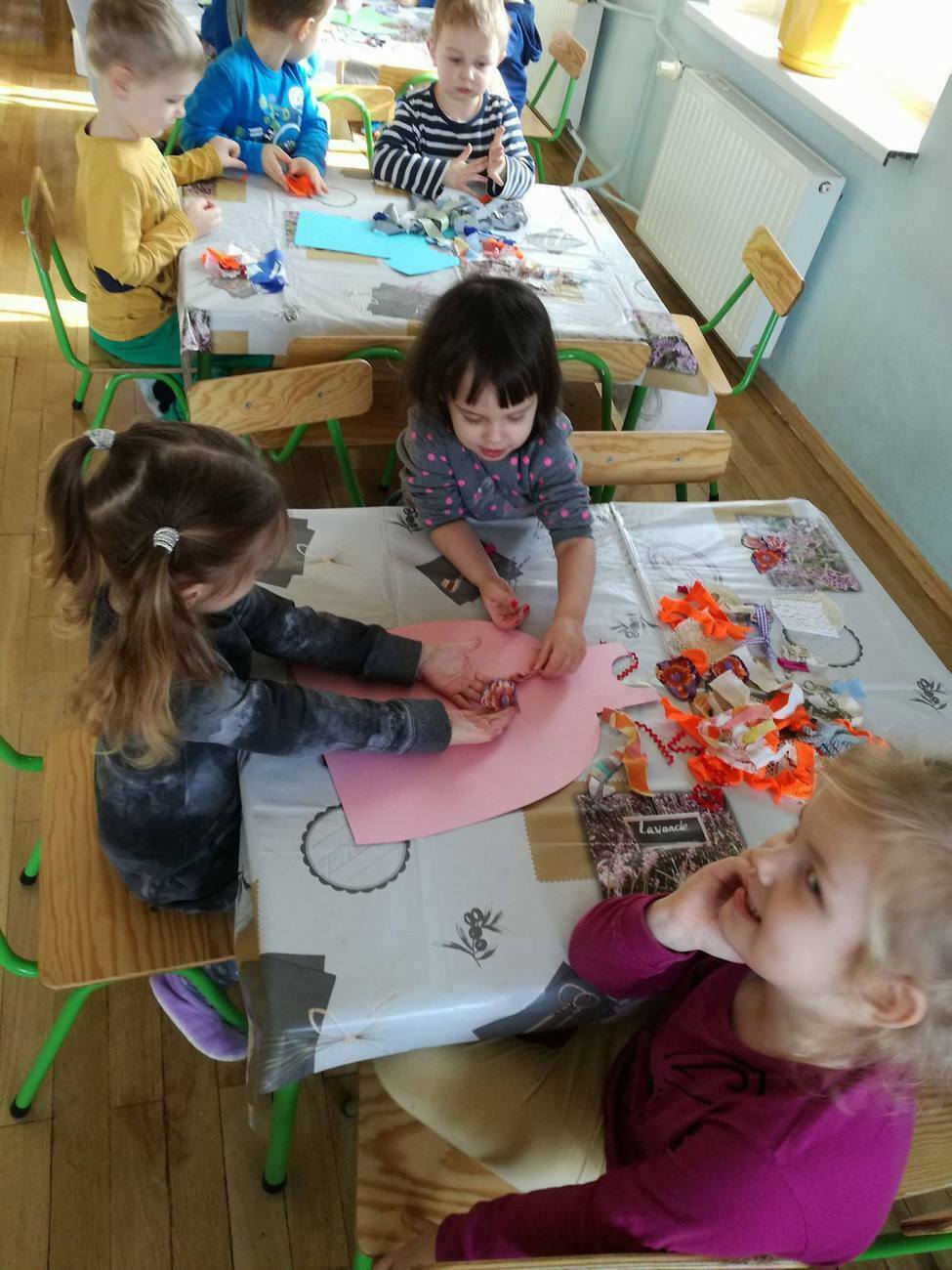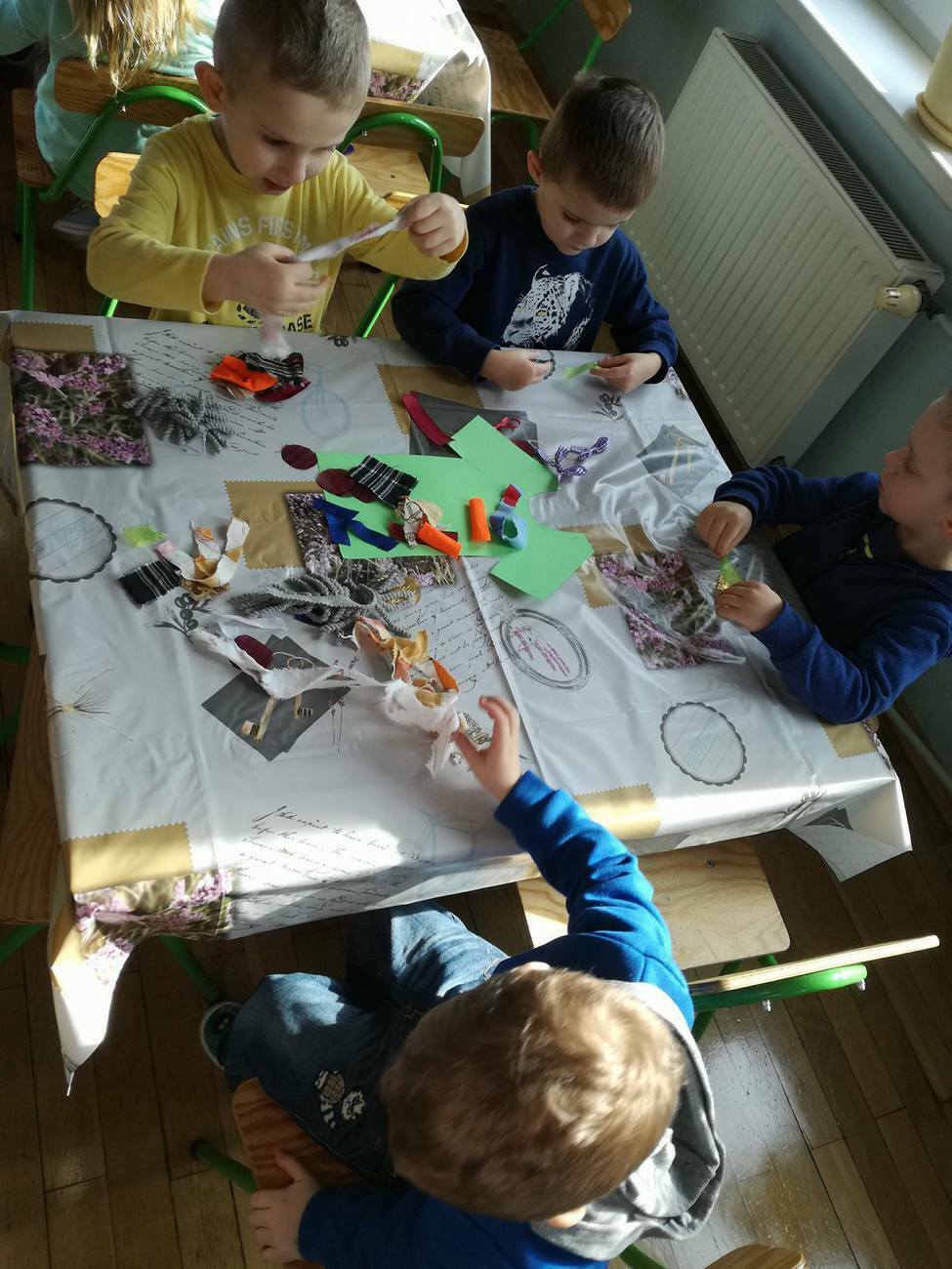 W tym dniu przyglądaliśmy się pracy pani krawcowej, oglądając prezentację przygotowaną przez panią Dominikę. Dowiedzieliśmy się, że pani krawcowa potrzebuje do swojej pracy bardzo dużo przyborów, przede wszystkim: maszyny do szycia, nożyczek, igieł, różnego koloru nici, guzików, itp. Poznaliśmy etapy powstawania ubrań. Próbowaliśmy również przewlec nitkę w postaci sznureczka przez dziurki w dużych guzikach. W grupach zaprojektowaliśmyy sukienki oraz koszulki z różnego rodzaju materiałów. Zajęcia miały na celu poznanie pracy krawcowej oraz narzędzi potrzebnych do pracy, etapów powstawania ubrań oraz rozwijanie sprawności manualnych i inwencji twórczej.