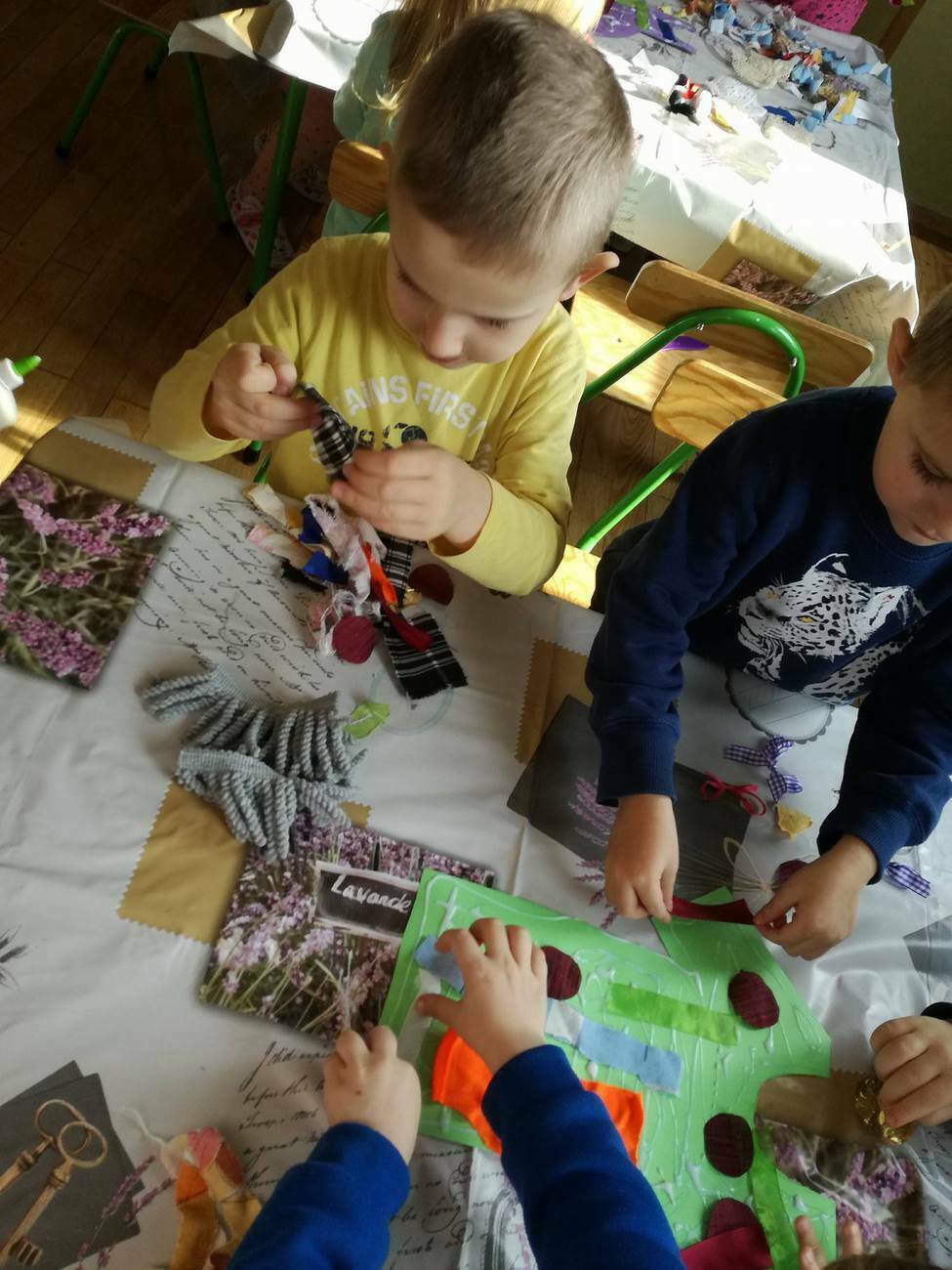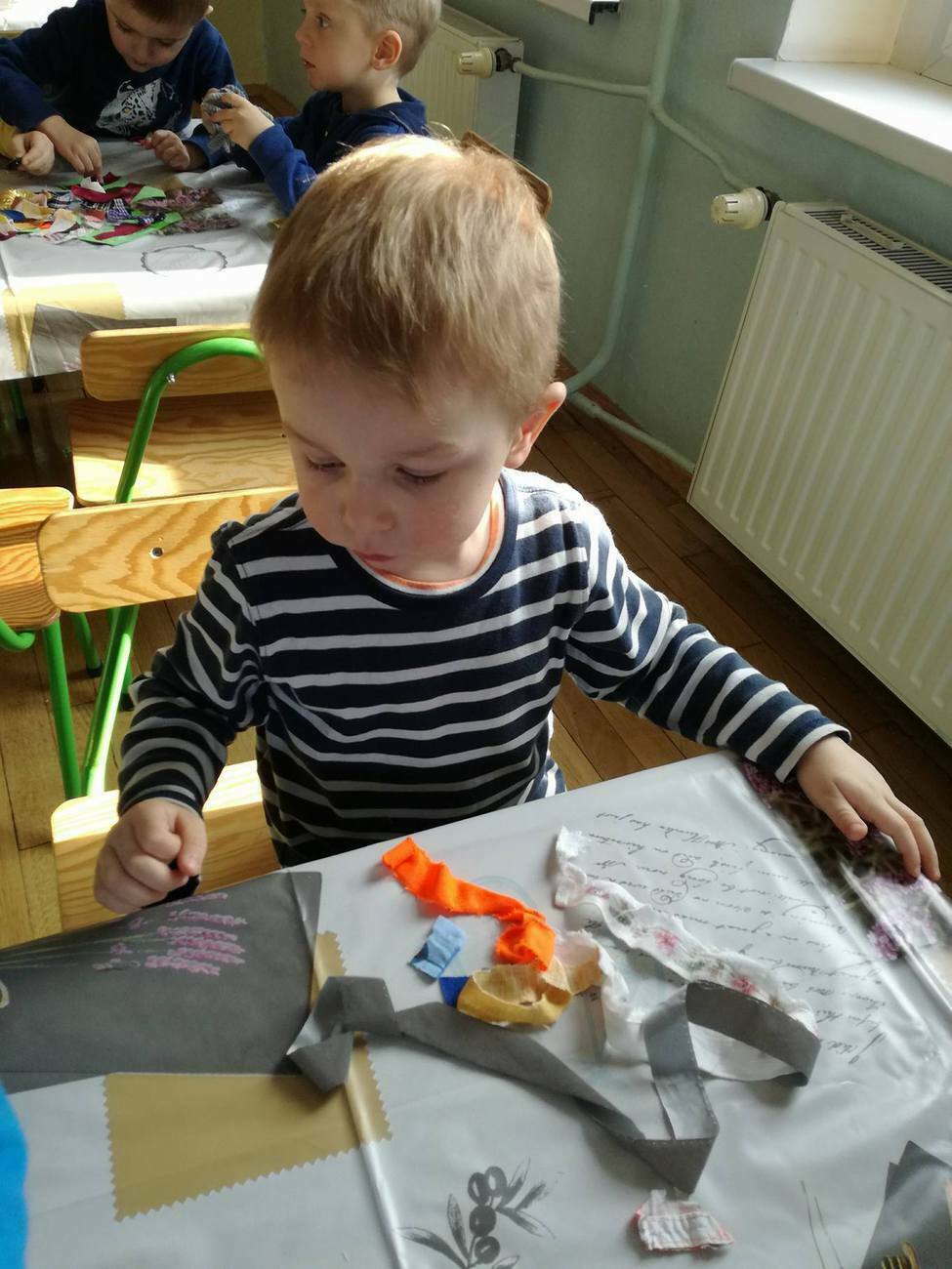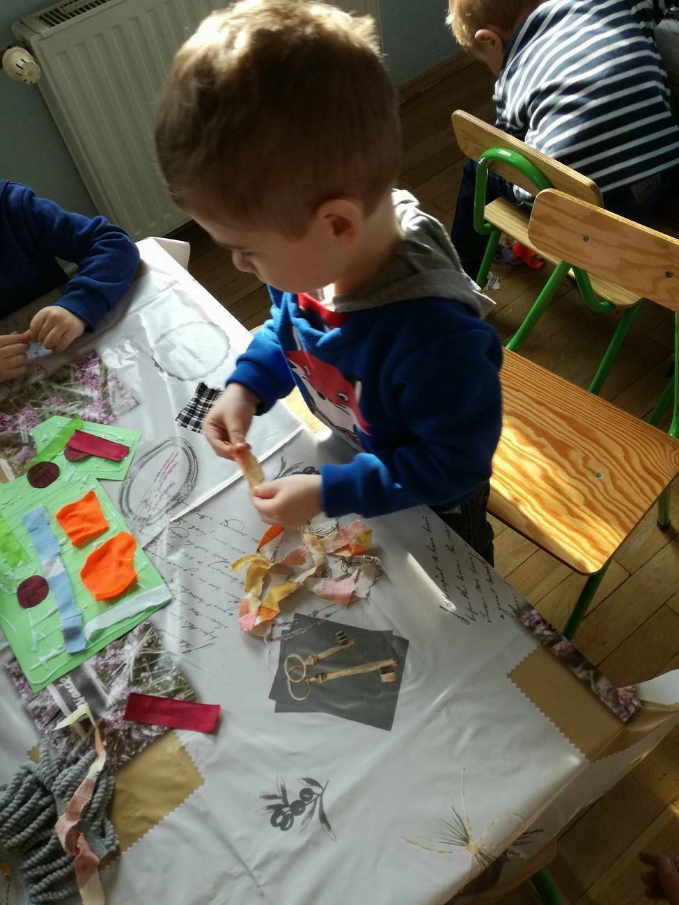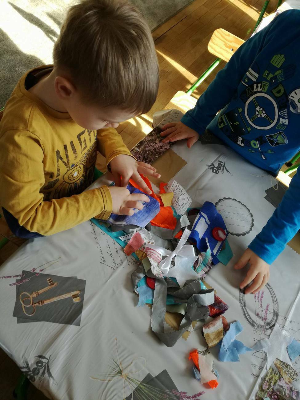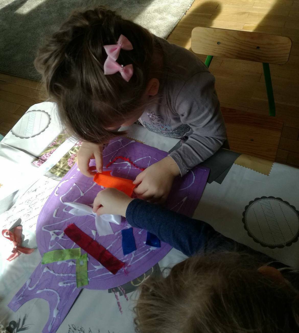 W tym dniu przyglądaliśmy się pracy pani krawcowej, oglądając prezentację przygotowaną przez panią Dominikę. Dowiedzieliśmy się, że pani krawcowa potrzebuje do swojej pracy bardzo dużo przyborów, przede wszystkim: maszyny do szycia, nożyczek, igieł, różnego koloru nici, guzików, itp. Poznaliśmy etapy powstawania ubrań. Próbowaliśmy również przewlec nitkę w postaci sznureczka przez dziurki w dużych guzikach. W grupach zaprojektowaliśmyy sukienki oraz koszulki z różnego rodzaju materiałów. Zajęcia miały na celu poznanie pracy krawcowej oraz narzędzi potrzebnych do pracy, etapów powstawania ubrań oraz rozwijanie sprawności manualnych i inwencji twórczej.