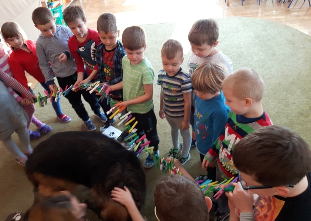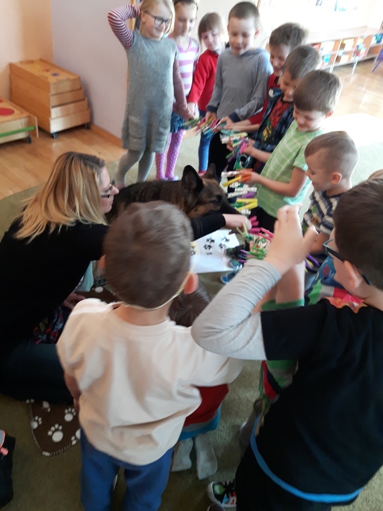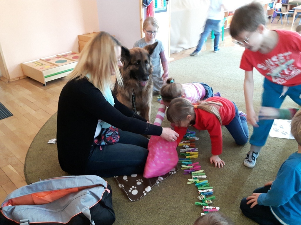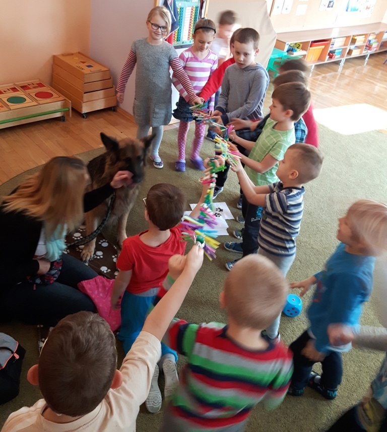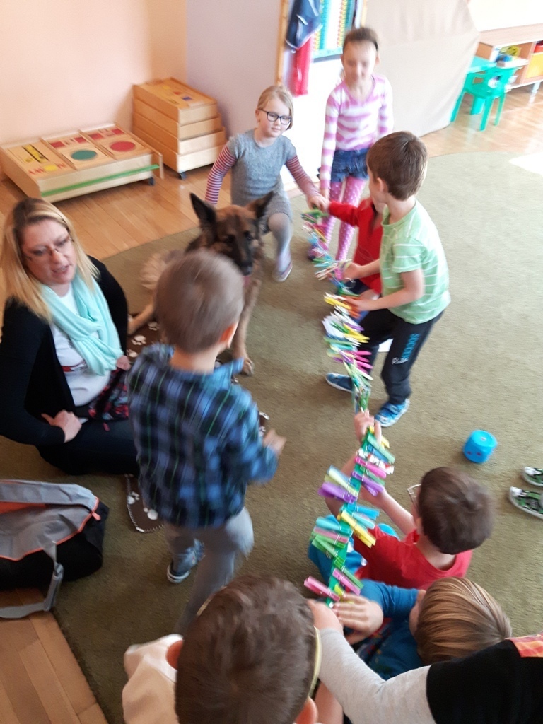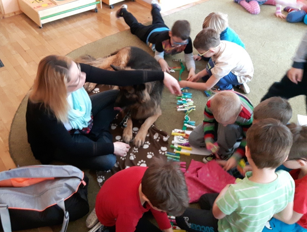 Zuchowa zabawa z Wandzią – psem terapeutą, to nowe ulubione zajęcie starszaków. Po przywitaniu, każde z dzieci miało za zadanie – przypomnienie zasad bezpieczeństwa na zajęciach z psem (zachowanie ciszy oraz zakaz dotykania i zbliżania się do psiego grona). Następnie Wandzia wraz ze swoją Pania zaproponowały zabawę w zdobieniu smyczy spinaczami. Jednak żeby nie było zbyt łatwo, każdy z Zuchów mógł przypinać tyle spinaczy ile wyrzucił uprzednio oczek na kostce. Więc prócz dobrej zabawy Zuchy miały możliwość doskonalenia umiejętności liczenia w zakresie do 6. Po zakończeniu zabawy z Wandzią dzieci mogły pogłaskać Wandzię i poprzytulać się do niej.
