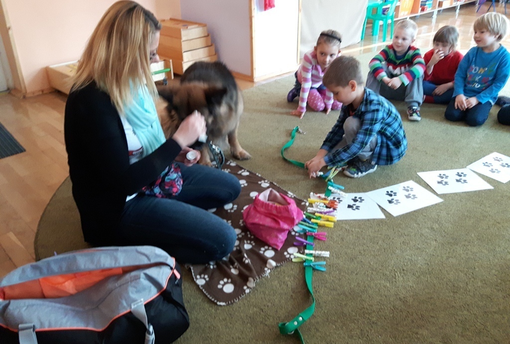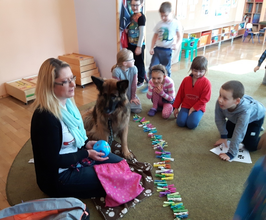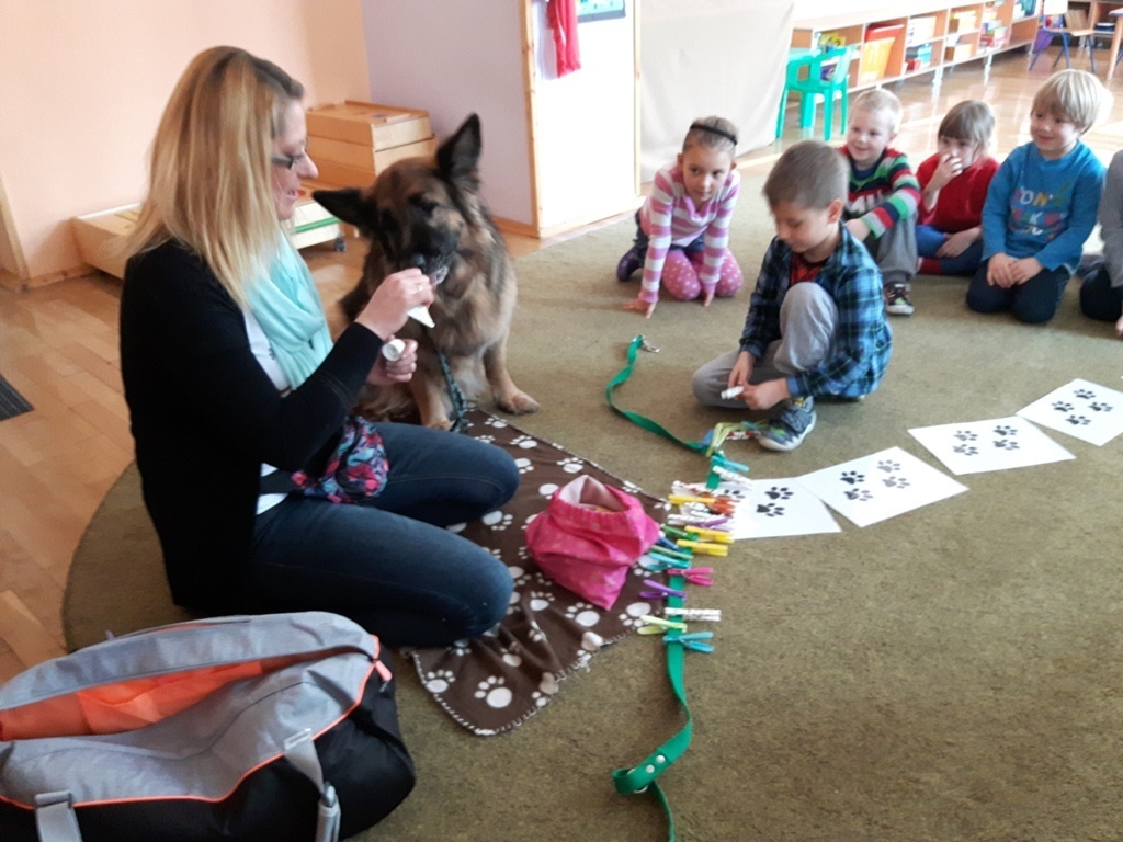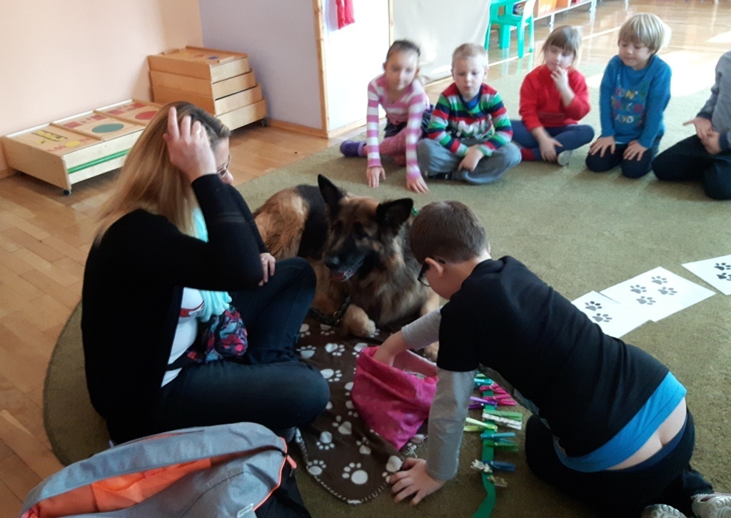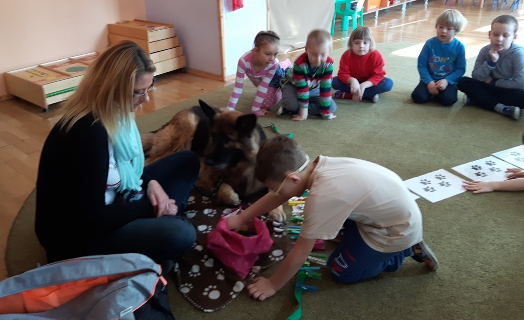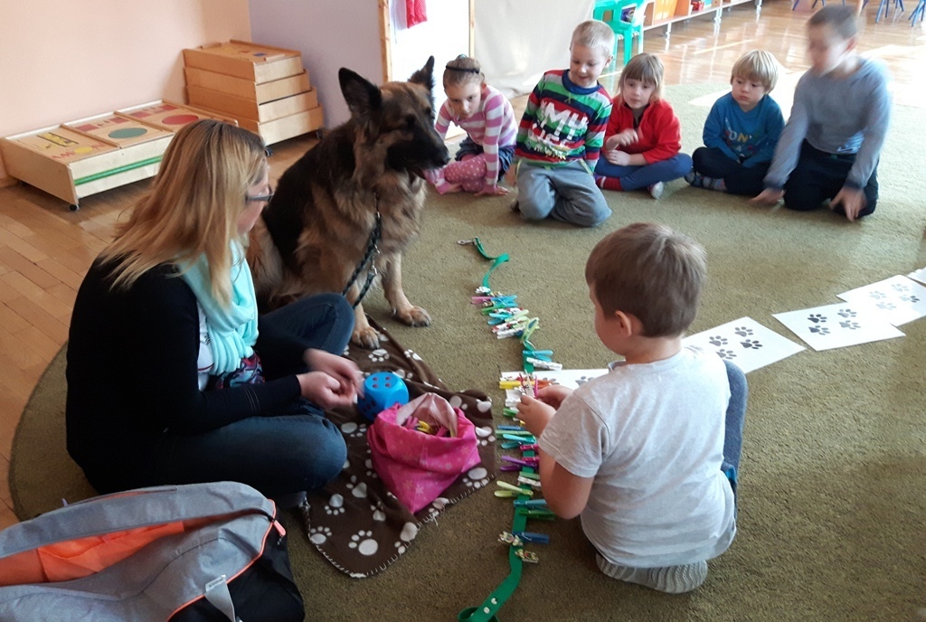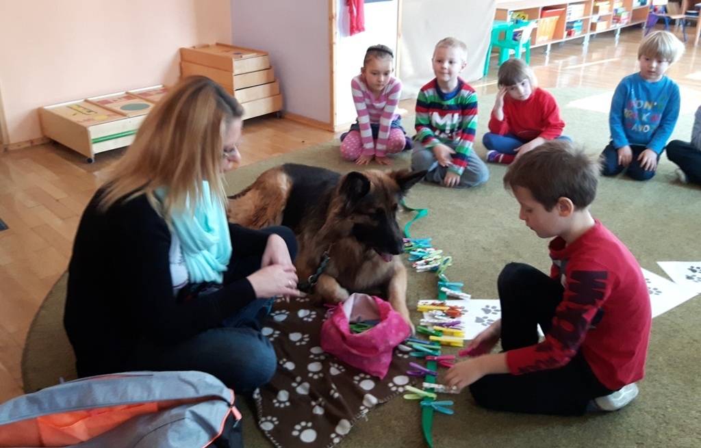 Zuchowa zabawa z Wandzią – psem terapeutą, to nowe ulubione zajęcie starszaków. Po przywitaniu, każde z dzieci miało za zadanie – przypomnienie zasad bezpieczeństwa na zajęciach z psem (zachowanie ciszy oraz zakaz dotykania i zbliżania się do psiego grona). Następnie Wandzia wraz ze swoją Pania zaproponowały zabawę w zdobieniu smyczy spinaczami. Jednak żeby nie było zbyt łatwo, każdy z Zuchów mógł przypinać tyle spinaczy ile wyrzucił uprzednio oczek na kostce. Więc prócz dobrej zabawy Zuchy miały możliwość doskonalenia umiejętności liczenia w zakresie do 6. Po zakończeniu zabawy z Wandzią dzieci mogły pogłaskać Wandzię i poprzytulać się do niej.