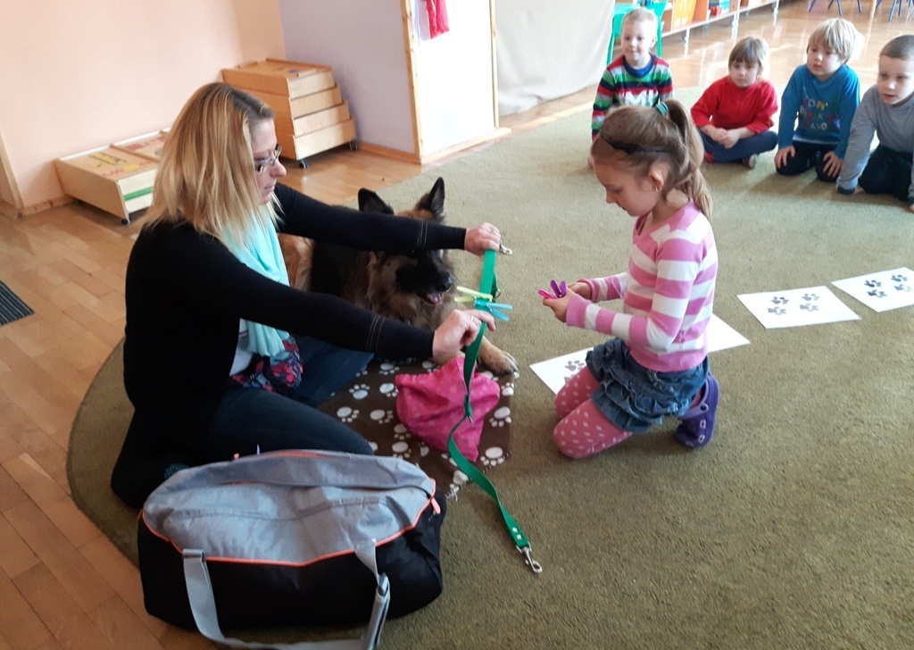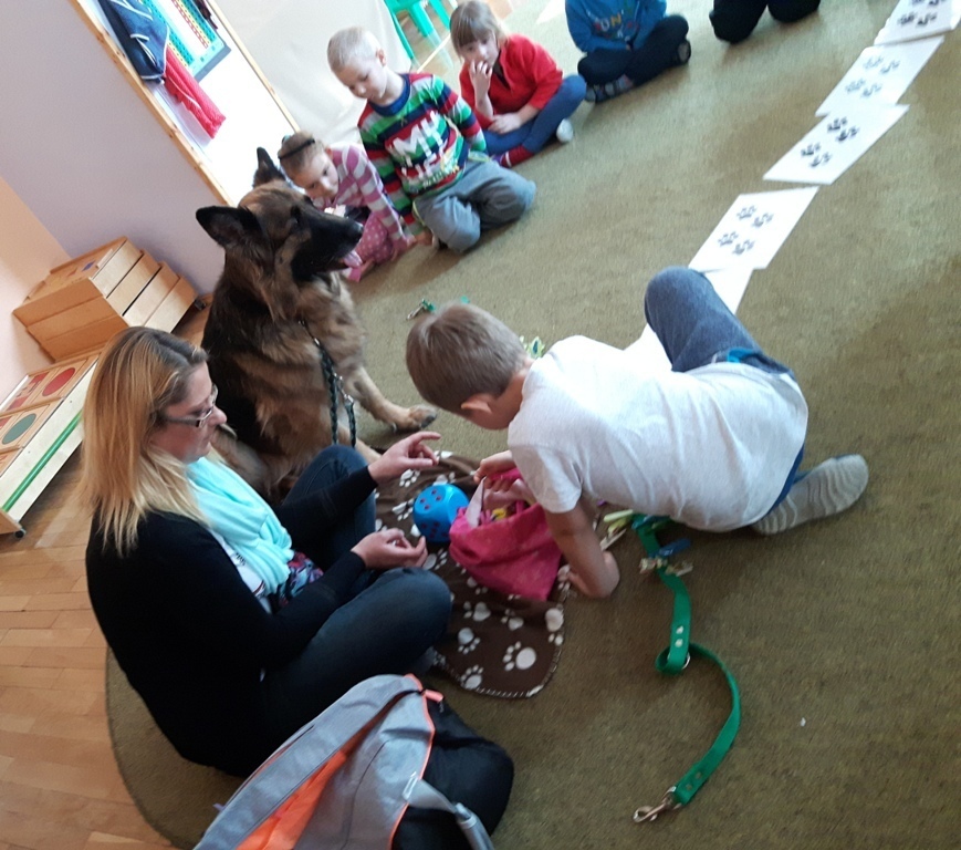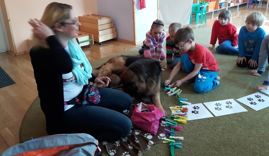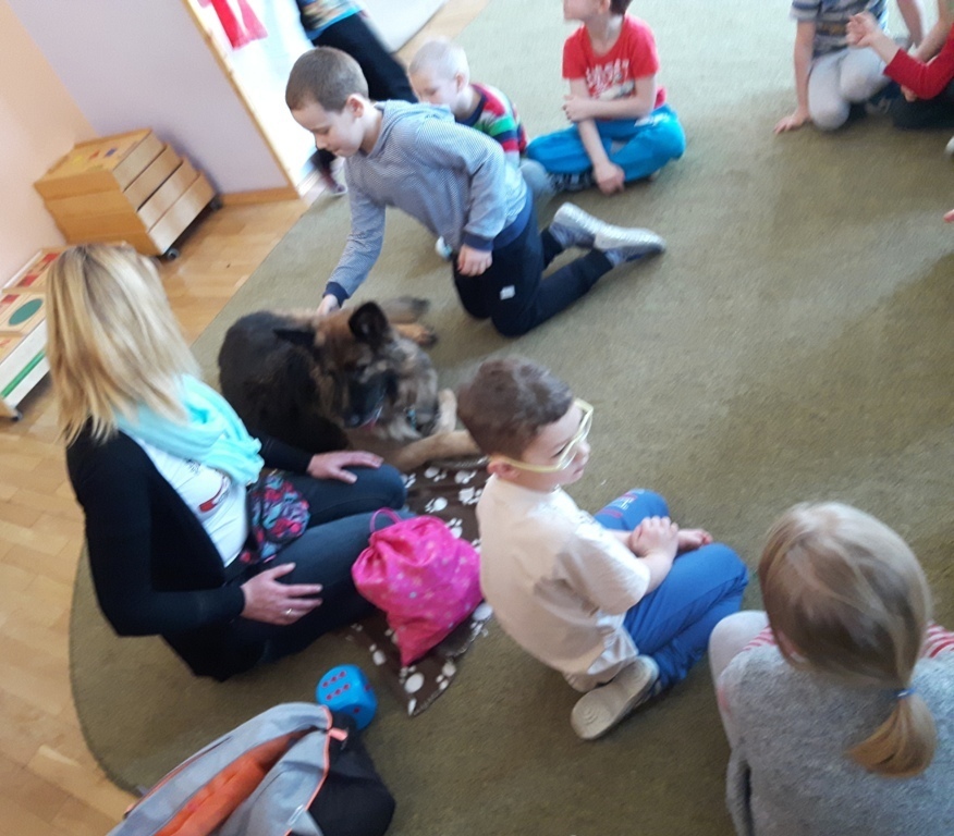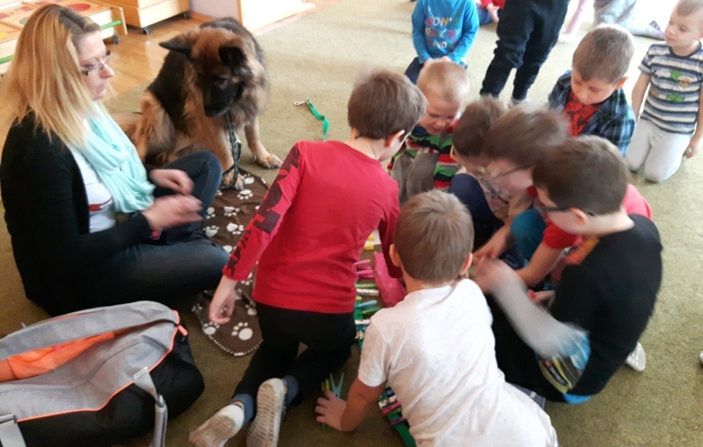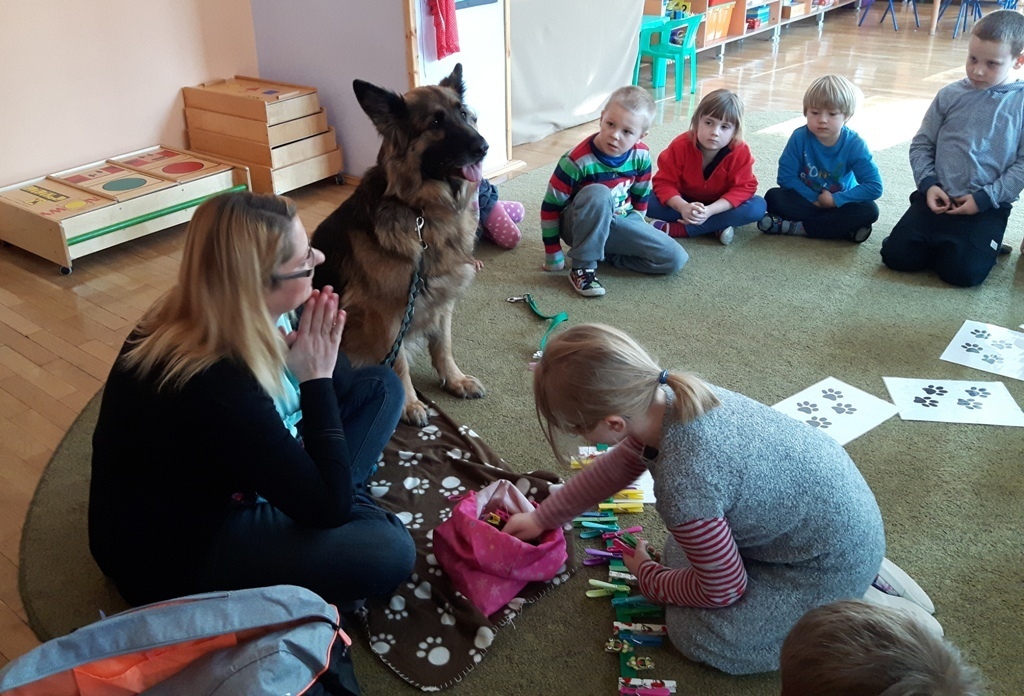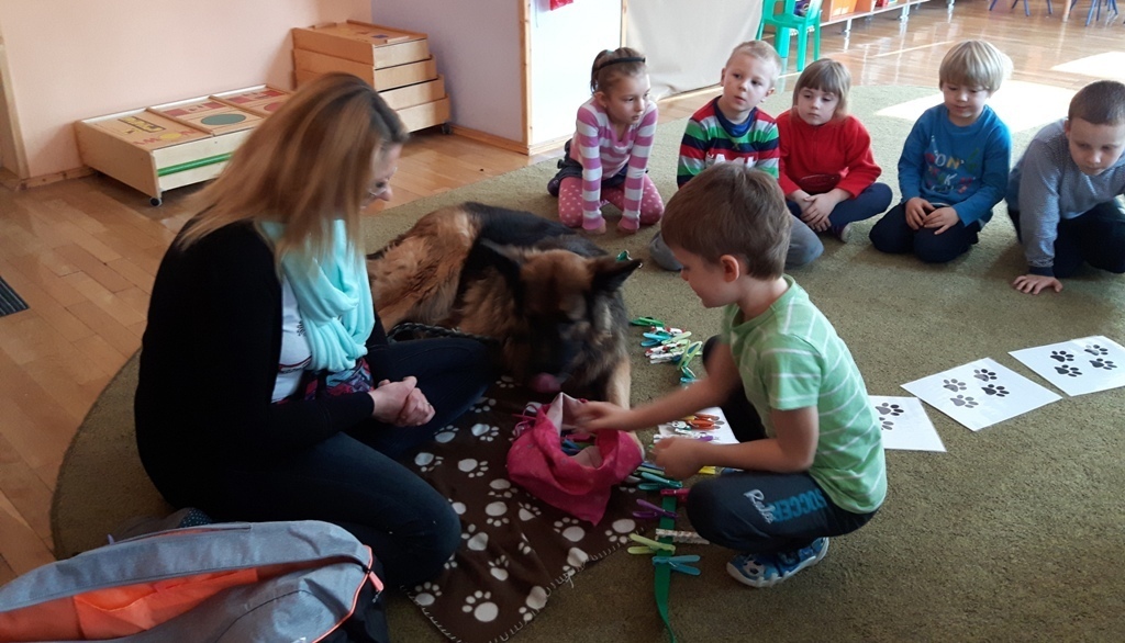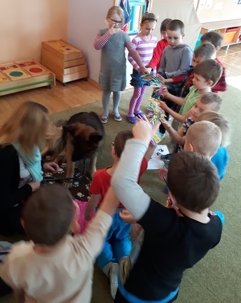 Zuchowa zabawa z Wandzią – psem terapeutą, to nowe ulubione zajęcie starszaków. Po przywitaniu, każde z dzieci miało za zadanie – przypomnienie zasad bezpieczeństwa na zajęciach z psem (zachowanie ciszy oraz zakaz dotykania i zbliżania się do psiego grona). Następnie Wandzia wraz ze swoją Pania zaproponowały zabawę w zdobieniu smyczy spinaczami. Jednak żeby nie było zbyt łatwo, każdy z Zuchów mógł przypinać tyle spinaczy ile wyrzucił uprzednio oczek na kostce. Więc prócz dobrej zabawy Zuchy miały możliwość doskonalenia umiejętności liczenia w zakresie do 6. Po zakończeniu zabawy z Wandzią dzieci mogły pogłaskać Wandzię i poprzytulać się do niej.